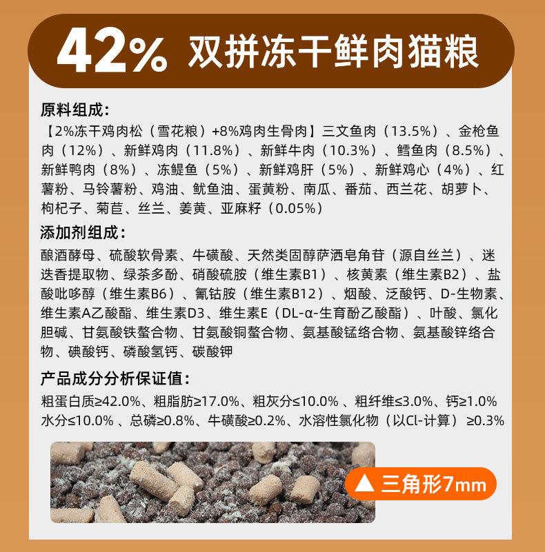 【Comida para Gato Liofilizada em Flocos de Carne Crua】42% de proteína bruta, 8% de carne e osso crus liofilizados, partículas triangulares de 7mm. Nêmesis de gatos exigentes, liofilizado combinado com comida para gato, rico em sabor e alto em nutrição, produzido por uma fábrica forte, satisfaz a natureza carnívora do gato.
