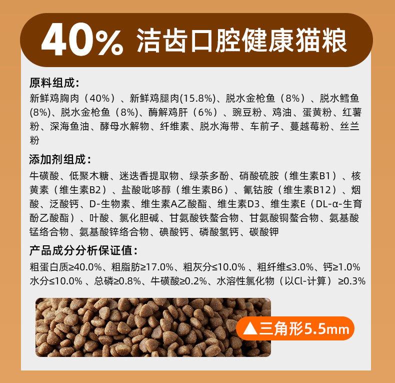 【Ração para Saúde Oral para Gatos】40% de proteína bruta, polifenóis de chá verde especialmente adicionados, 0% de grãos + frango fresco, grânulos triangulares de 5,5 mm. Protege a saúde oral do gato, fórmula hipoalergênica é mais segura, fabricada por uma fábrica forte, para que os gatos comam de forma saudável e protejam seus dentes.