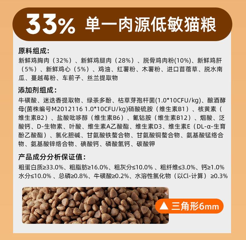 【Ração de Frango Monoproteica para Gatos】33% Proteína Bruta, 20 Bilhões de Probióticos Ativos, Ração Triangular de 7mm. Hipoalergênica e de Fácil Absorção, Fonte de Proteína Única Reduz Alergias, Fabricada por uma Fábrica Forte, Fornece Nutrição Suave para Gatos.