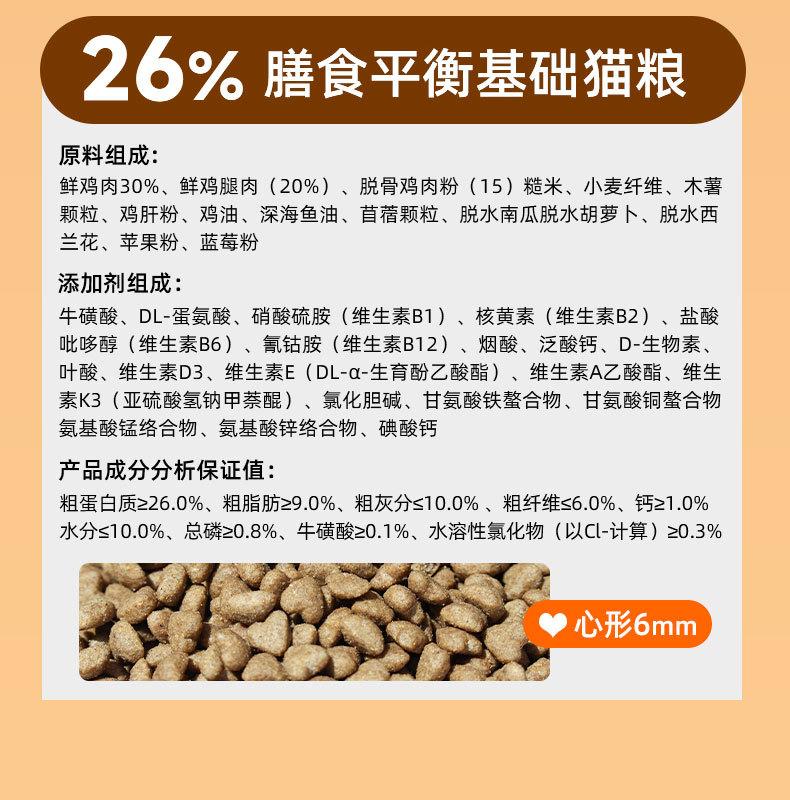 【Ração para Gatos com Fibra Dietética de Frutas e Vegetais】26% de proteína bruta, rico em fibras de frutas e vegetais, grânulos em forma de coração de 6mm. Fórmula dieteticamente equilibrada, suplementa as fibras necessárias aos gatos, garantida por uma fábrica forte, tornando a dieta do gato mais equilibrada.