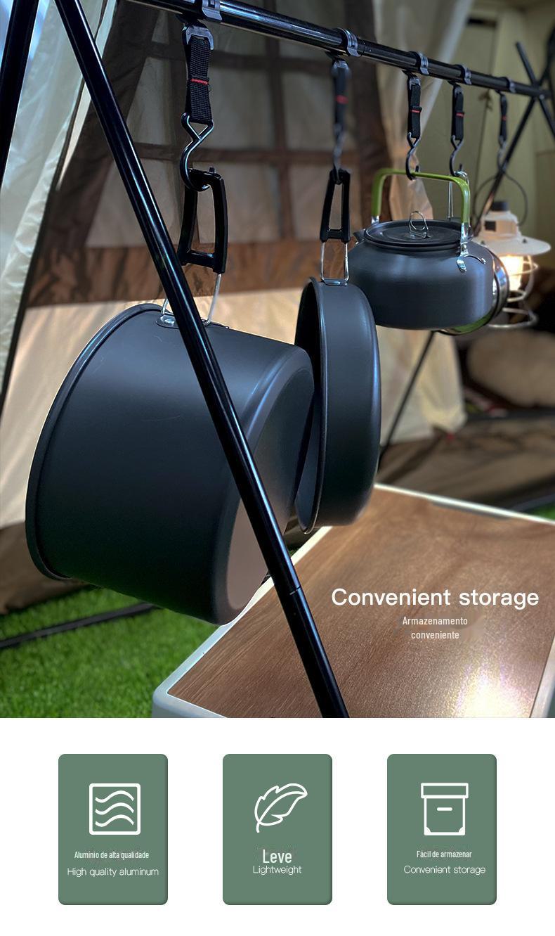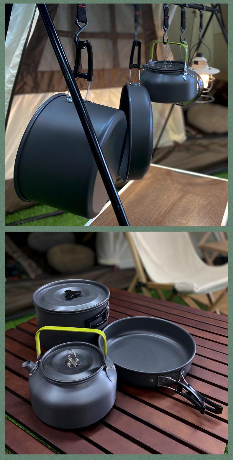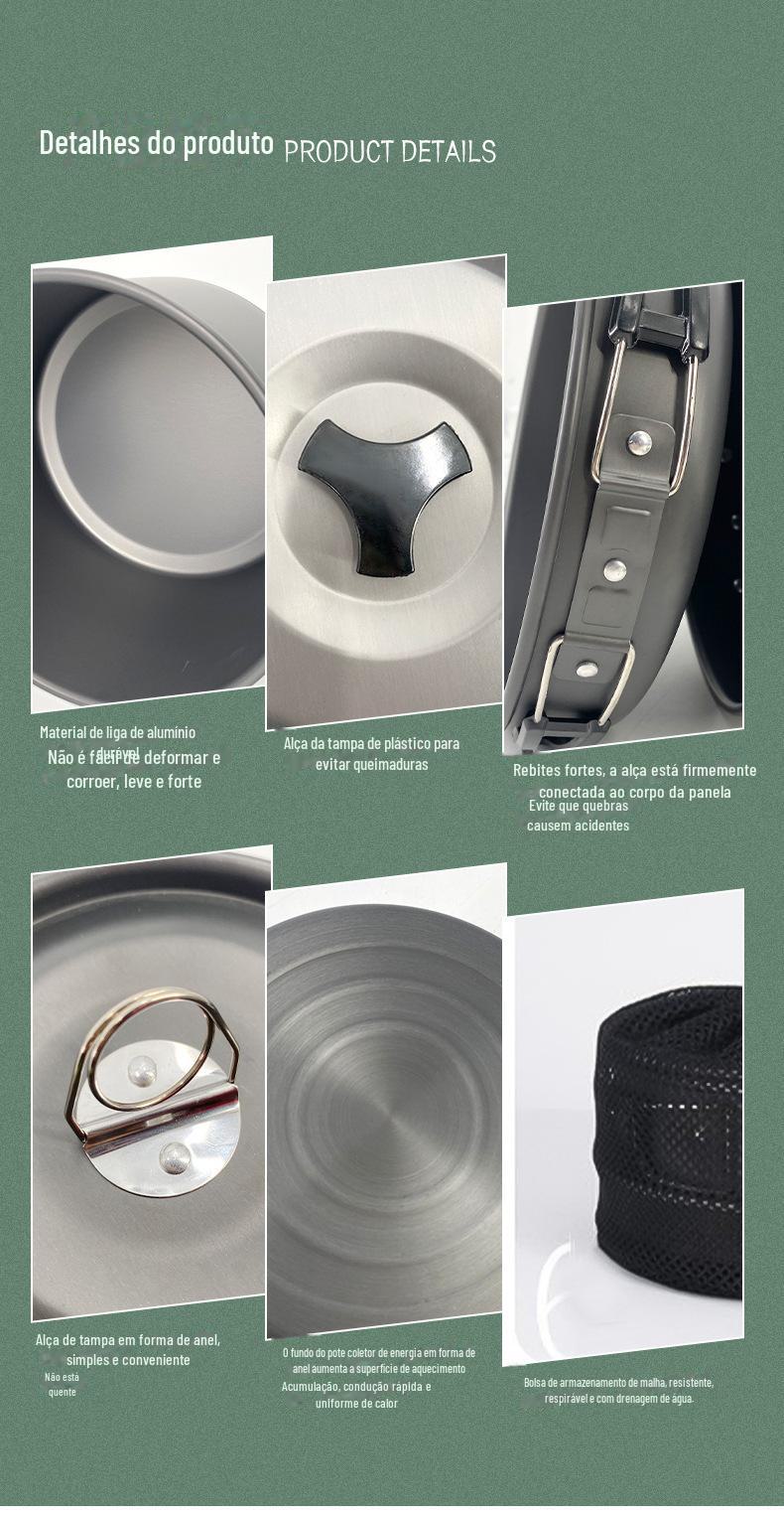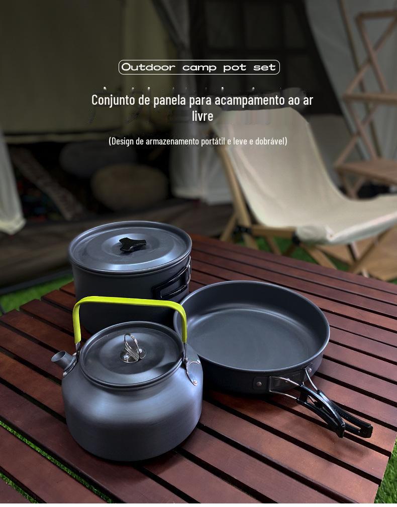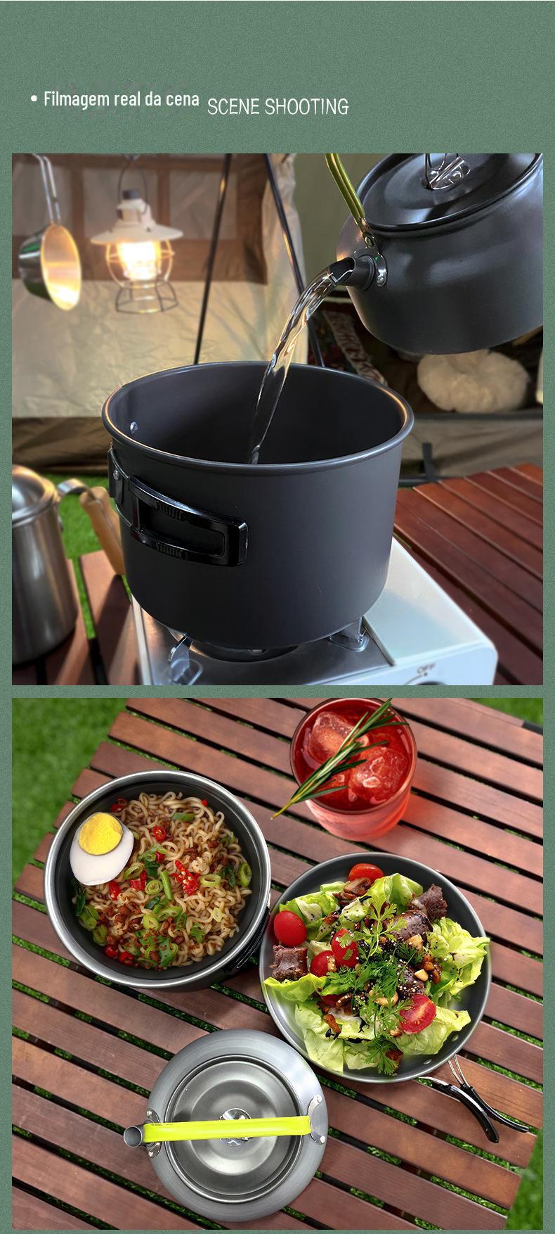 Inclui: panela suspensa*1 panela média*1 bule*1 frigideira*1 prato de plástico*1 bacia de sopa*1 tigela de plástico*6 colheres de sopa*1 espátula de arroz*1 bucha