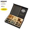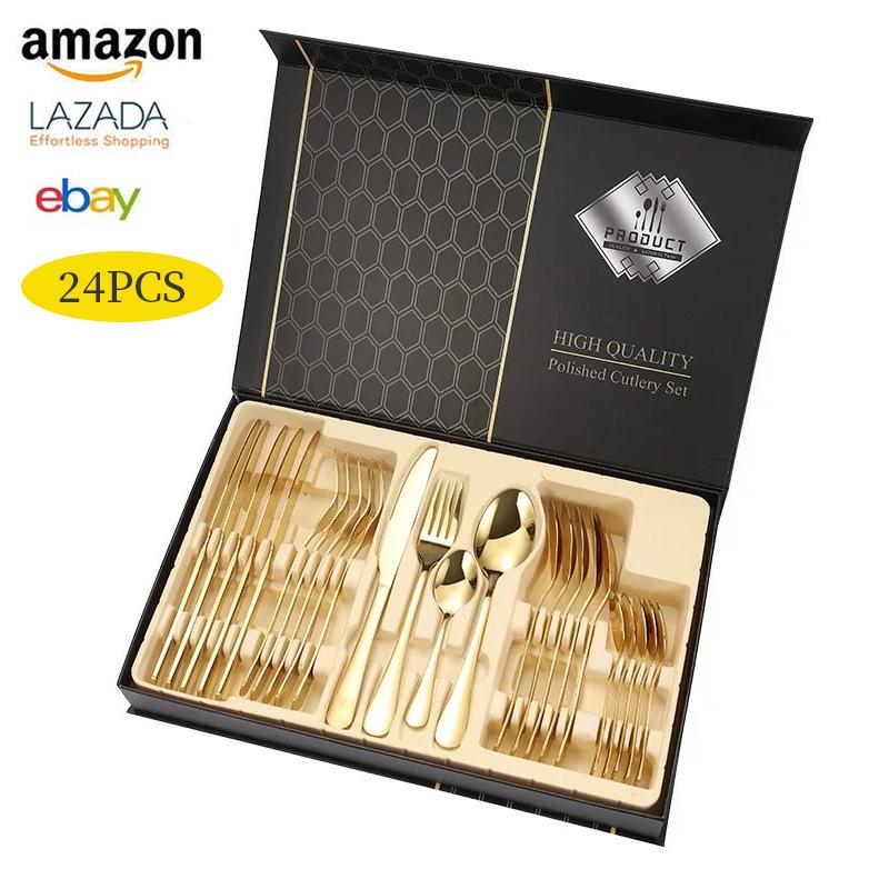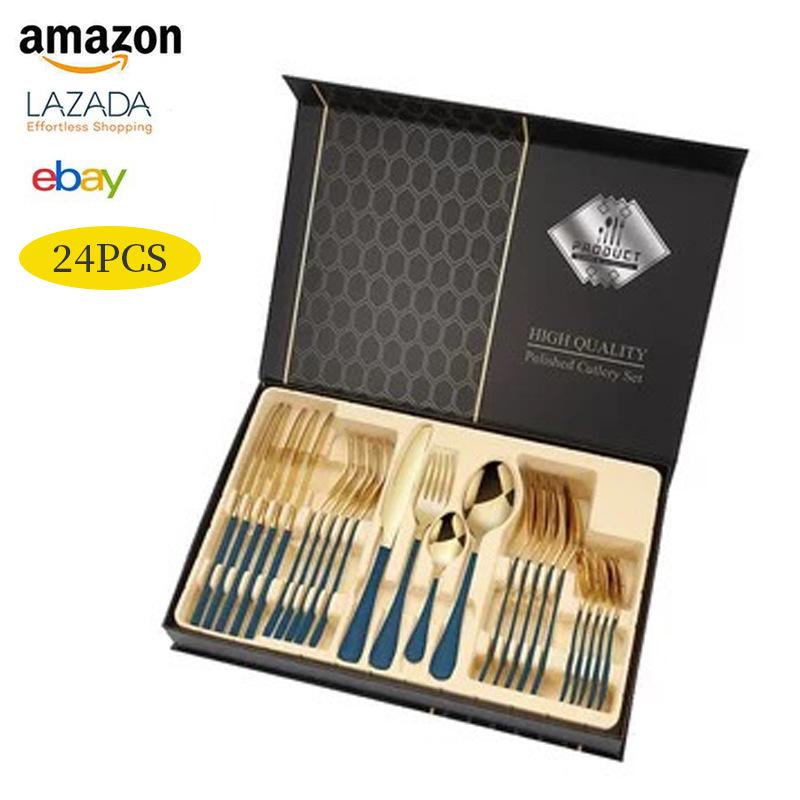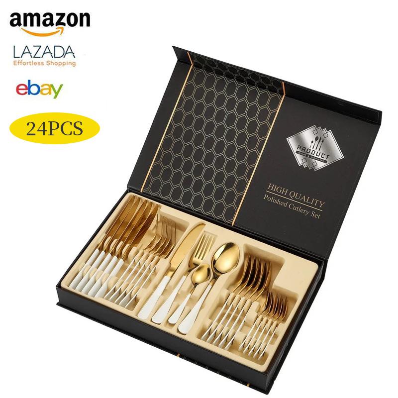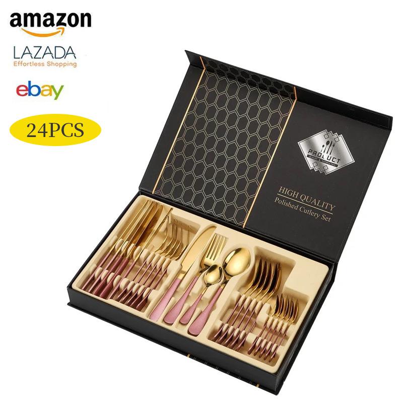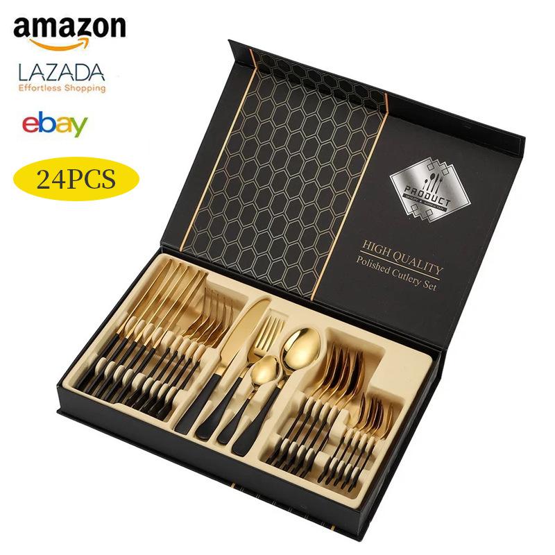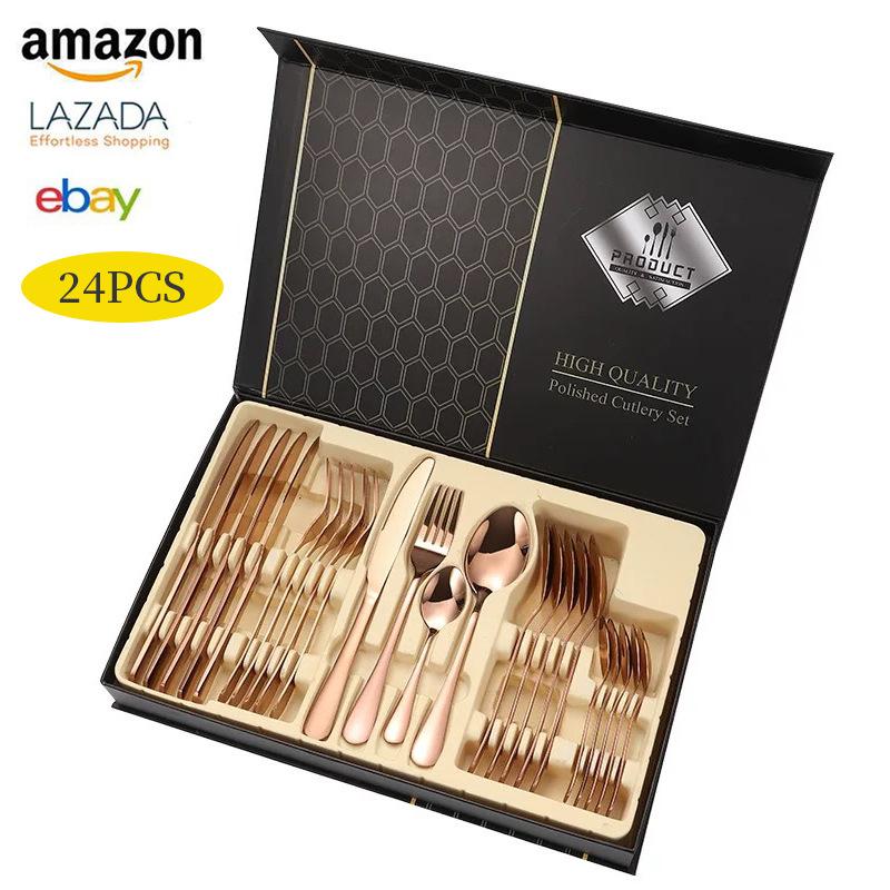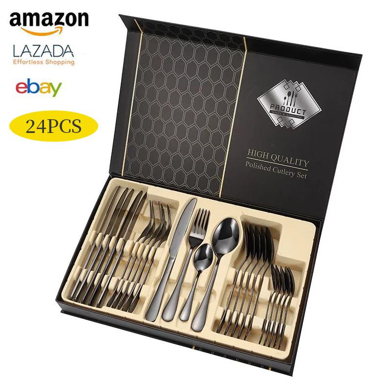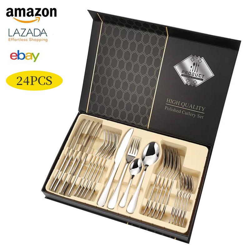 Compre Cross-border Amazon Aço Inoxidável Faca, Garfo e Colher Conjunto de 24 peças Conjunto de bife ocidental para 6 pessoas, garfo e colher Presente Set no atacado no Joom.pro