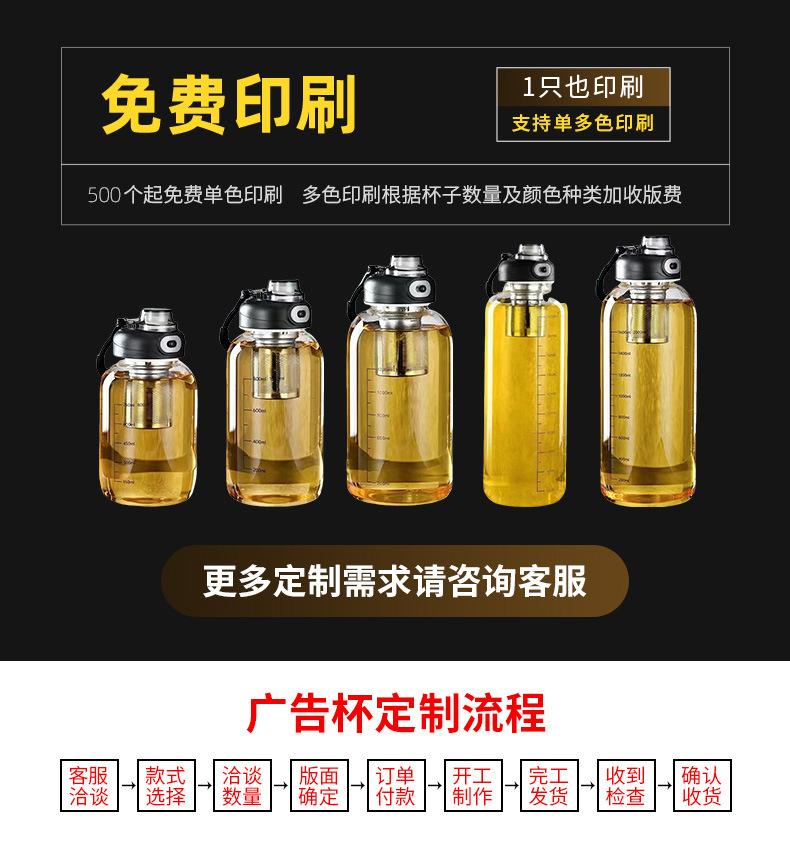 Negócios de grande capacidade de separação de chá vidro engrossado com escala esportes copo chá fabricantes de vidro por atacado