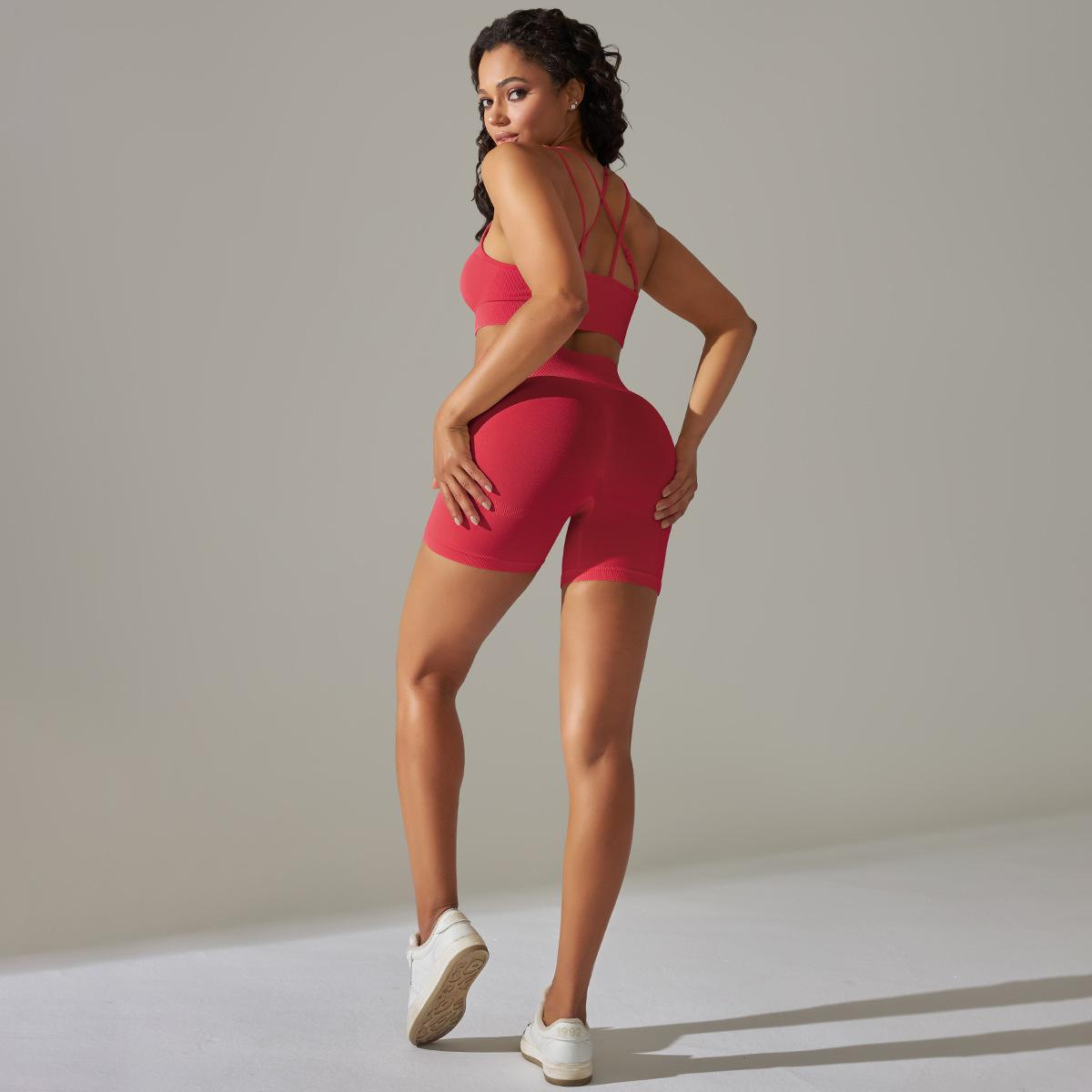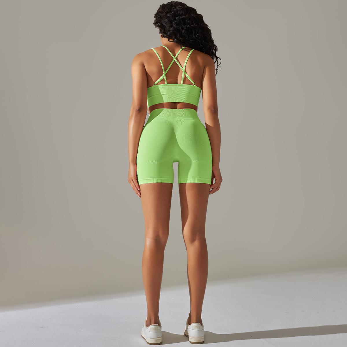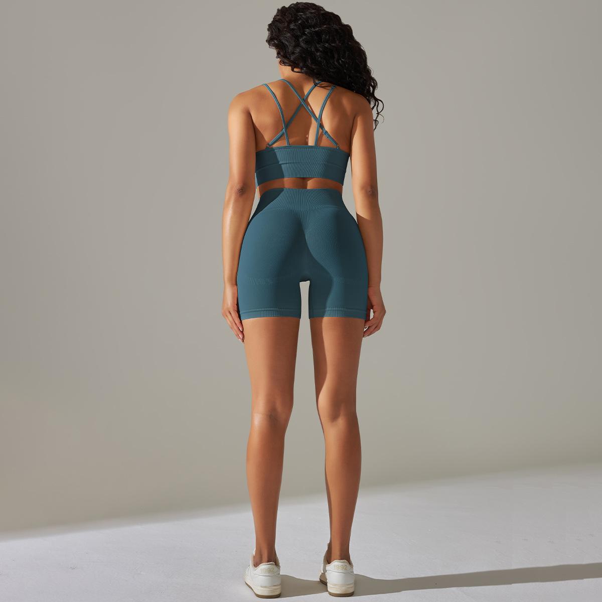 Roupa íntima esportiva justa e sem costura europeia e americana transfronteiriça, traje de ioga, shorts de corrida e fitness, conjunto de duas peças