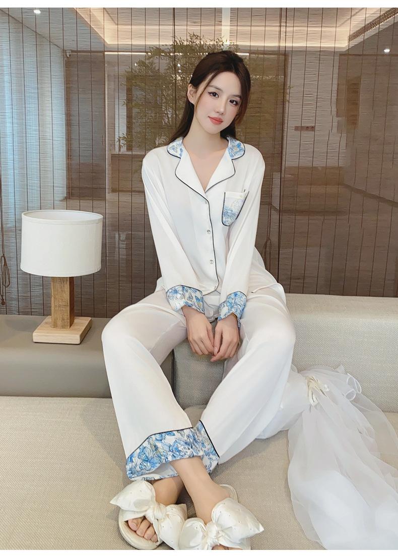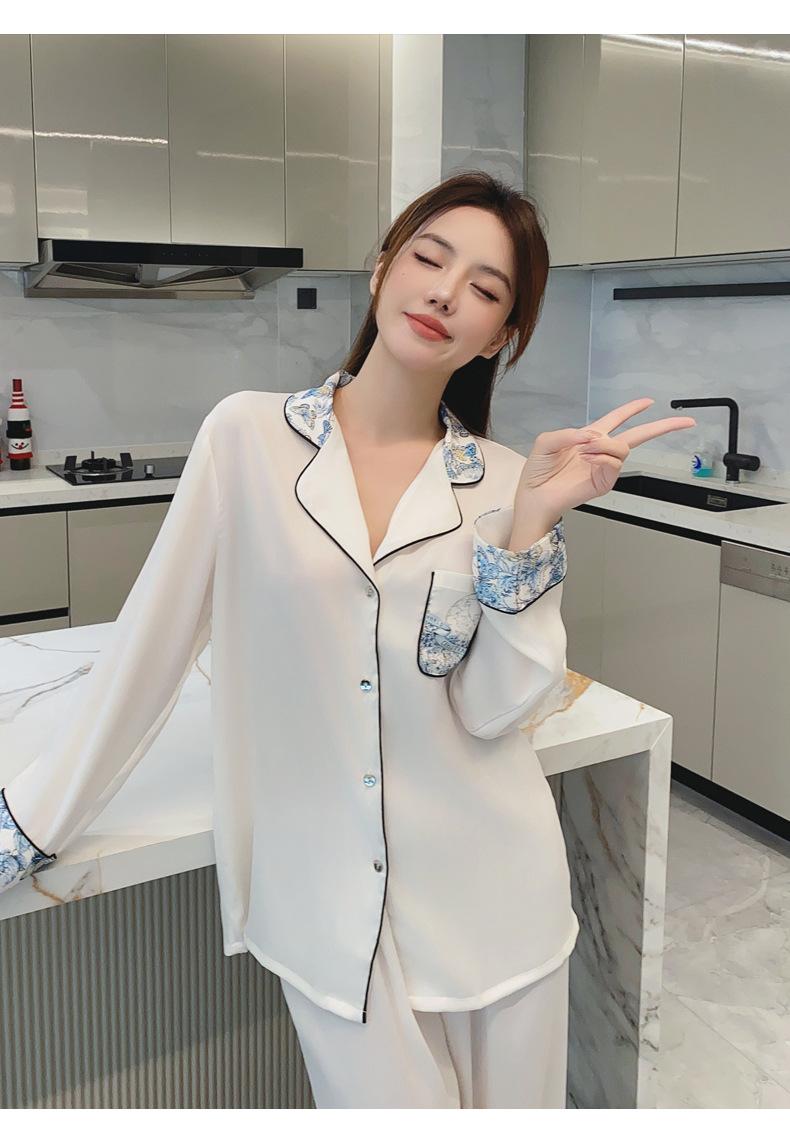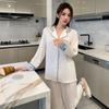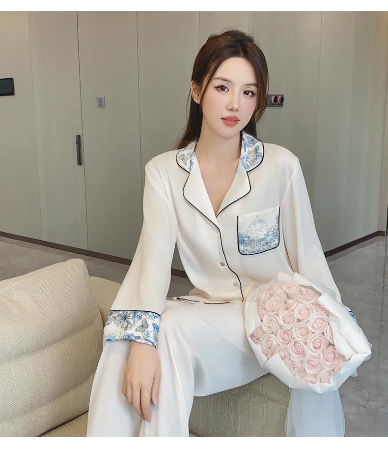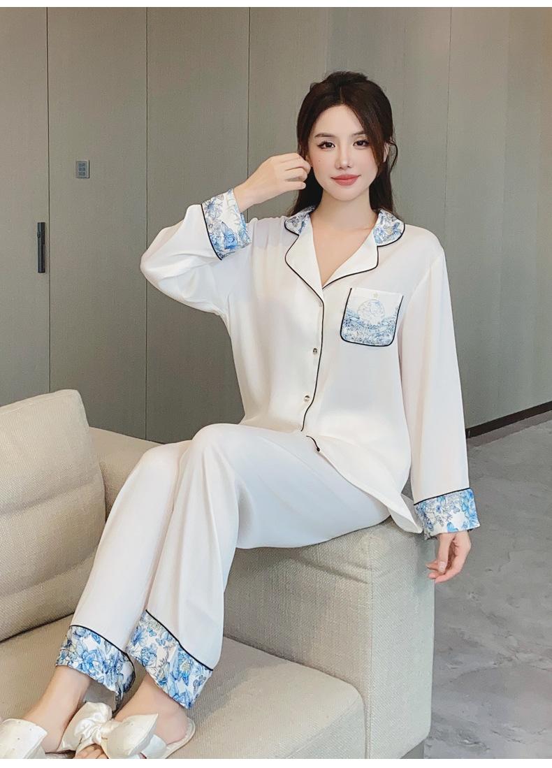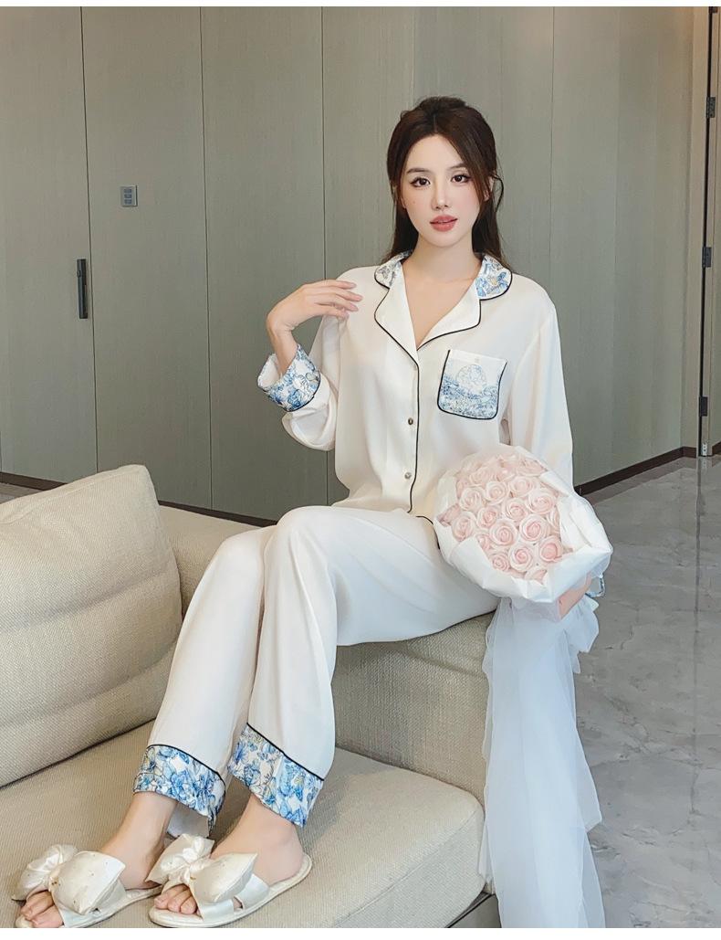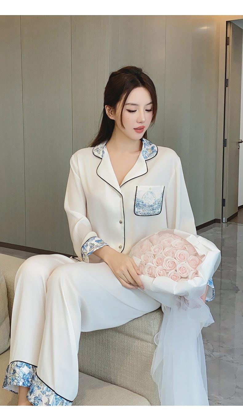2024 Novo pijama de seda de gelo feminino primavera e outono de mangas compridas duas peças casual fino terno feminino pode ser usado fora