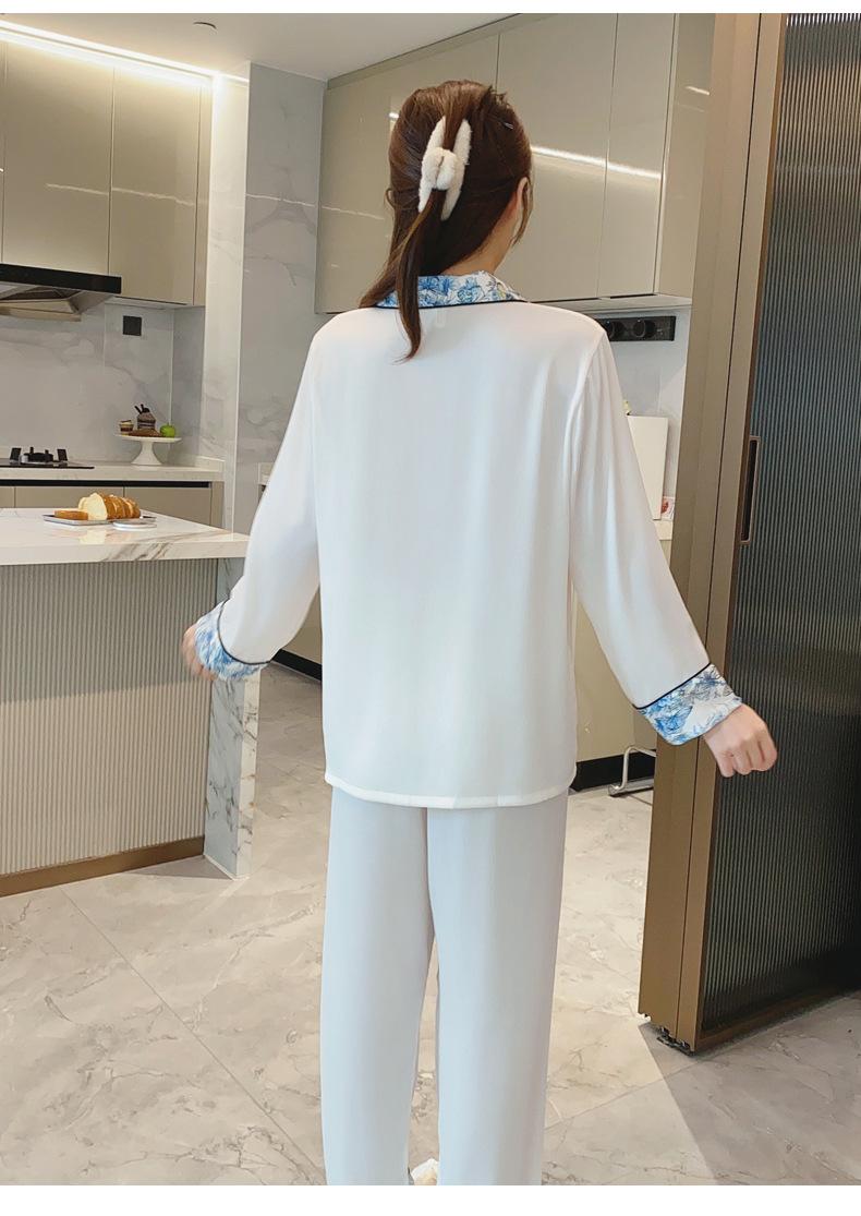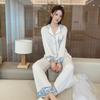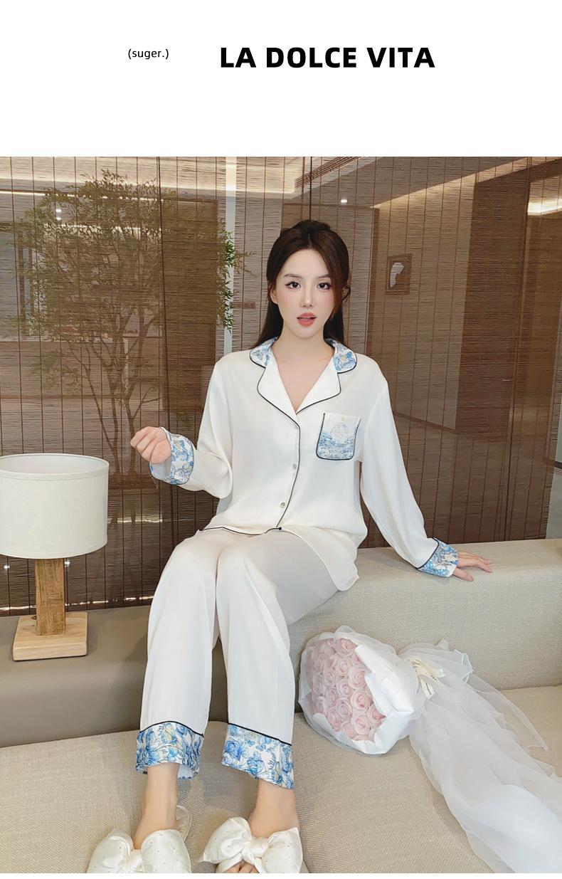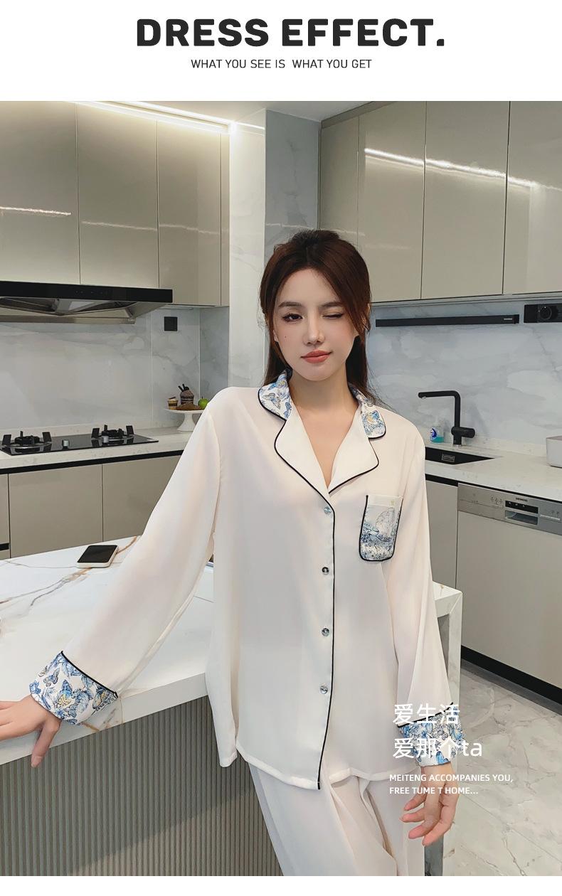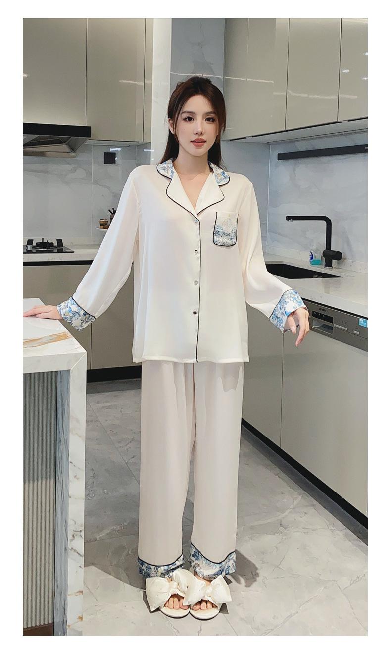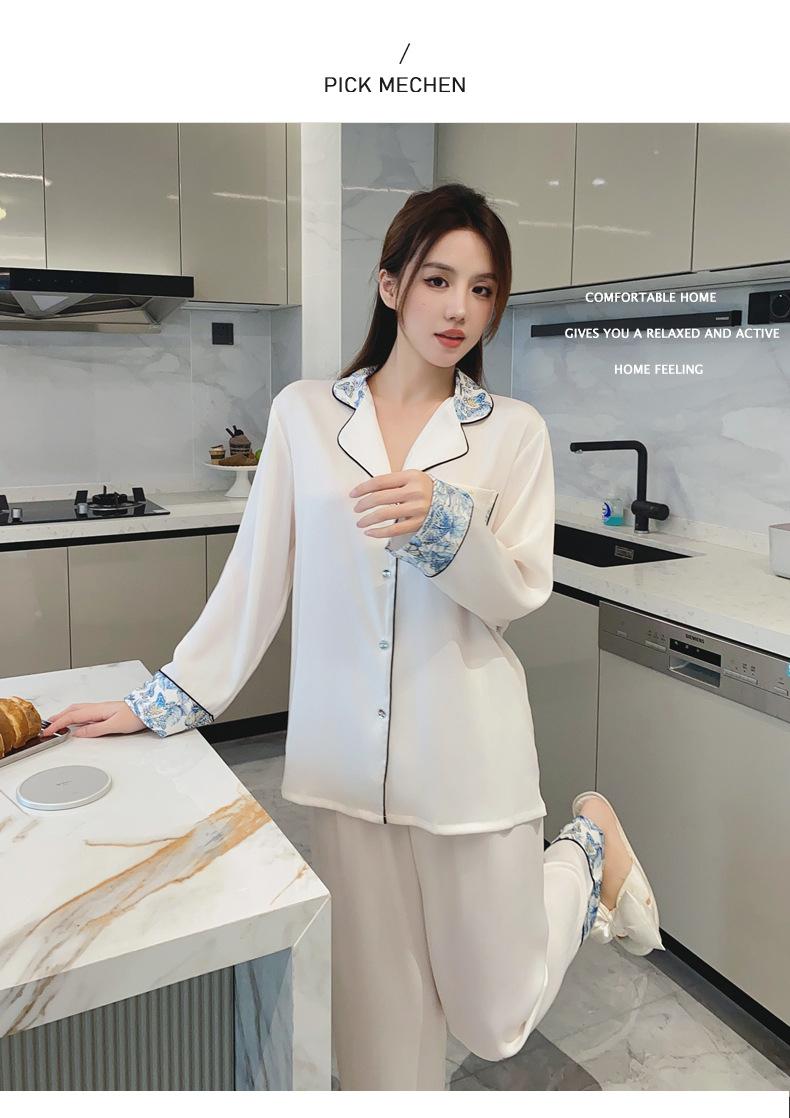 2024 Novo pijama de seda de gelo feminino primavera e outono de mangas compridas duas peças casual fino terno feminino pode ser usado fora
