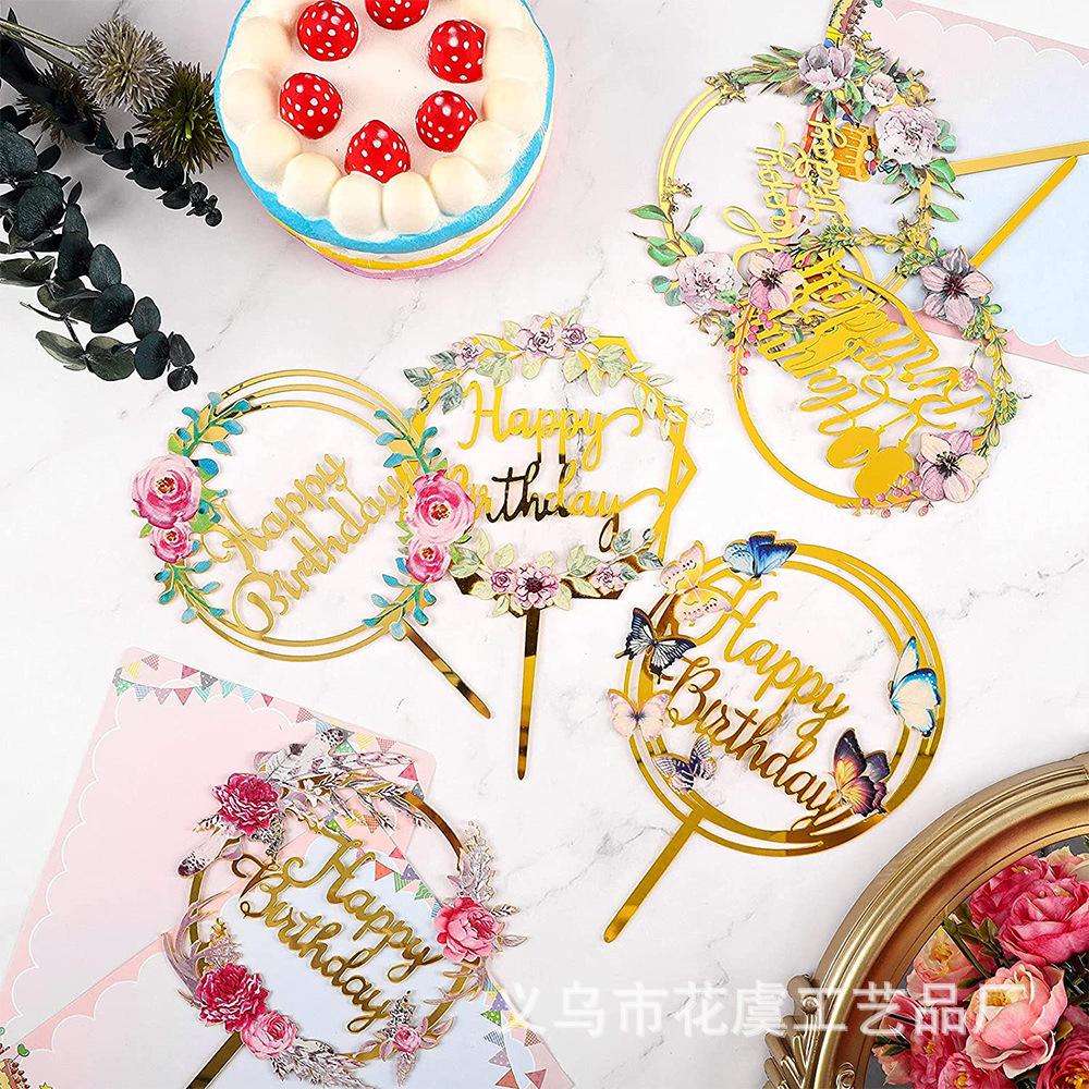 Decoração de bolo de confeitaria popular em acrílico com flores de cor clara e feliz aniversário para inserir no bolo