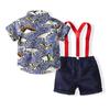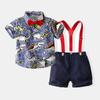 Meninos Gentleman's Casual Suit 2024 Verão Novo Estilo Europeu e Americano Camisa de dinossauro dos desenhos animados das crianças com terno Strappage Calças