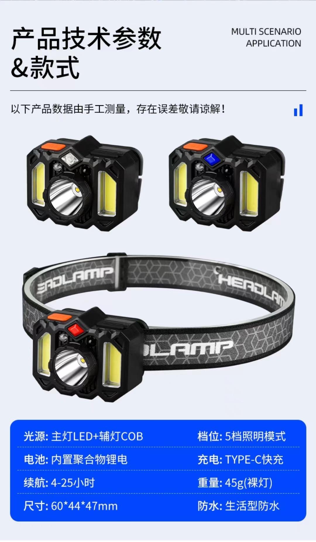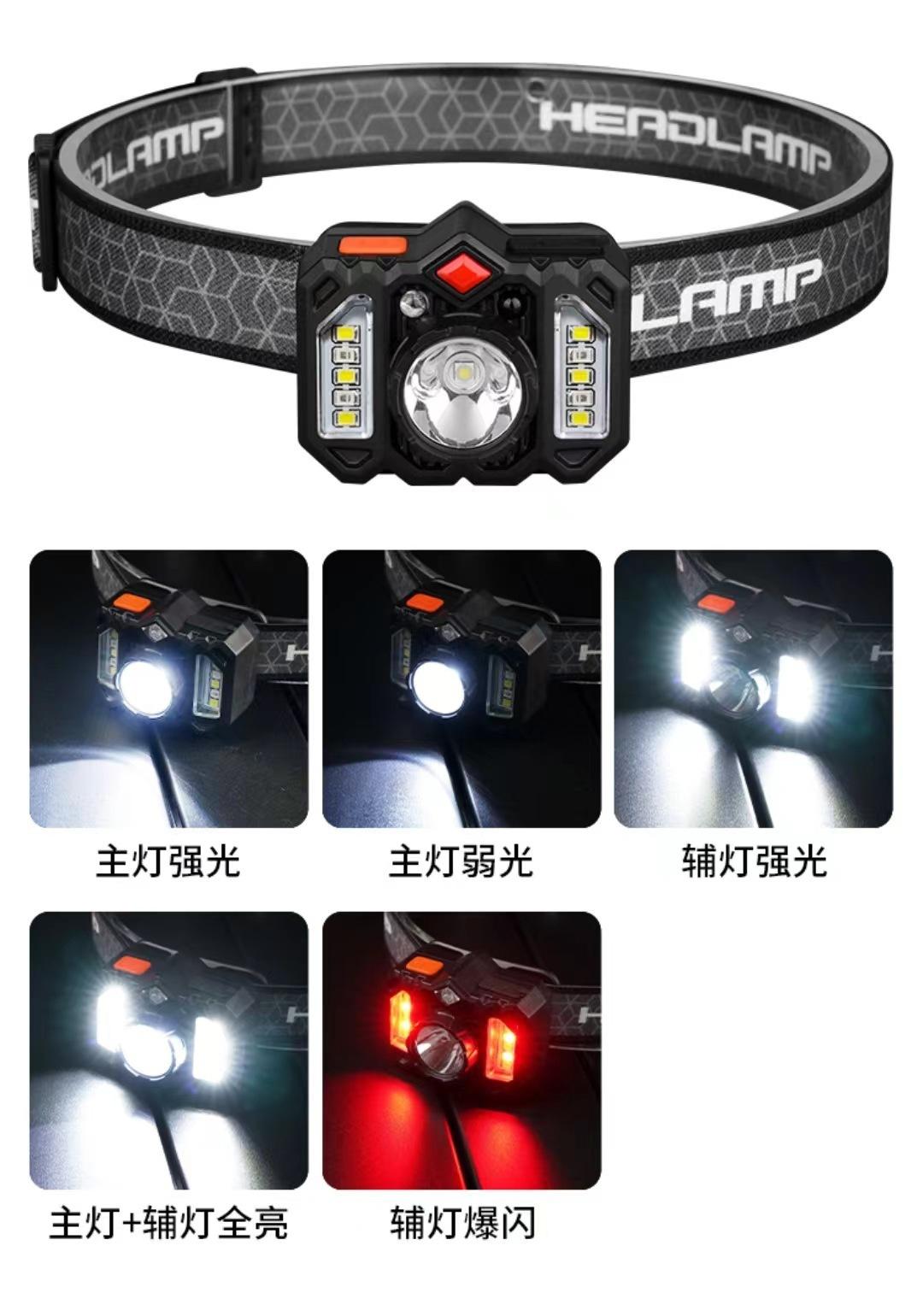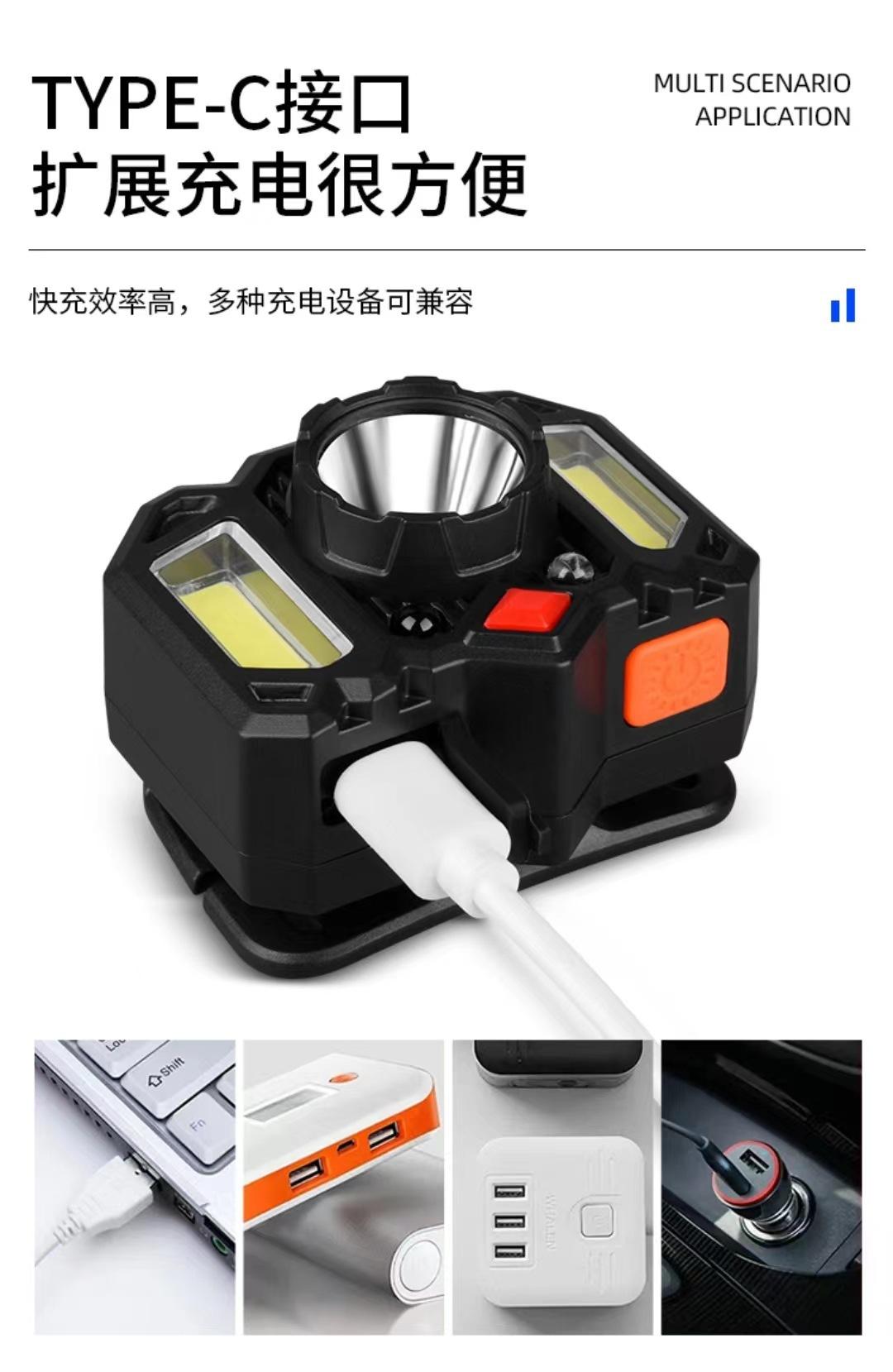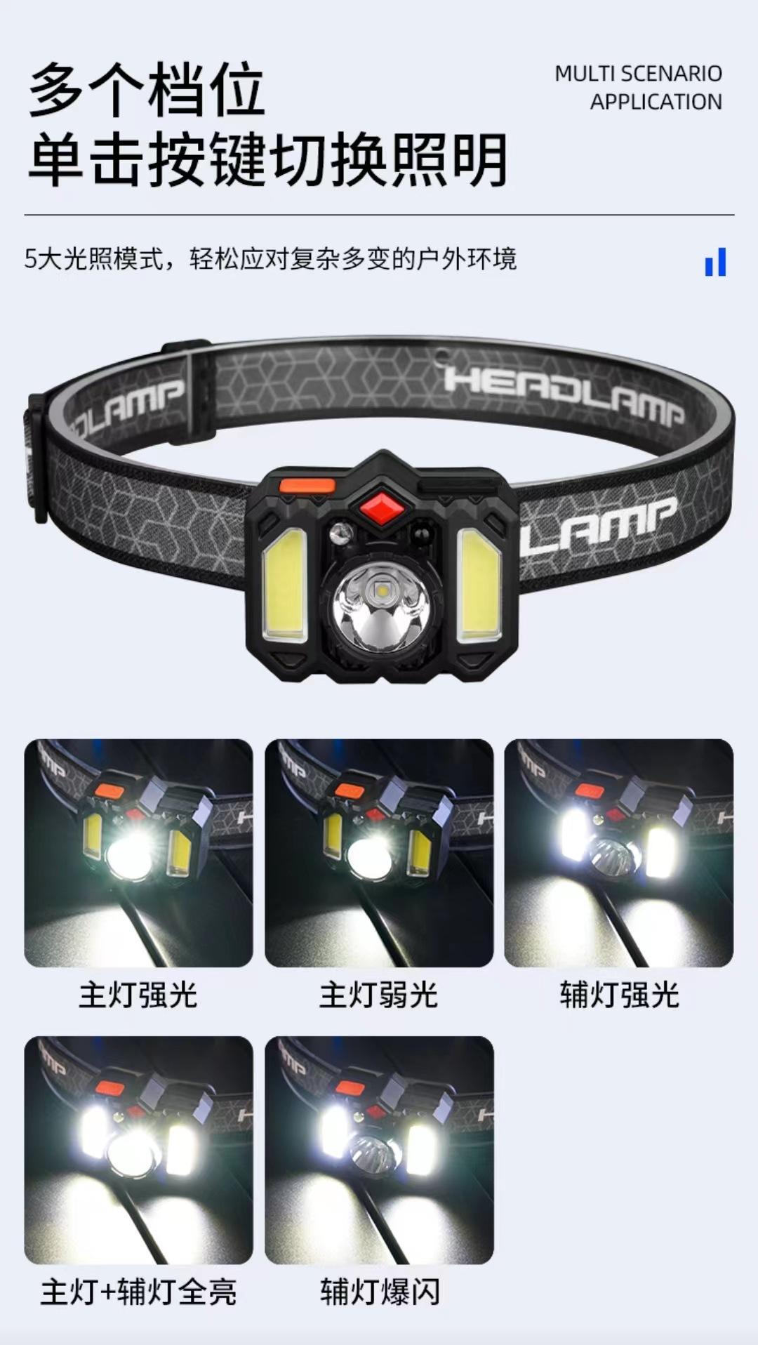 Farol transfronteiriço de indução de nova onda ao ar livre LED lanterna montada na cabeça lâmpada de pesca COB ao ar livre noite funcionando farol de luz forte