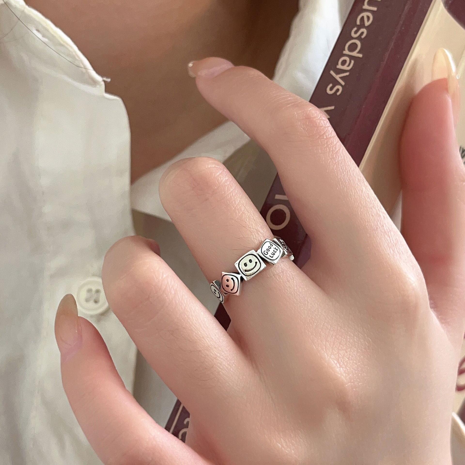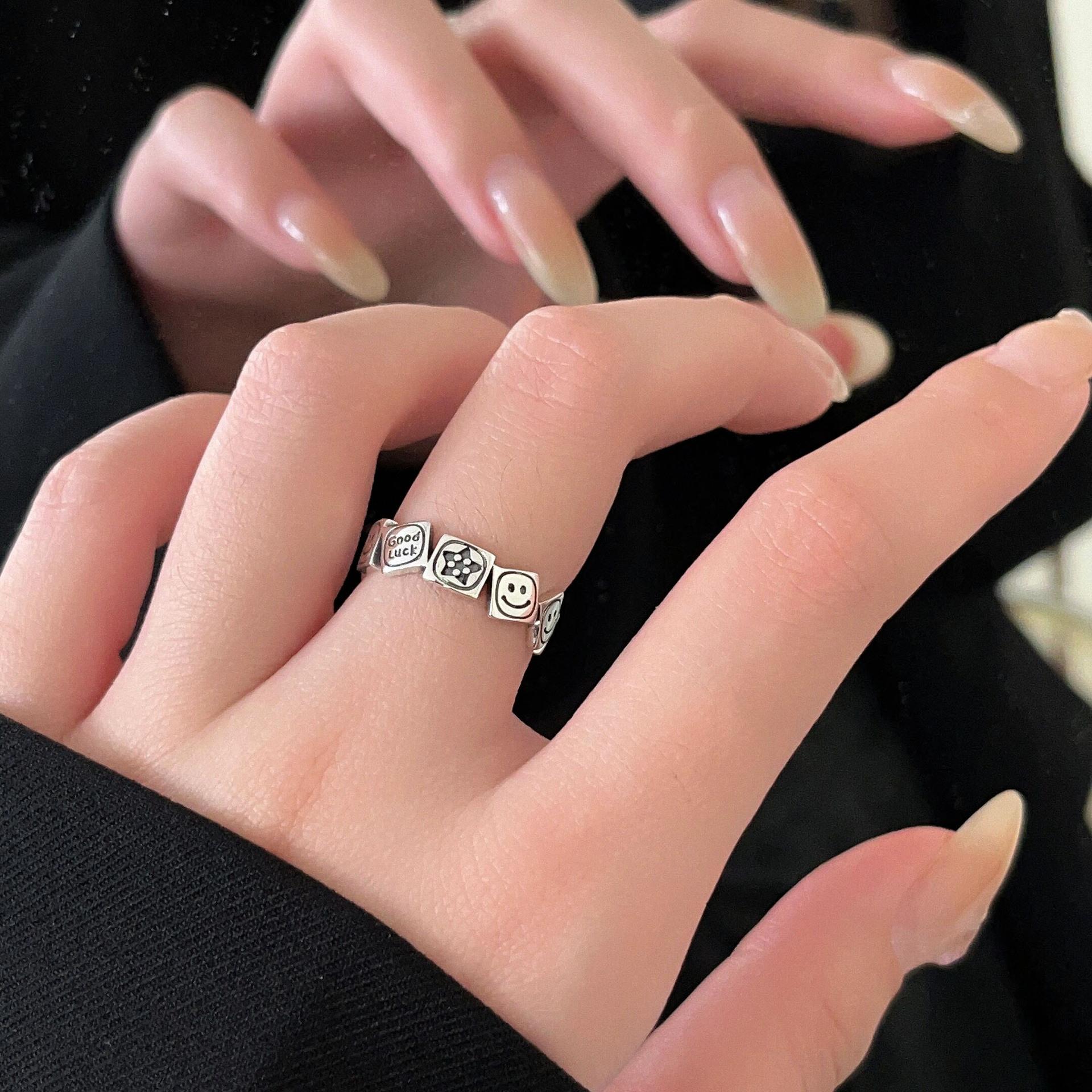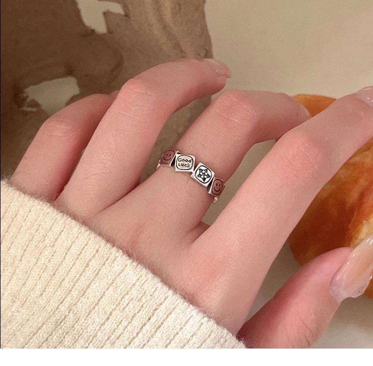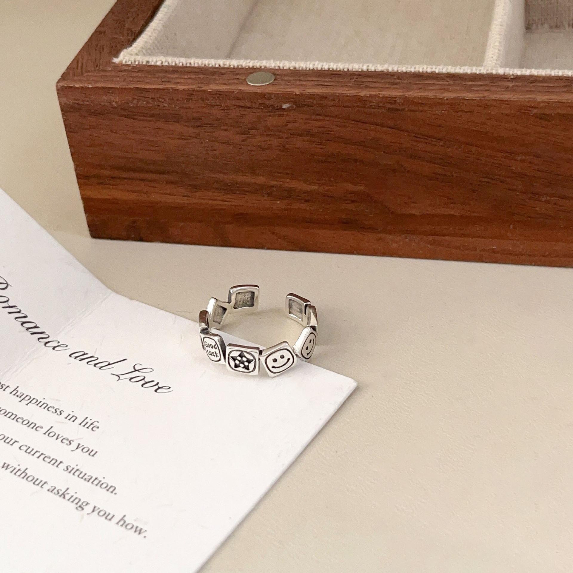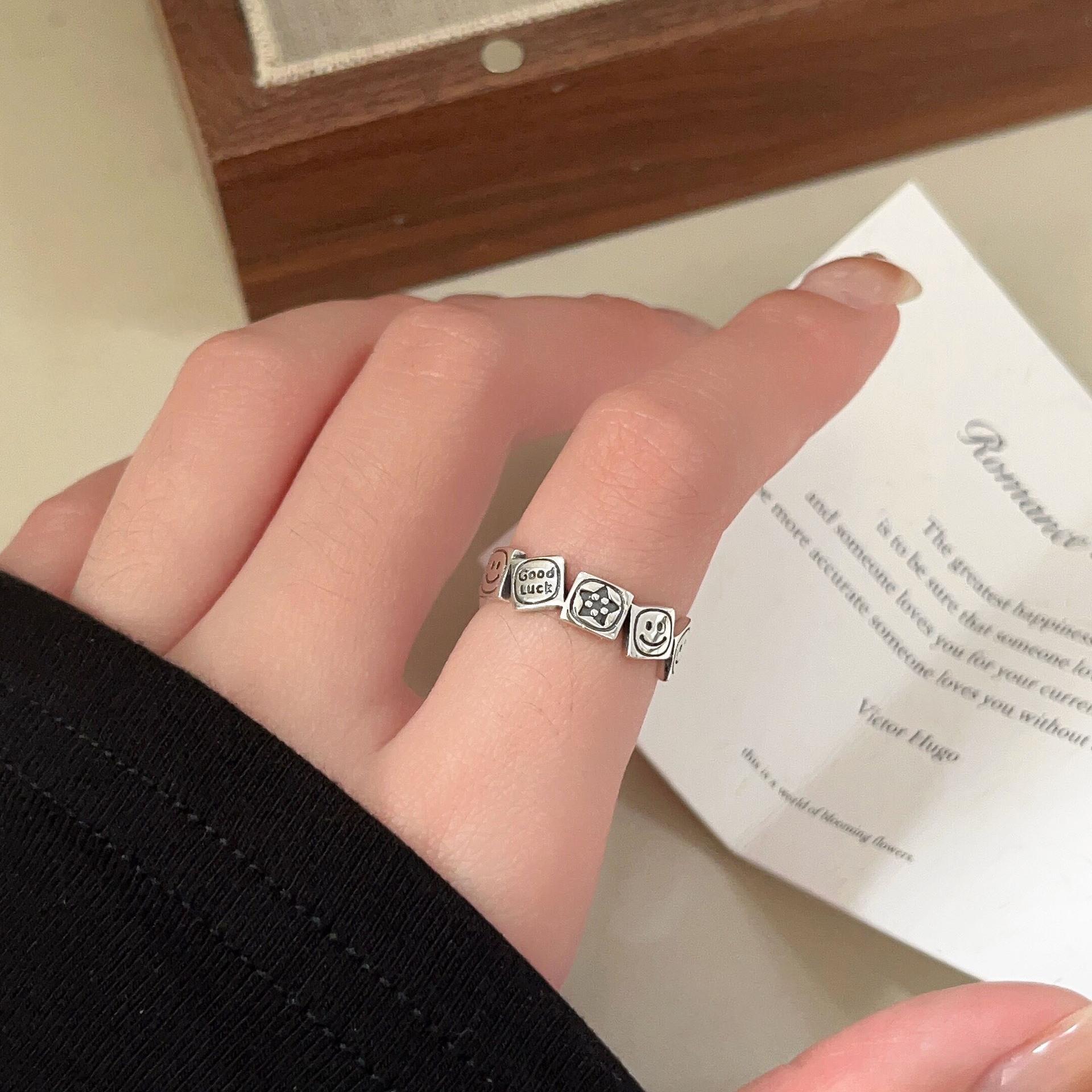 Compre Prata Ruitai s925 prata esterlina Coreia do Sul nicho design retro angustiado quadrado Smiley anel feminino moda anel aberto no atacado no Joom.pro