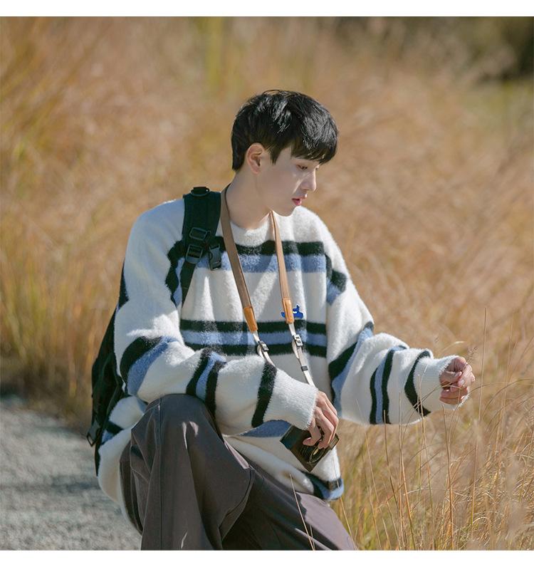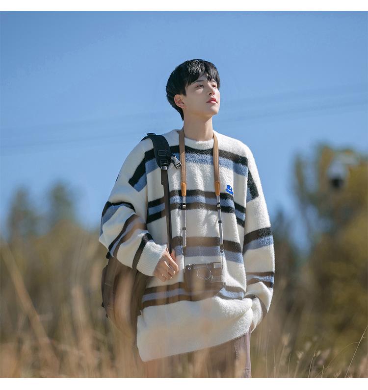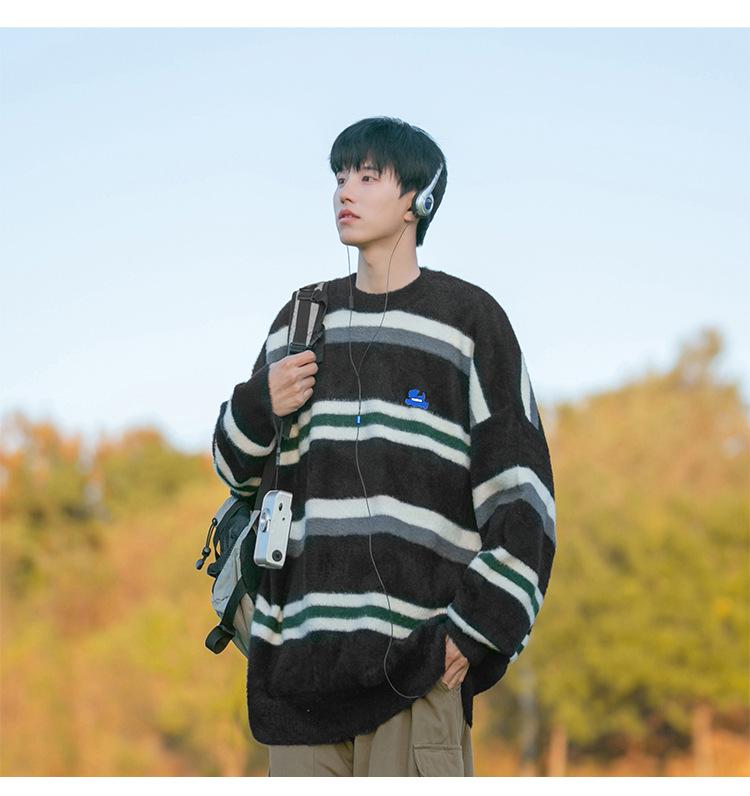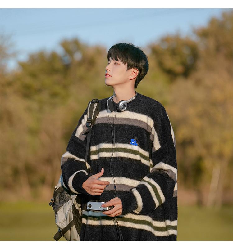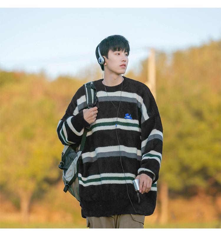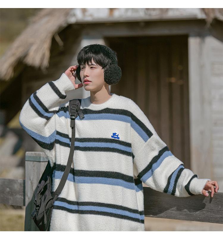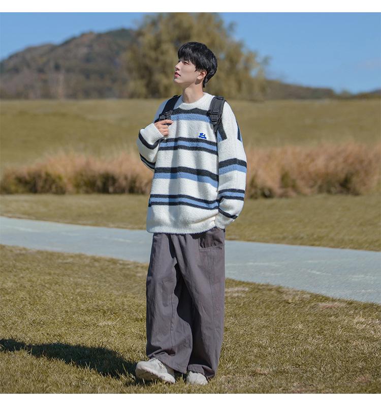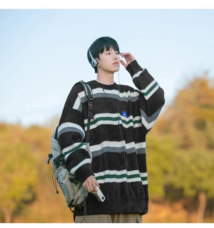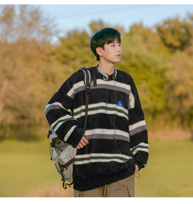 Compre Suéter listrado masculino inverno 2023 Novo estilo preguiçoso grosso quente suéter solto moda marca suéter casaco no atacado no Joom.pro