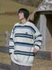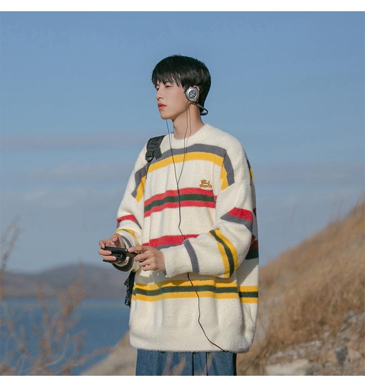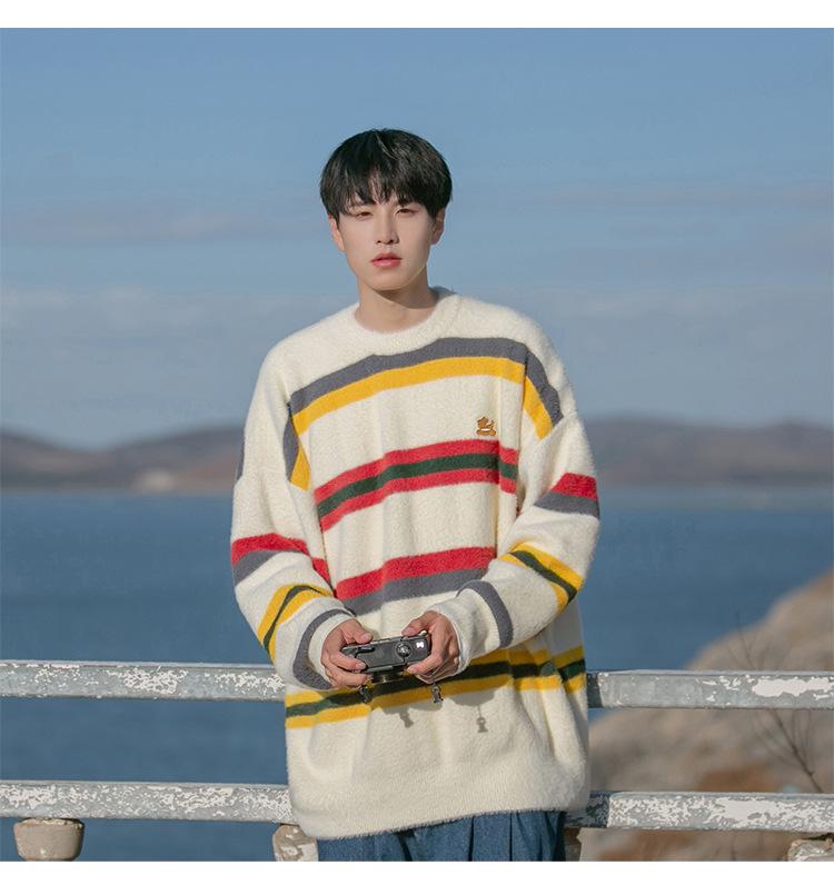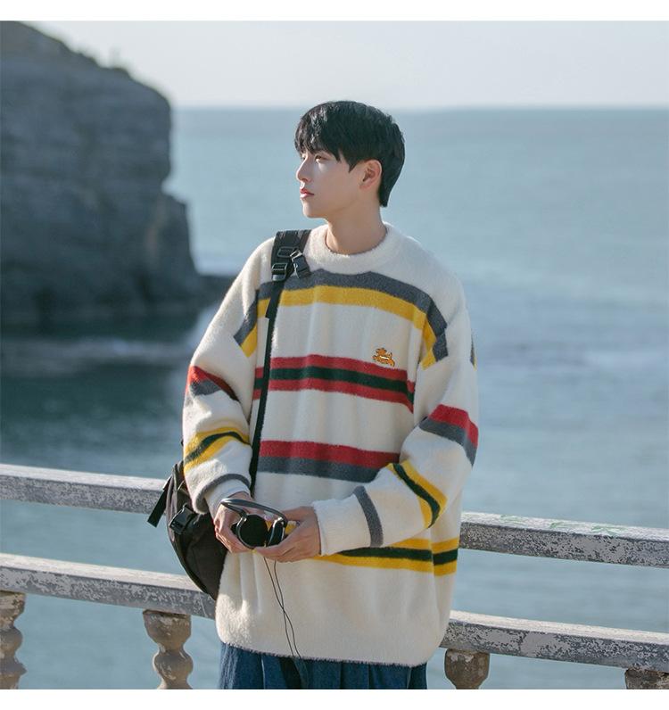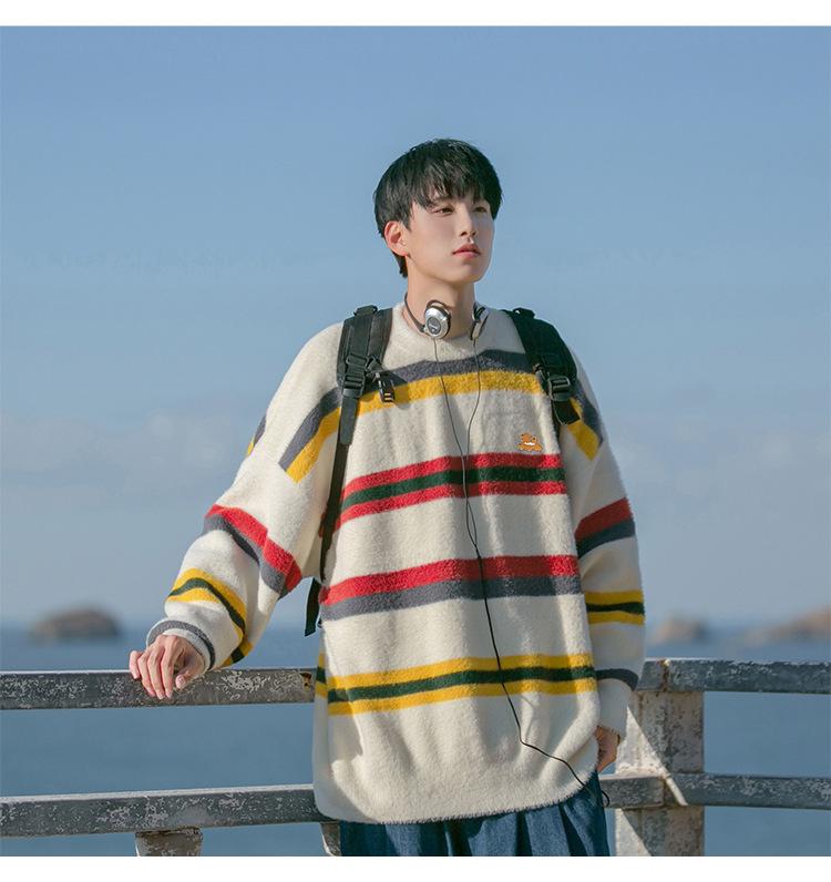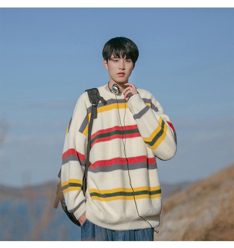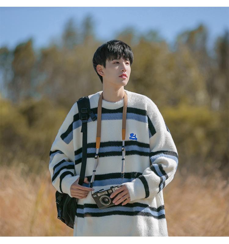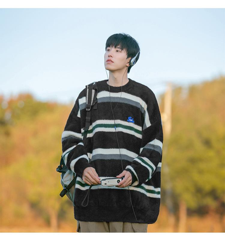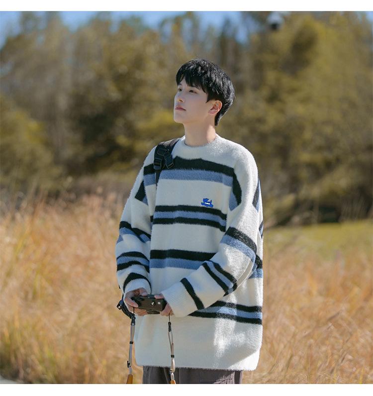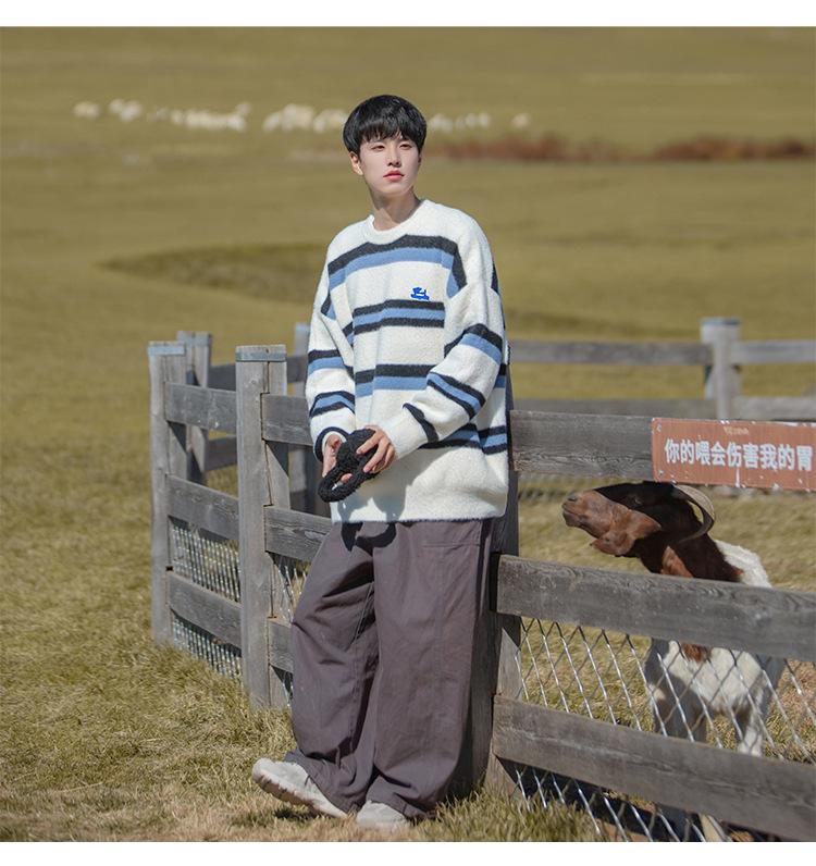 Compre Suéter listrado masculino inverno 2023 Novo estilo preguiçoso grosso quente suéter solto moda marca suéter casaco no atacado no Joom.pro