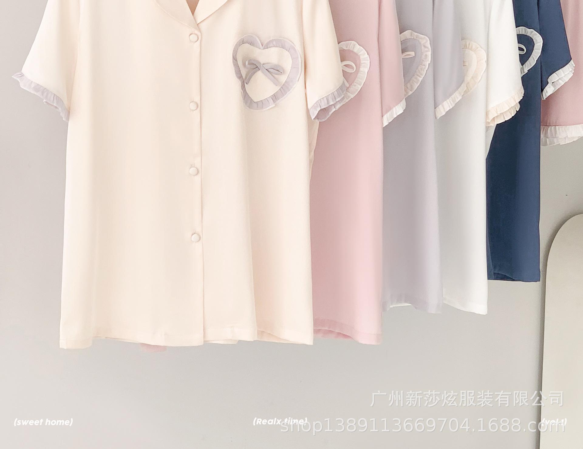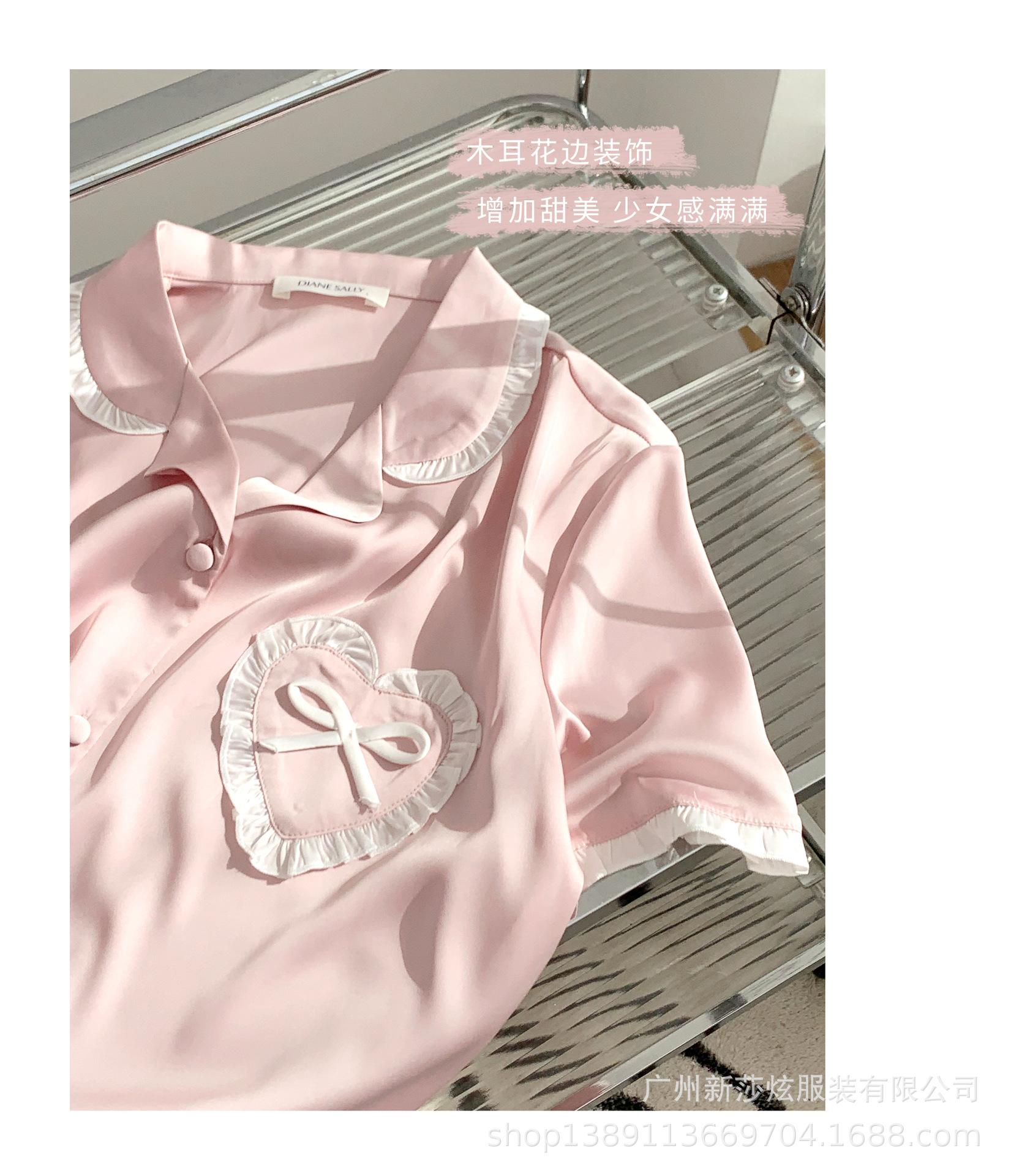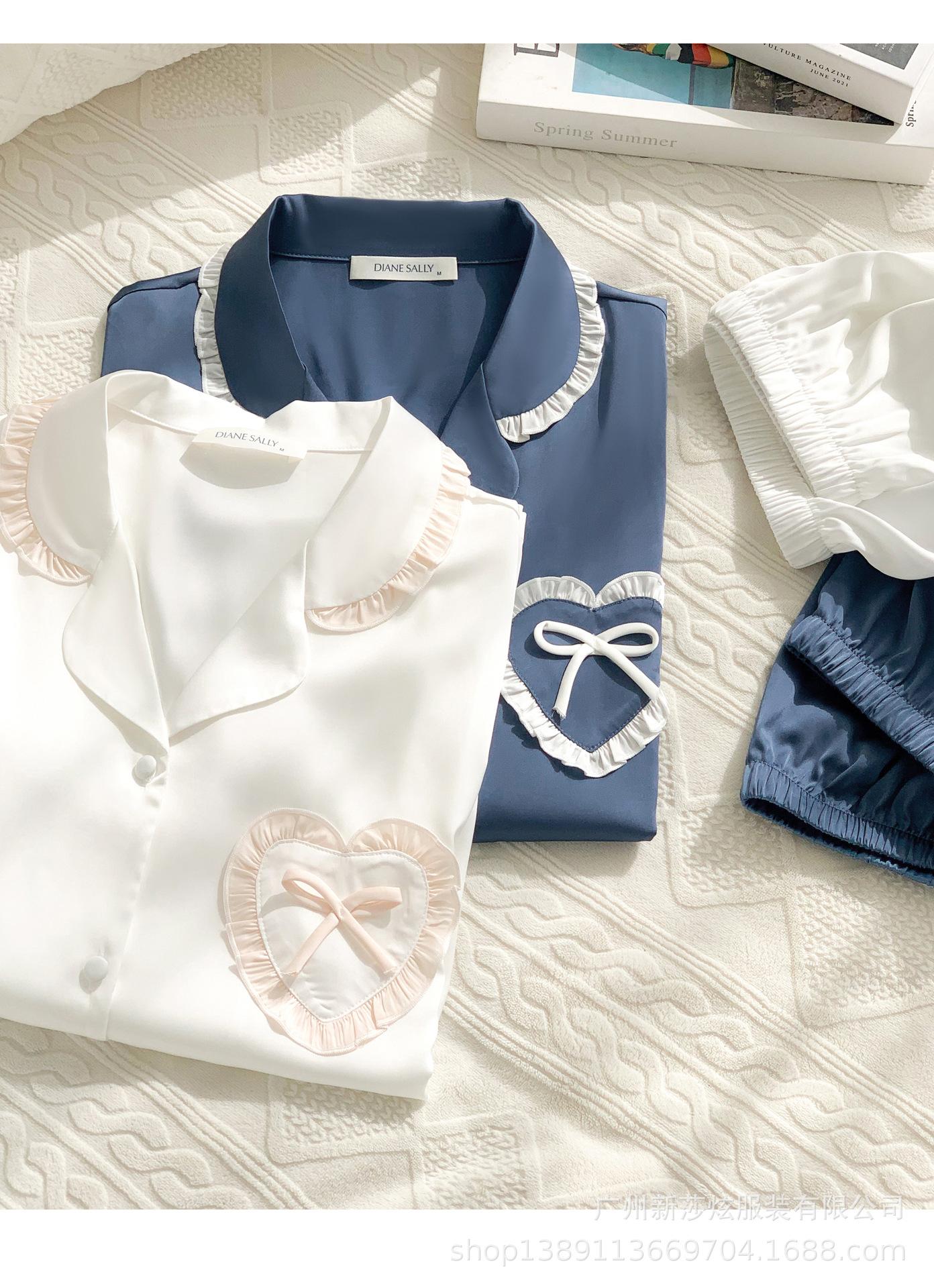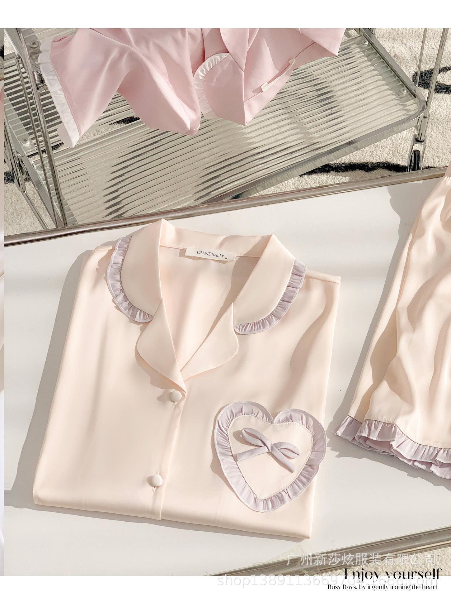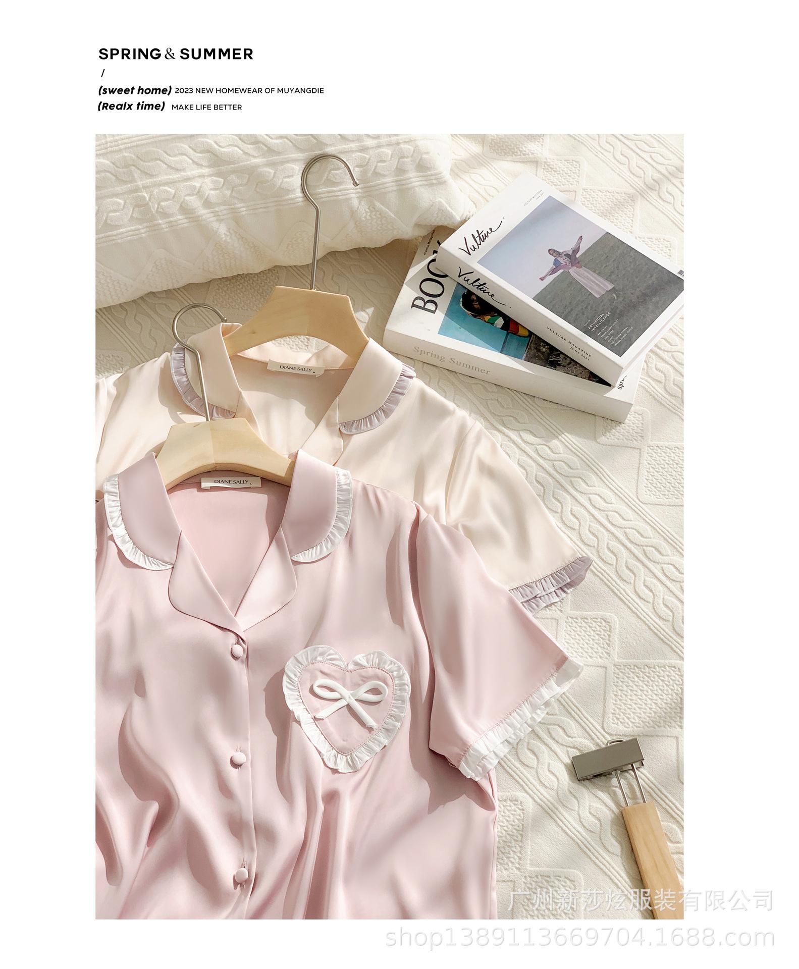 Pijama Feminino Primavera e Verão Fino Coração Roupa de Casa de Menina Conjunto de Duas Peças com Laço Estilo Doce Terno de Manga Curta em Seda Gelo