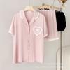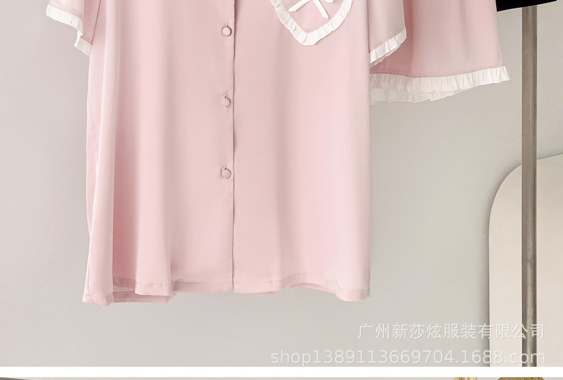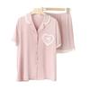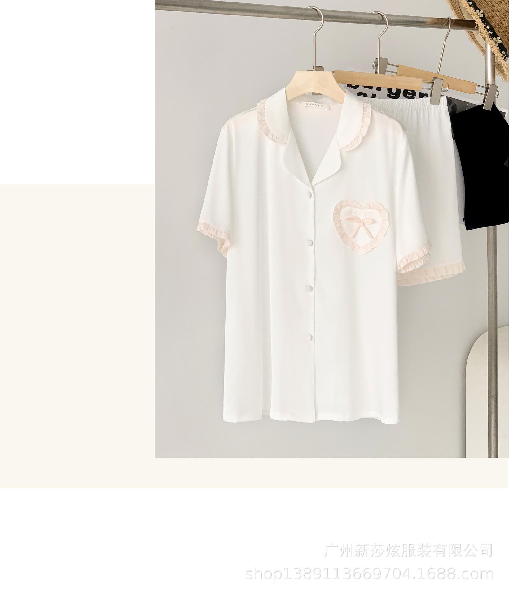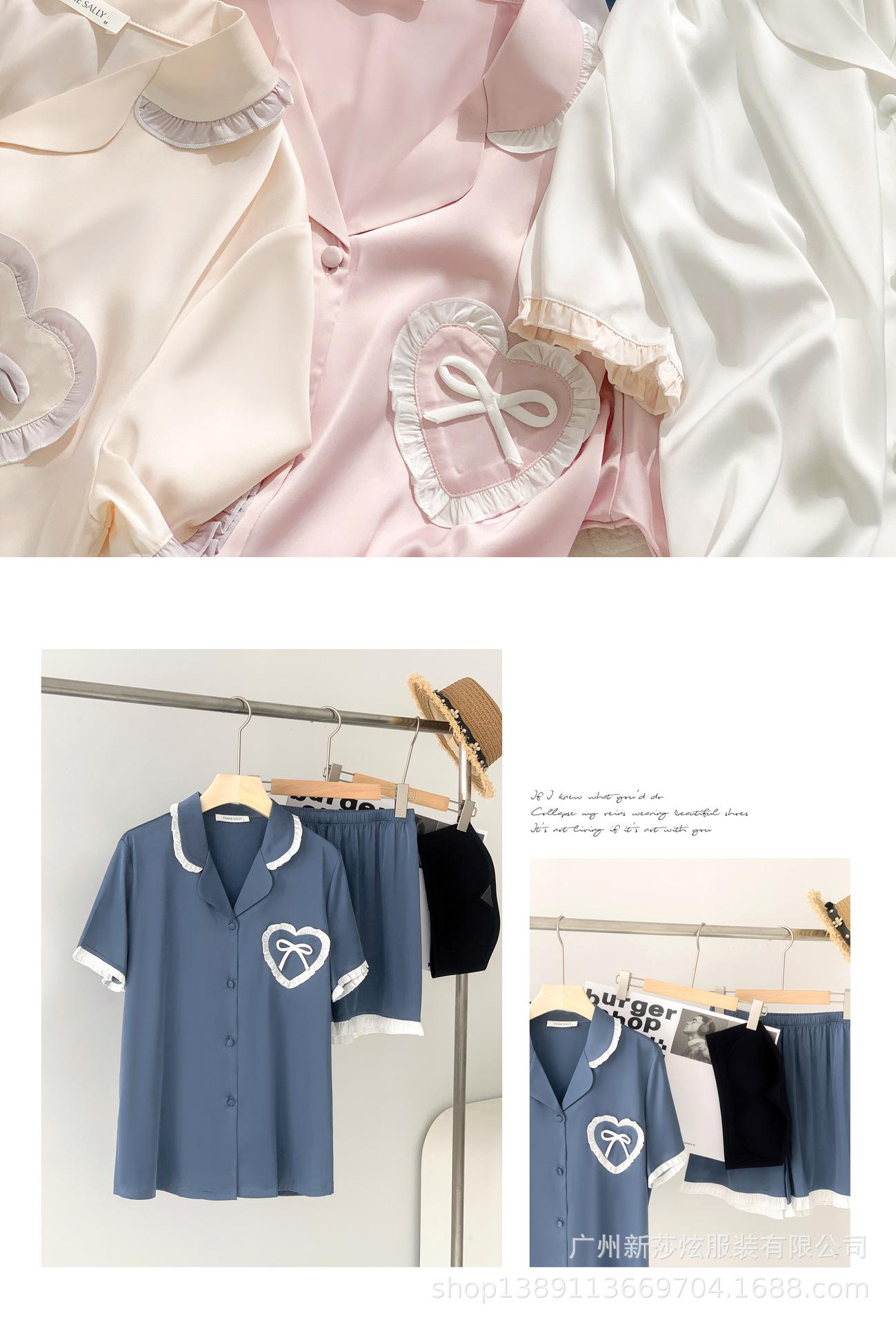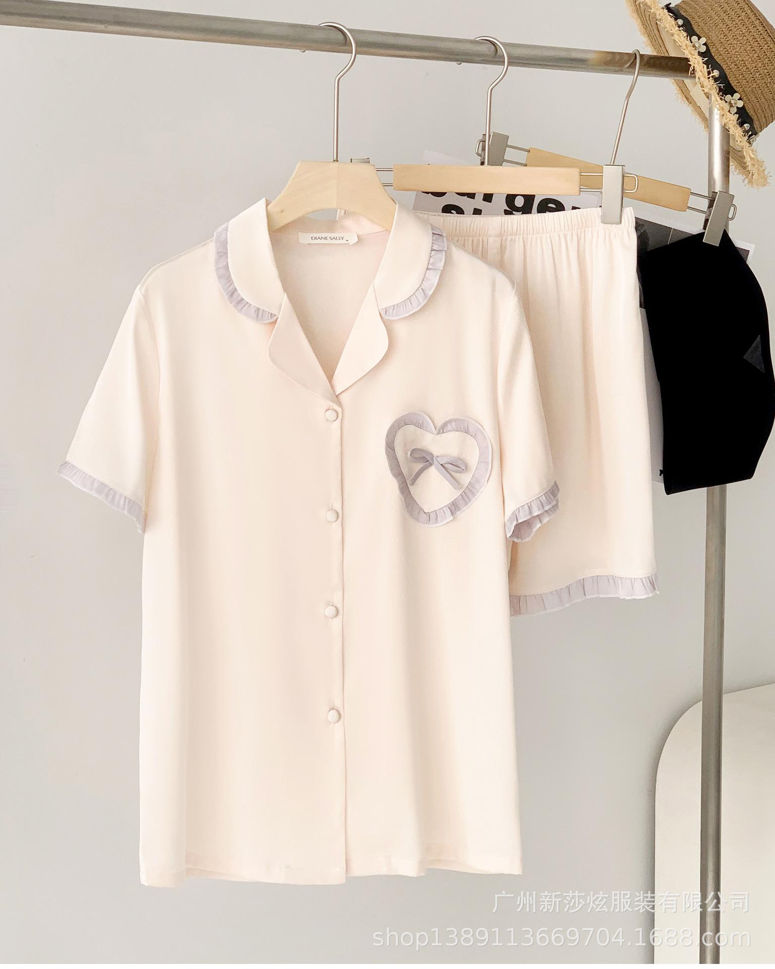 Pijama Feminino Primavera e Verão Fino Coração Roupa de Casa de Menina Conjunto de Duas Peças com Laço Estilo Doce Terno de Manga Curta em Seda Gelo