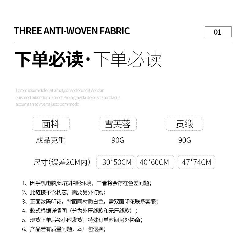 (2) Sobre o tamanho:Devido a diferentes métodos de medição, diferentes lotes de produção e diferentes formatos de núcleos internos de travesseiros, pode haver um erro de 2CM-3CM nas almofadas e um erro de 5CM nas toalhas de mesa e bandeiras de mesa, o que não é um problema de qualidade; nosso padrão de medição: o tamanho líquido real da borda do revestimento externo (observe para formas irregulares, como almofadas e almofadas de assento);