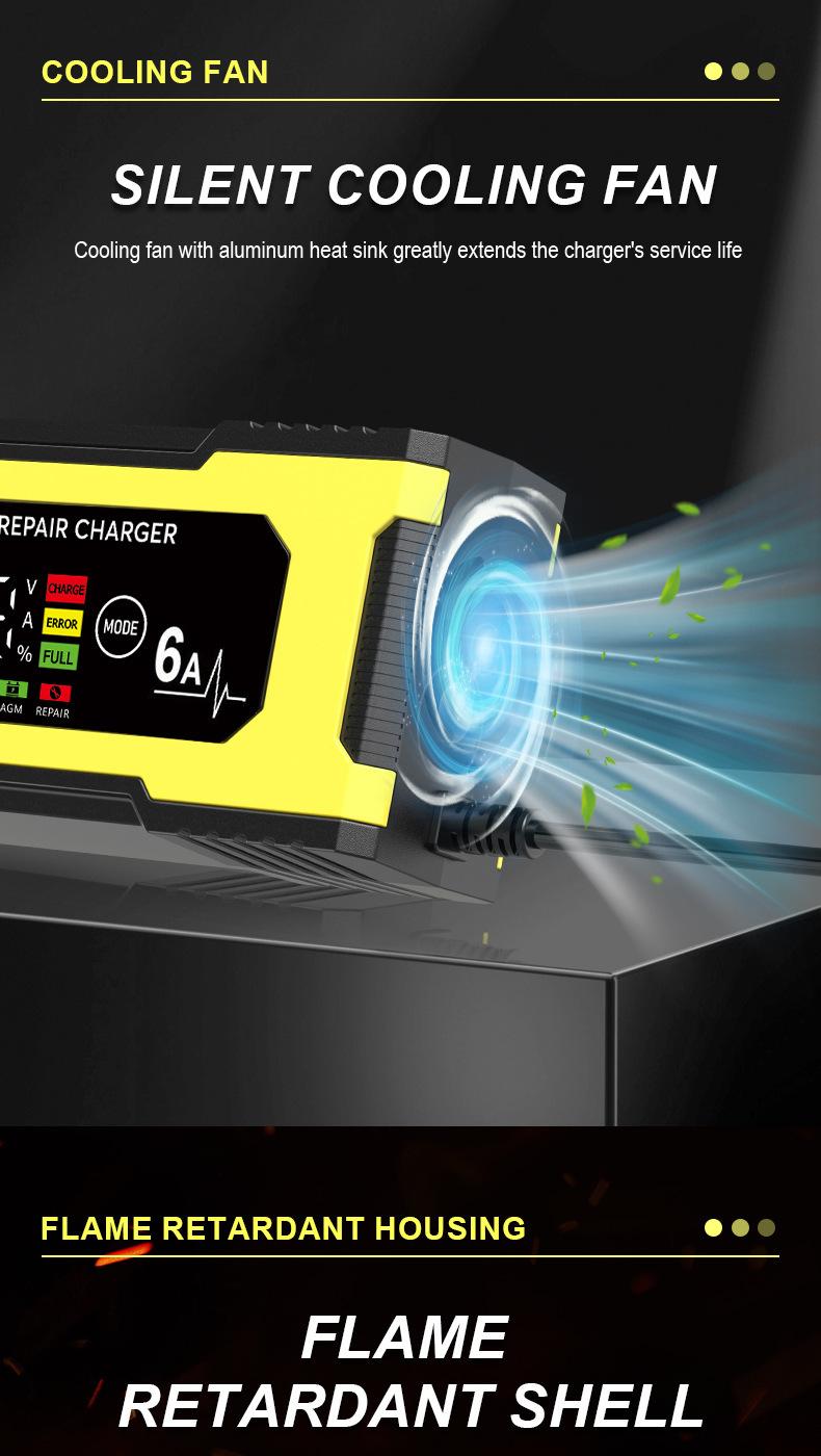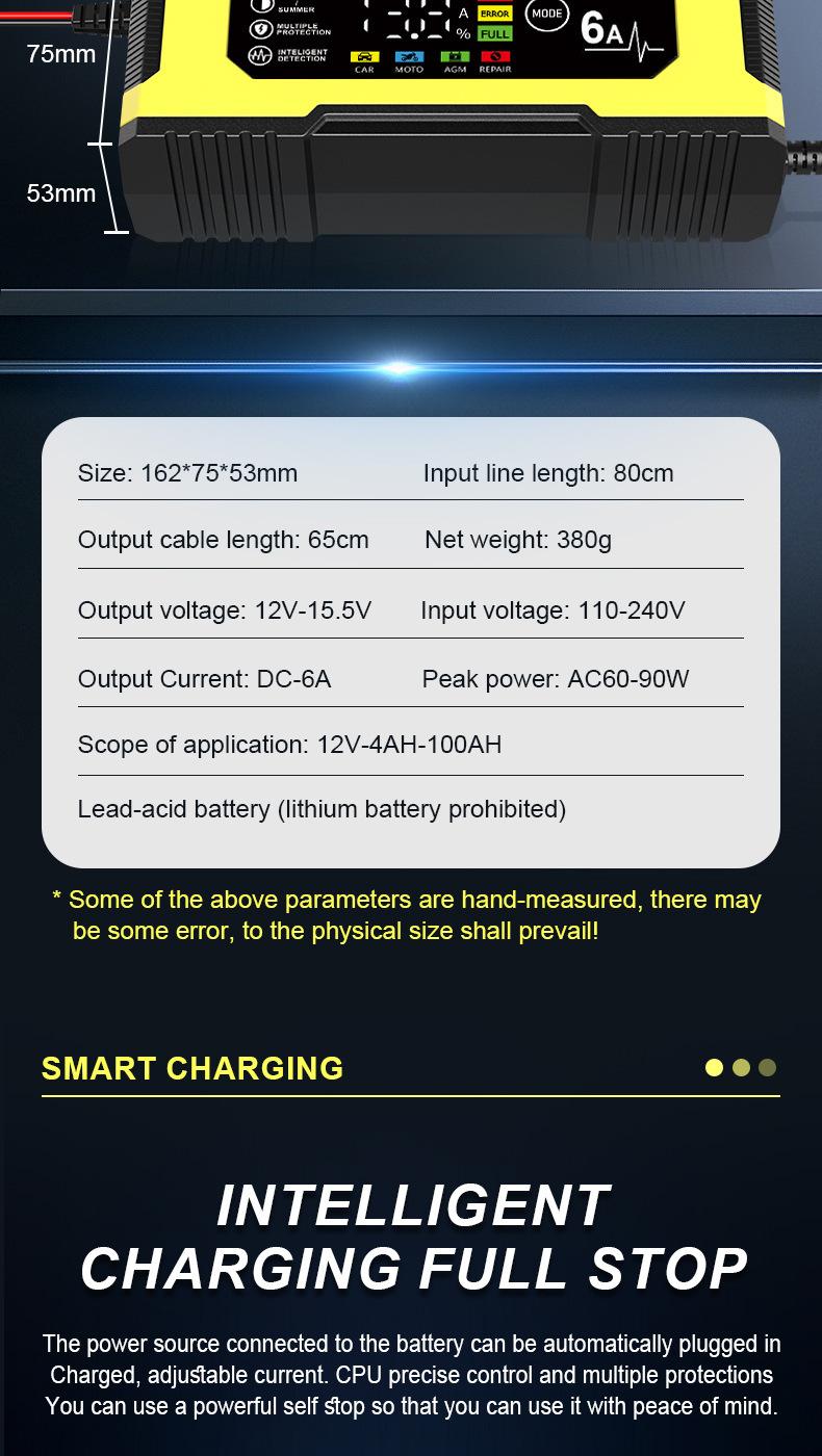 Carregador de bateria de motocicleta 12V6A Carregador de bateria de carro Carregador de bateria de reparo inteligente 12V