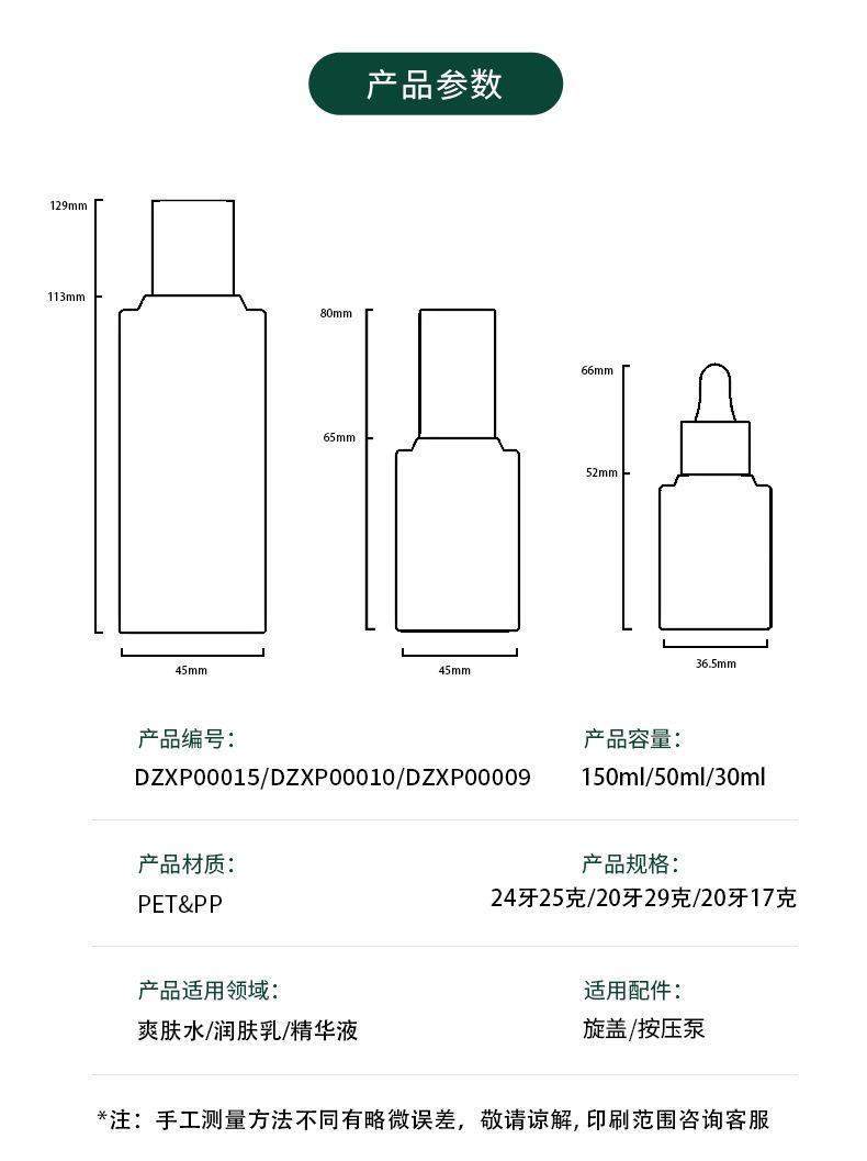 30ml;DZXP00009;pet, 50ml;DZXP00015;pet, 150ml;DZXP00015;pet