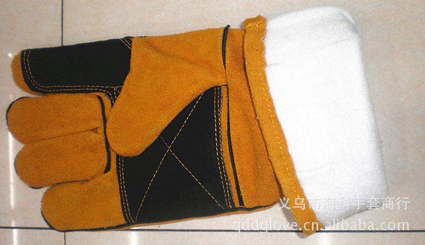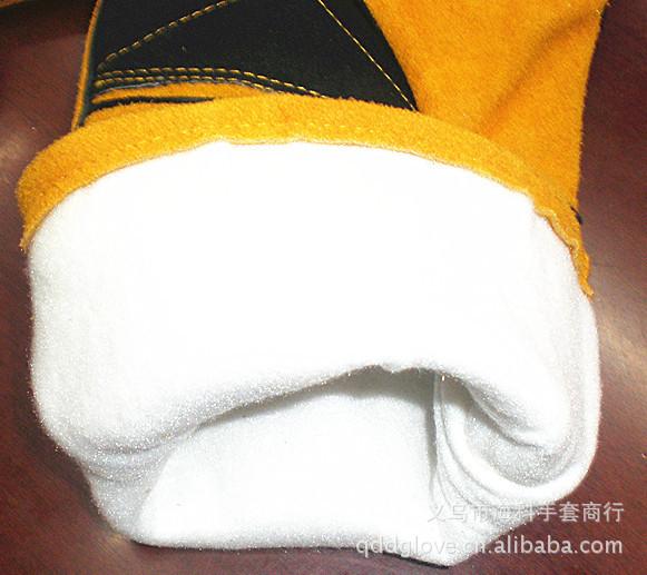 Luvas de soldagem cor natural palma completa vaca luvas de couro de duas camadas borracha amarela pano amarelo grau BC fabricantes resistentes ao desgaste e duráveis atacado