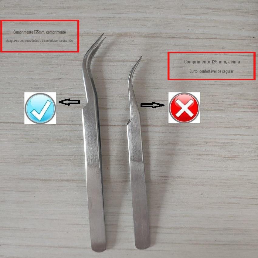 Pinça para cílios em formato de cotovelo, disponível em comprimentos de 125 mm e 135 mm, para cílios simples e múltiplosA distinção entre extensões de cílios, nail art, extensões de cílios e pinças.