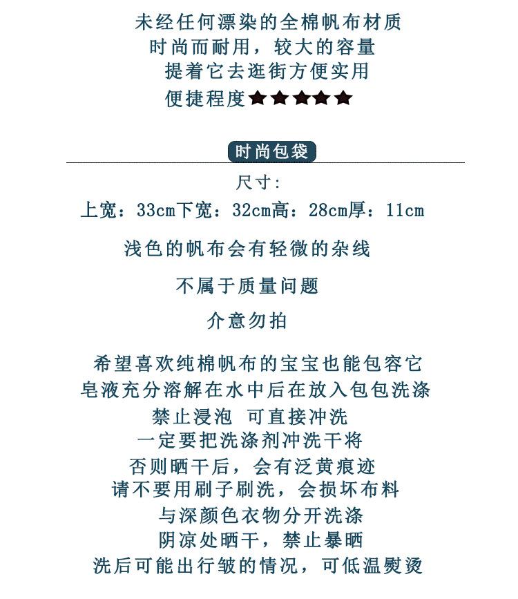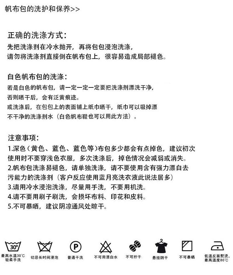 As sacolas de lona são feitas de algodão e desbotam se não forem lavadas corretamente, portanto, tente reduzir a quantidade de detergente usado na lavagem. Se houver manchas de óleo ou outras manchas difíceis na bolsa, você pode usar detergente para lavá-la, mas não use muito. Para as demais peças não é necessário usar detergente, apenas esfregue suavemente em água limpa.