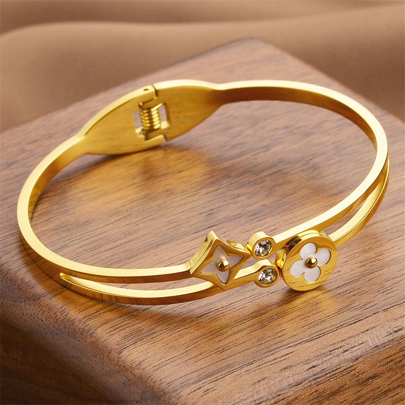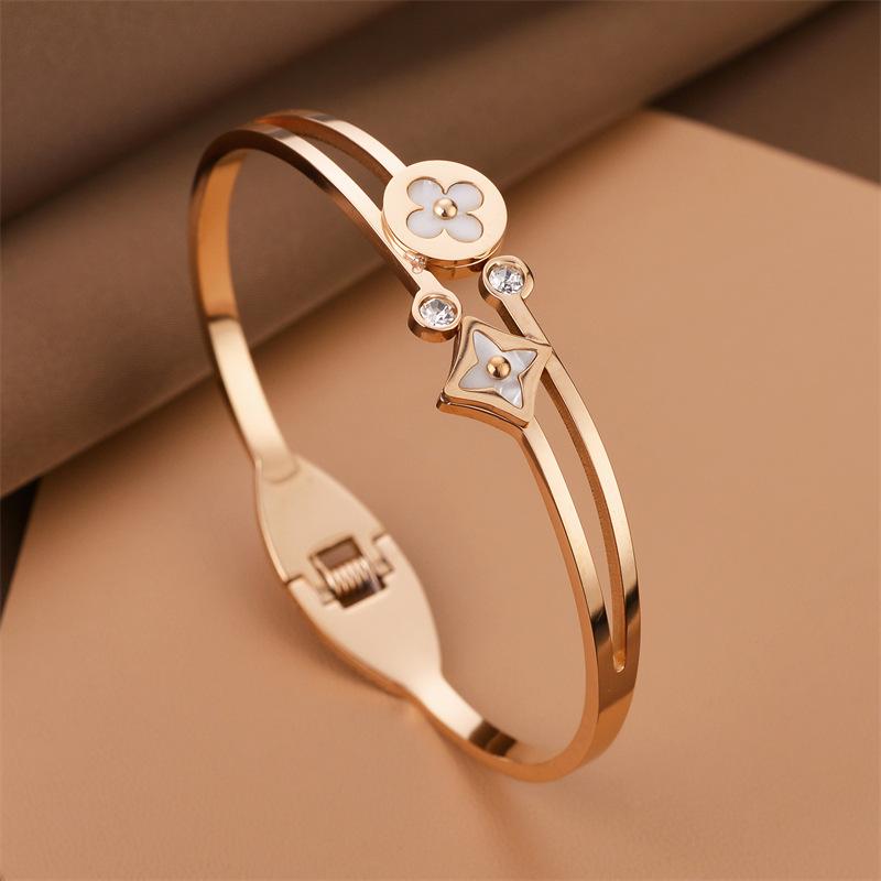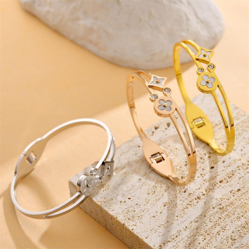 Cross-Border moda estilo coreano não-desbotamento pulseira de aço titânio luxo temperamento simples shell quatro folhas flor pulseira aberta joias