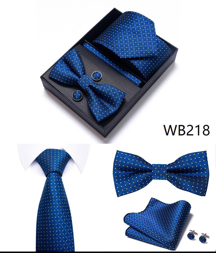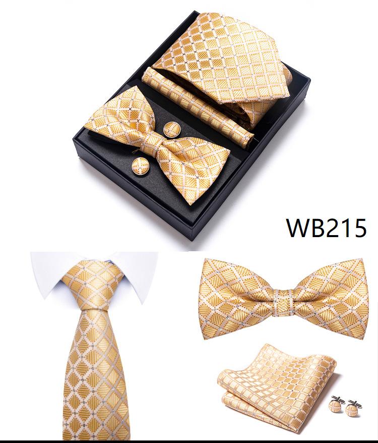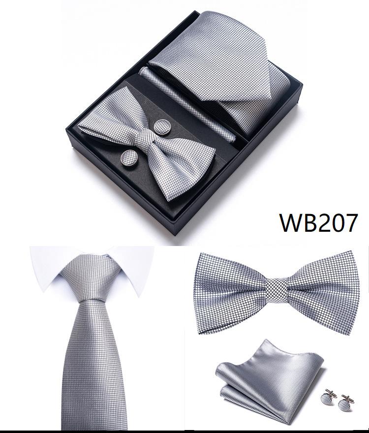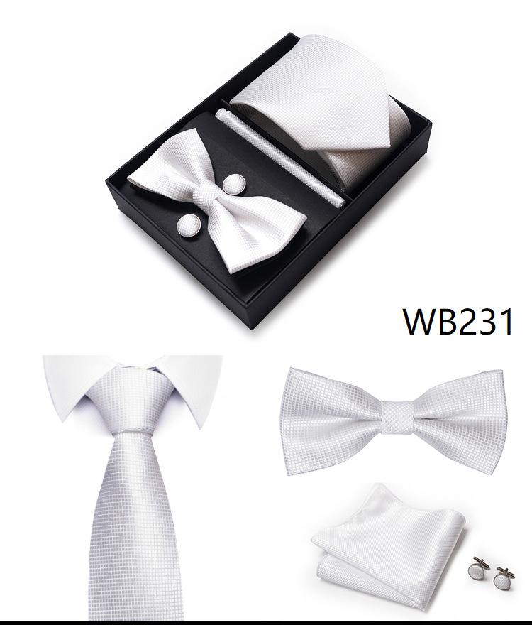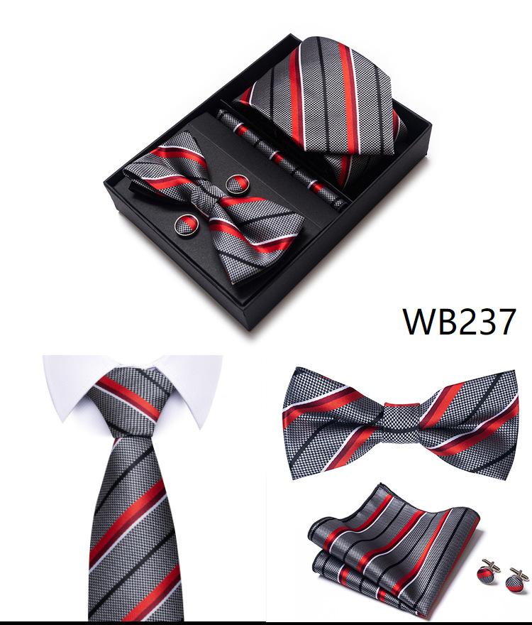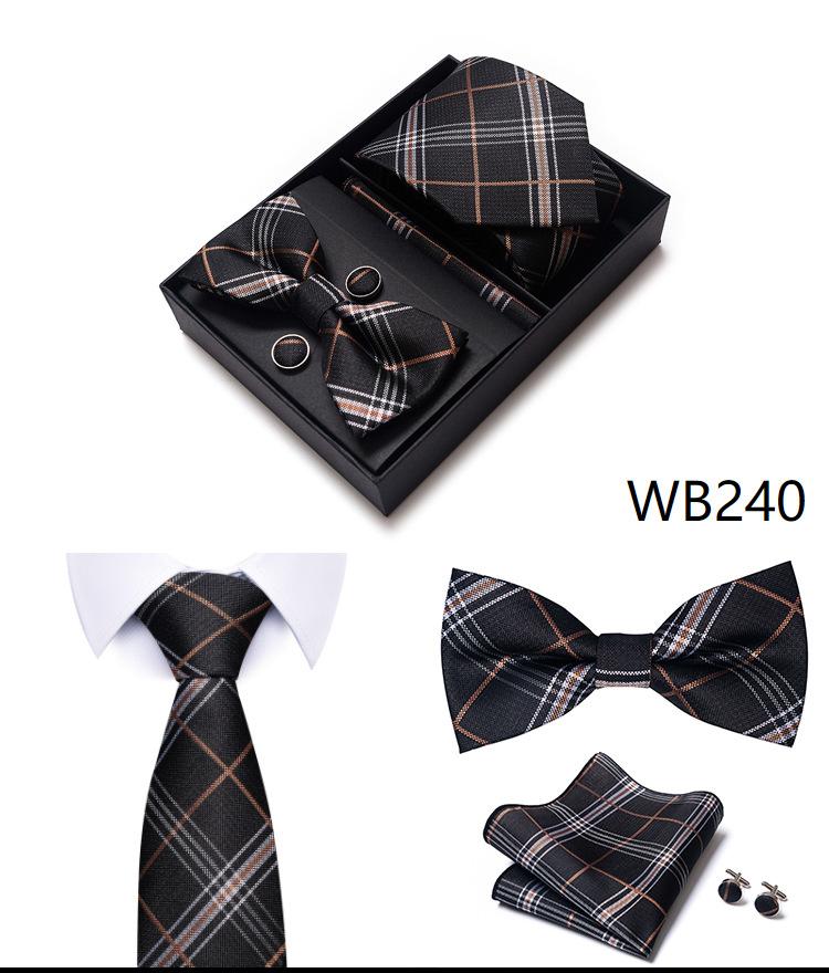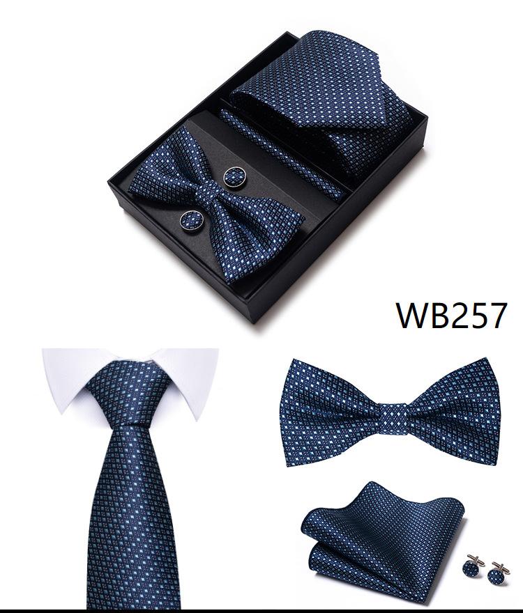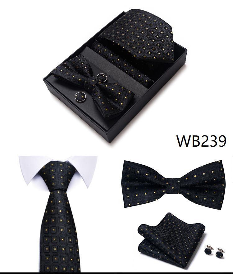 O conjunto inclui gravata, gravata borboleta, lenço, abotoaduras e uma caixa de presente preta.