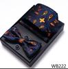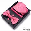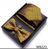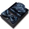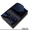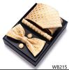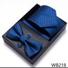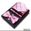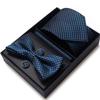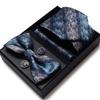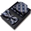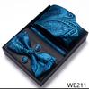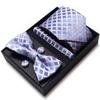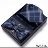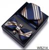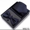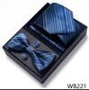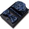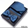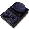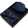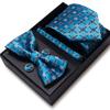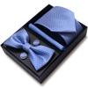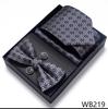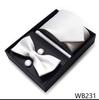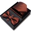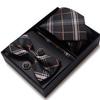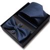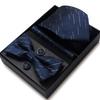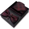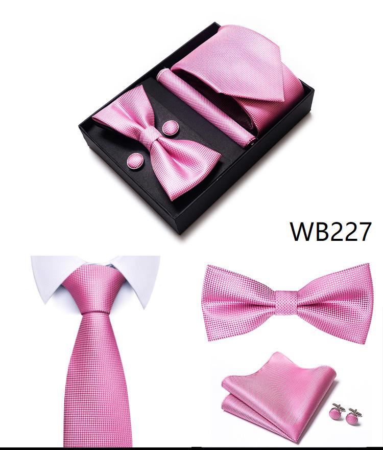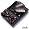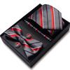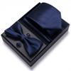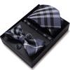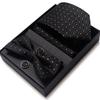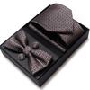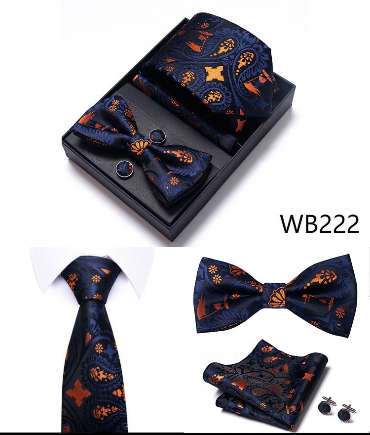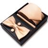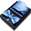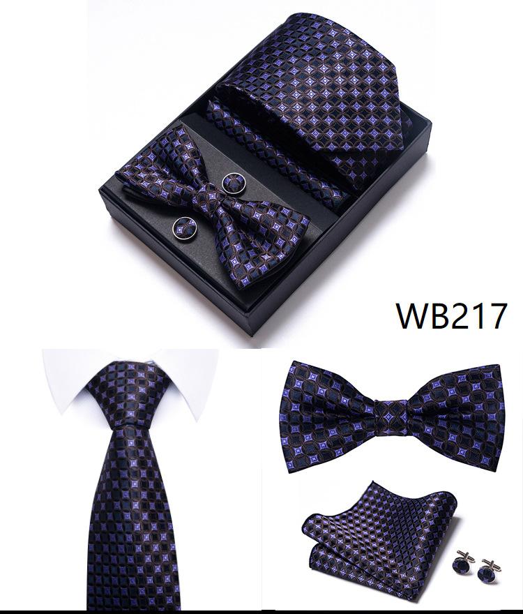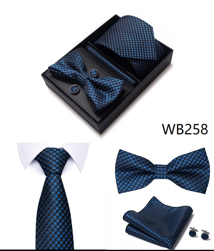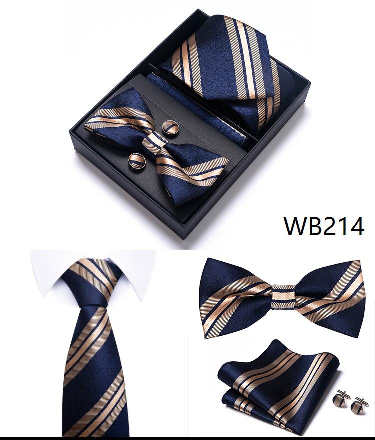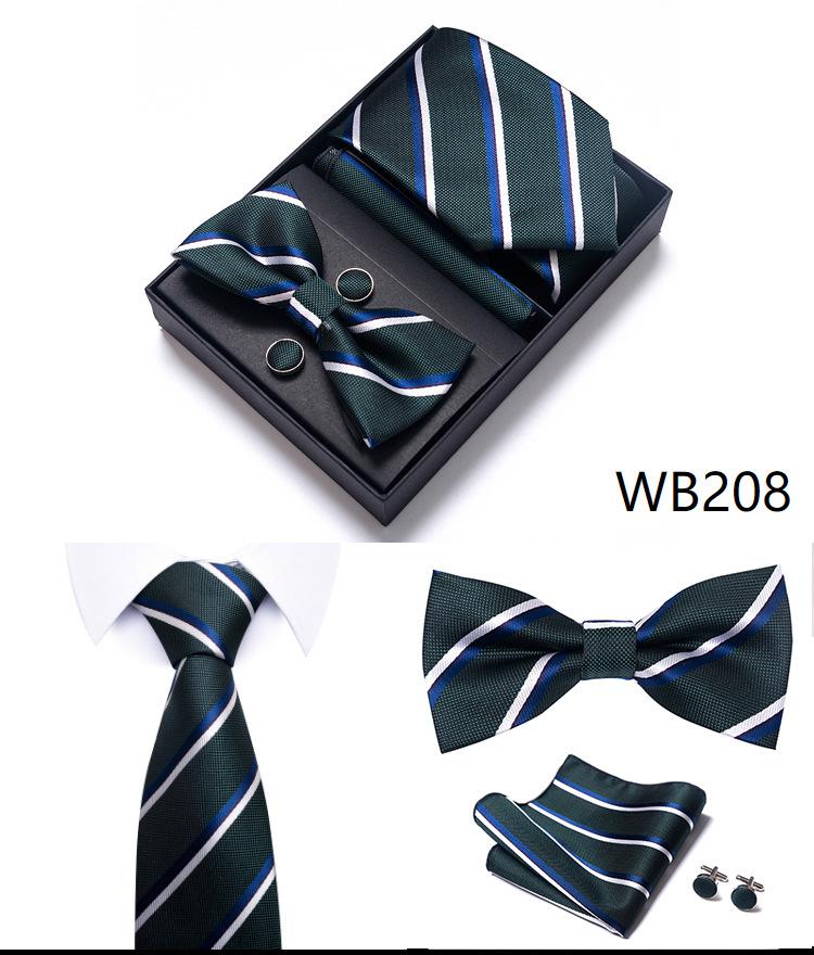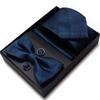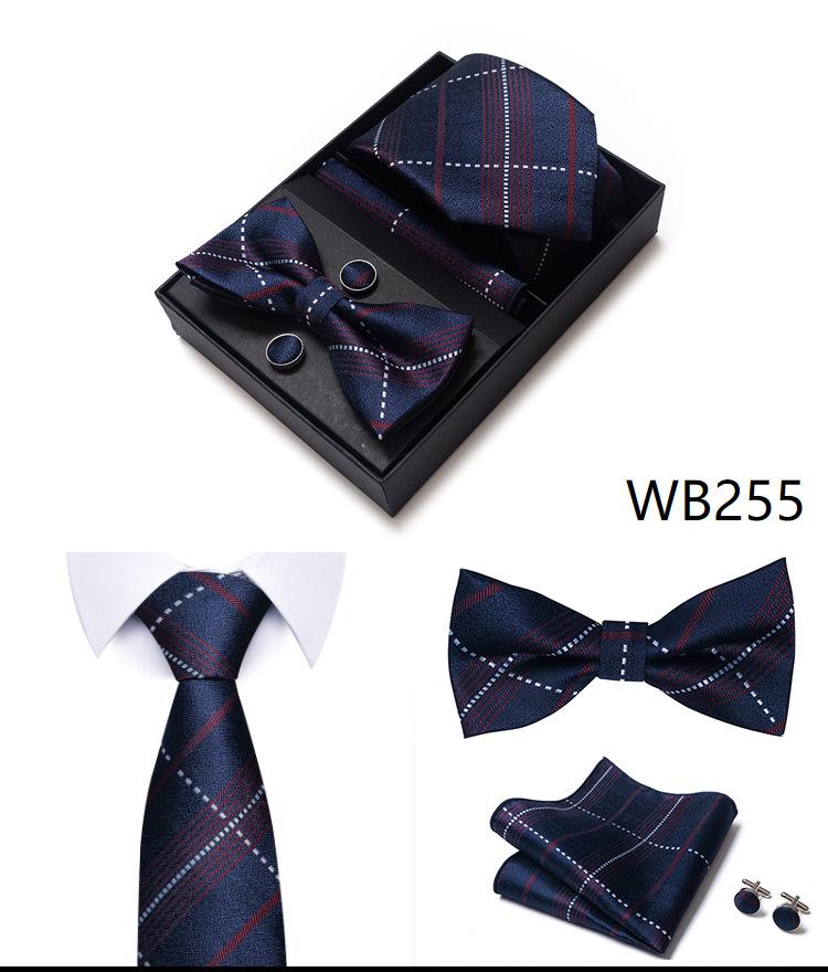O conjunto inclui gravata, gravata borboleta, lenço, abotoaduras e uma caixa de presente preta.