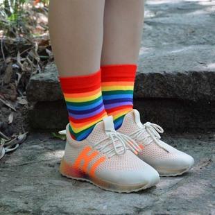 | Meias de cano médio listradas de arco-íris, meias de algodão longas de espessura média, meias femininas na altura do joelho, tamanho único, meias para desfile de moda |