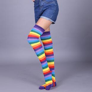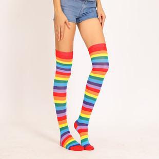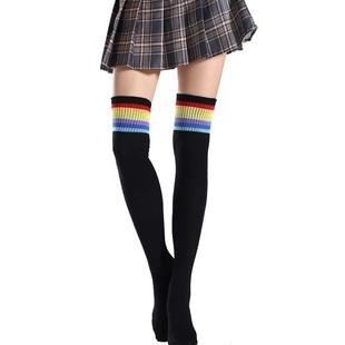 | Meias longas de algodão com listras arco-íris do AliExpress Ebay, tamanho grande, acima do joelho, lindas meias para as pernas |