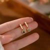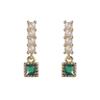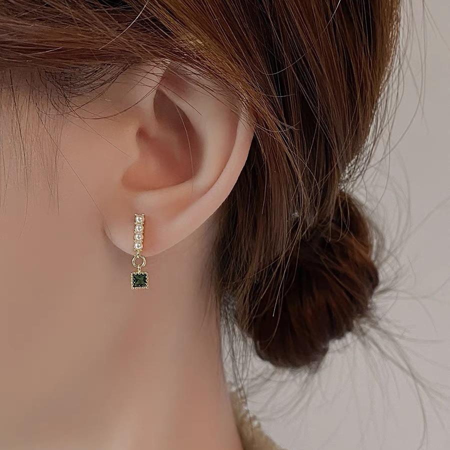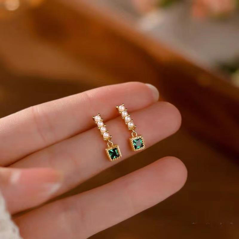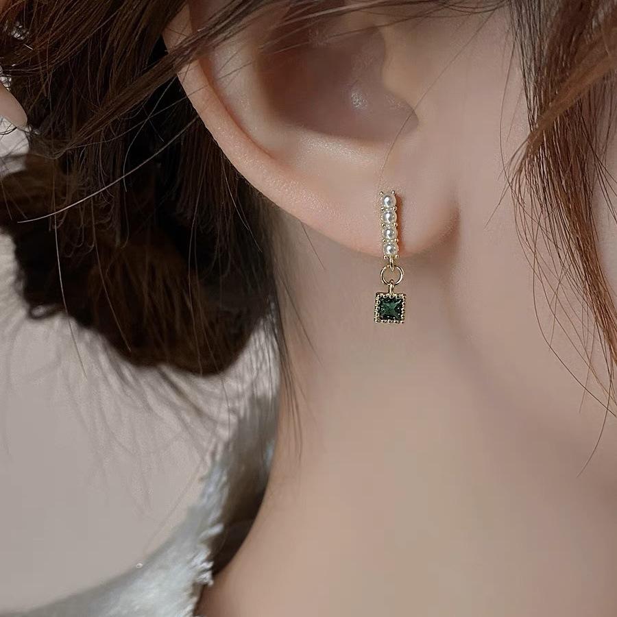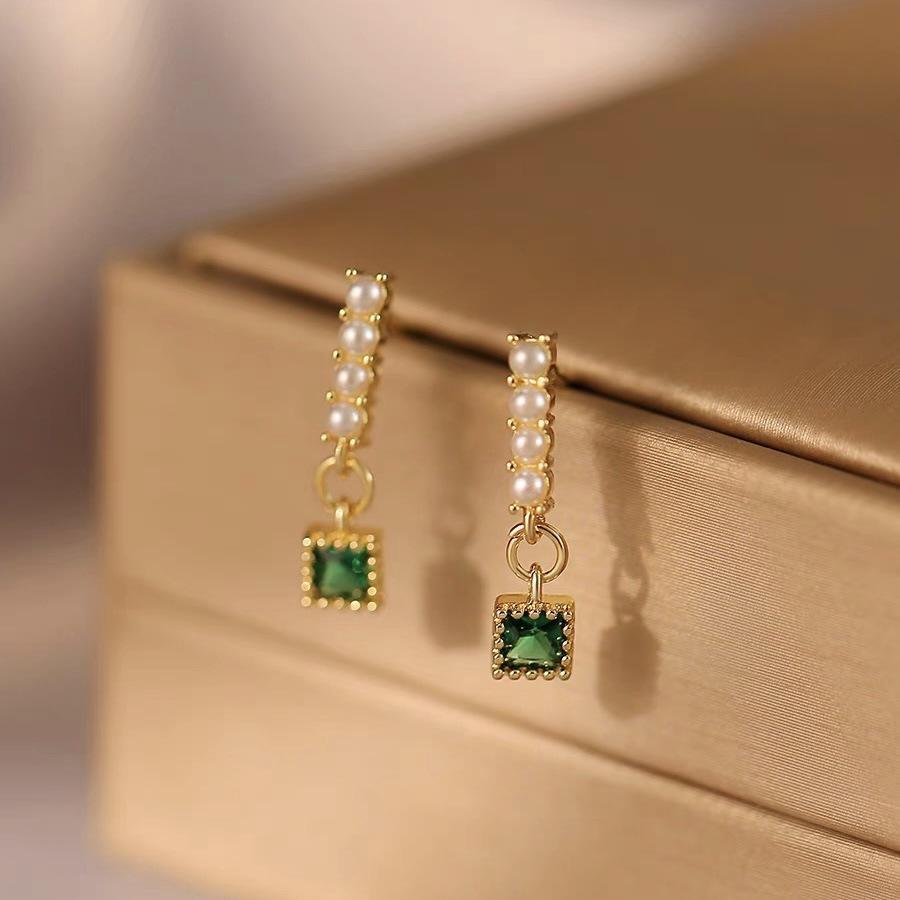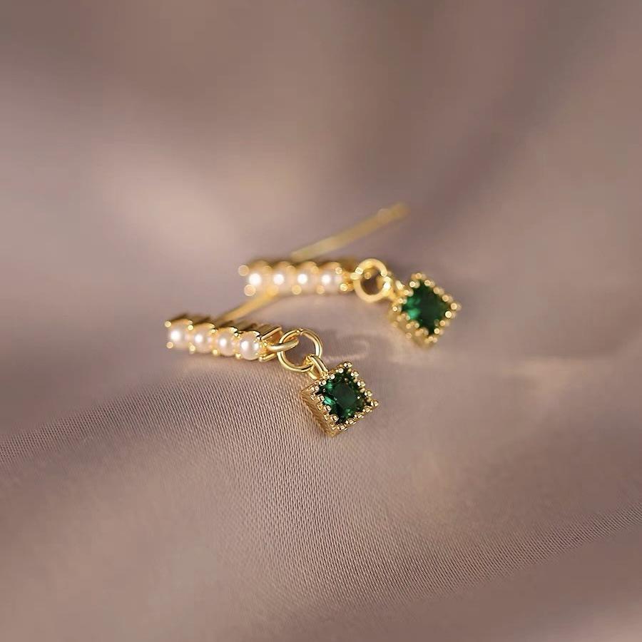 Brincos Quadrados Pérola Esmeralda Simples Vintage para Nicho Feminino Design Sense Brincos Elegantes Pequenos e Requintados