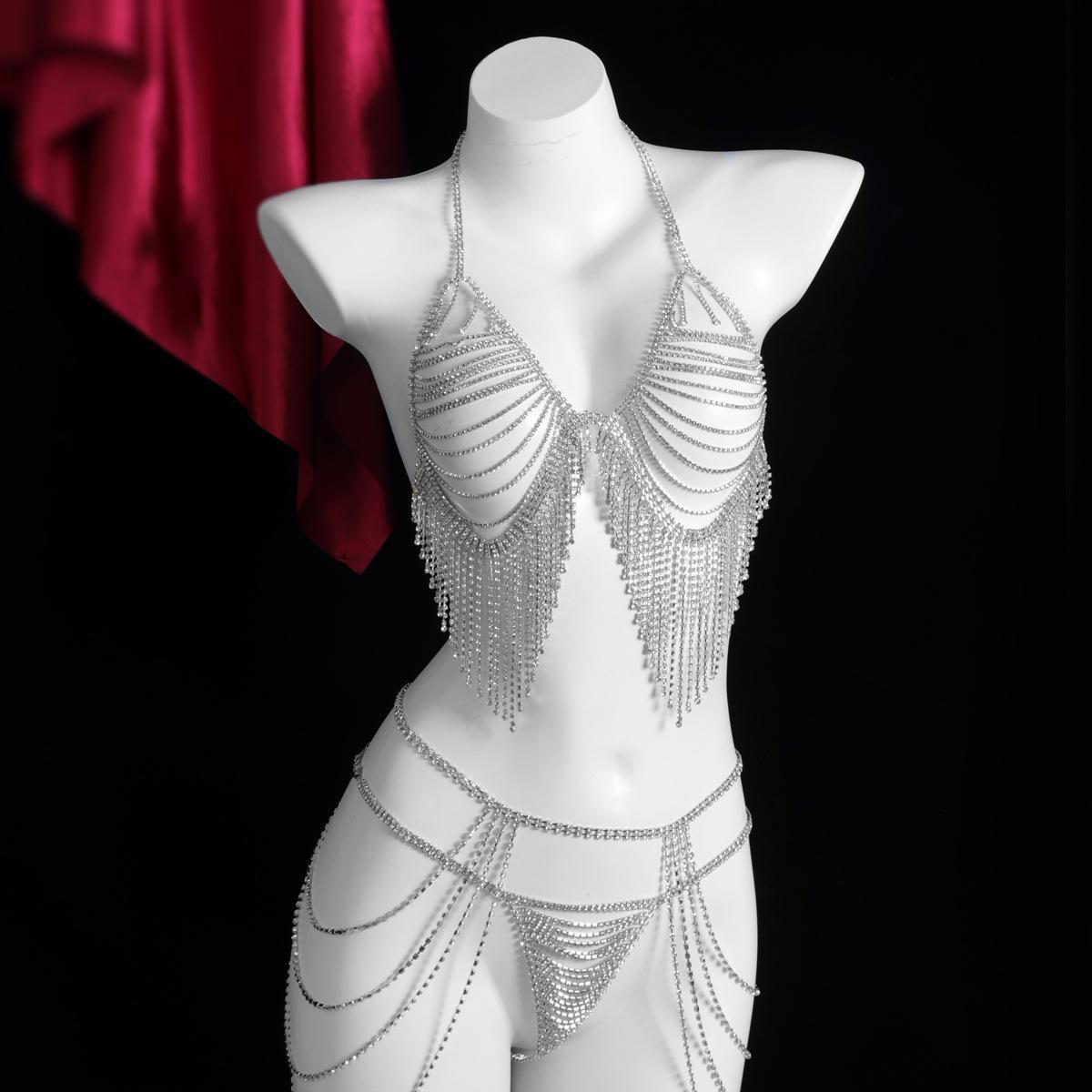 Sutiã de biquíni sexy europeu e americano com strass, acessórios de corrente, borla quente transfronteiriça multicamadas, corrente de corpo divertida para boate