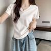 Camiseta Branca de Manga Curta Feminina Verão Ombro Direito Design Slim Top Exposto Clavícula Gola V Curta Assimétrica Slim