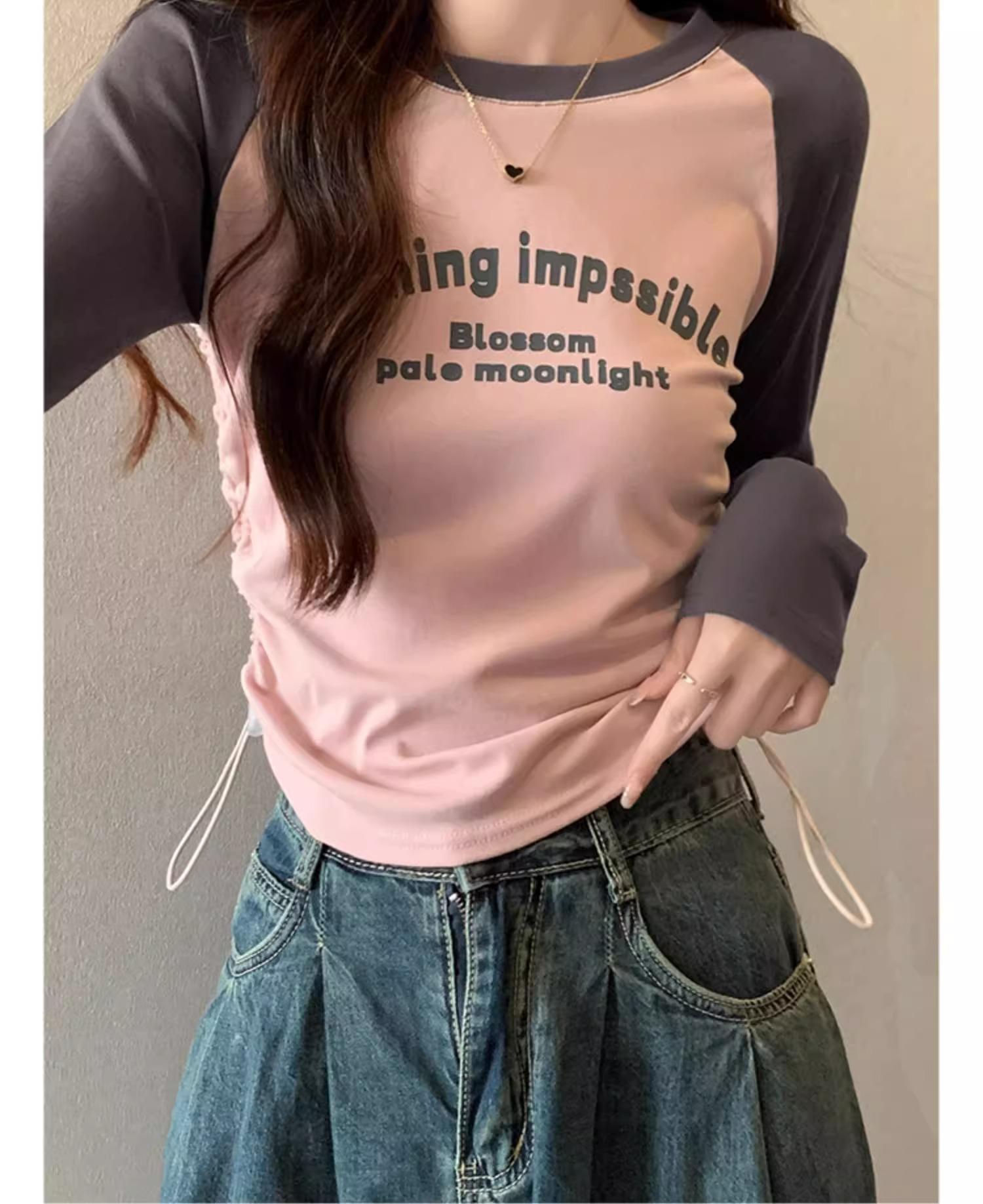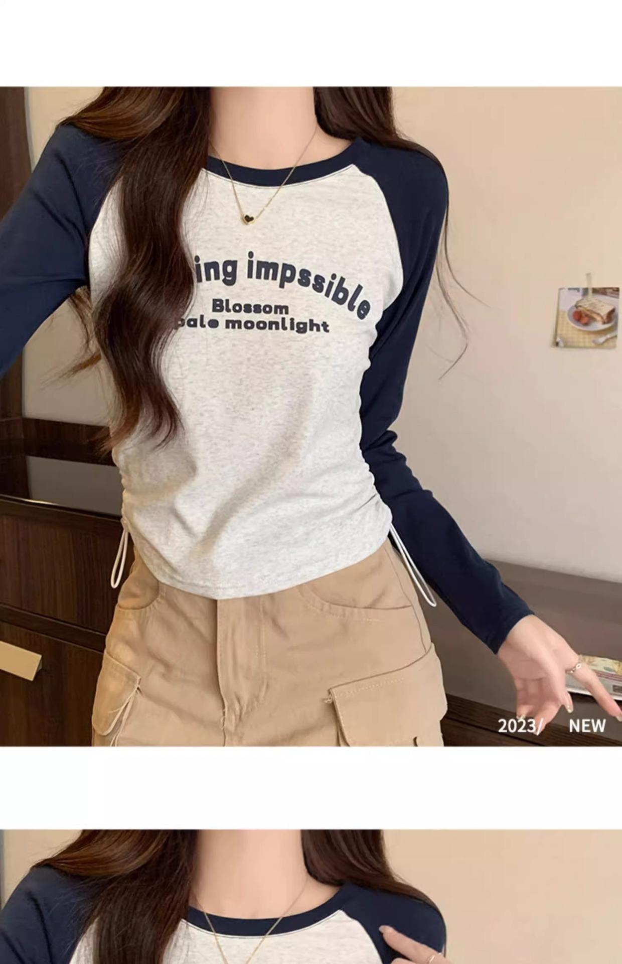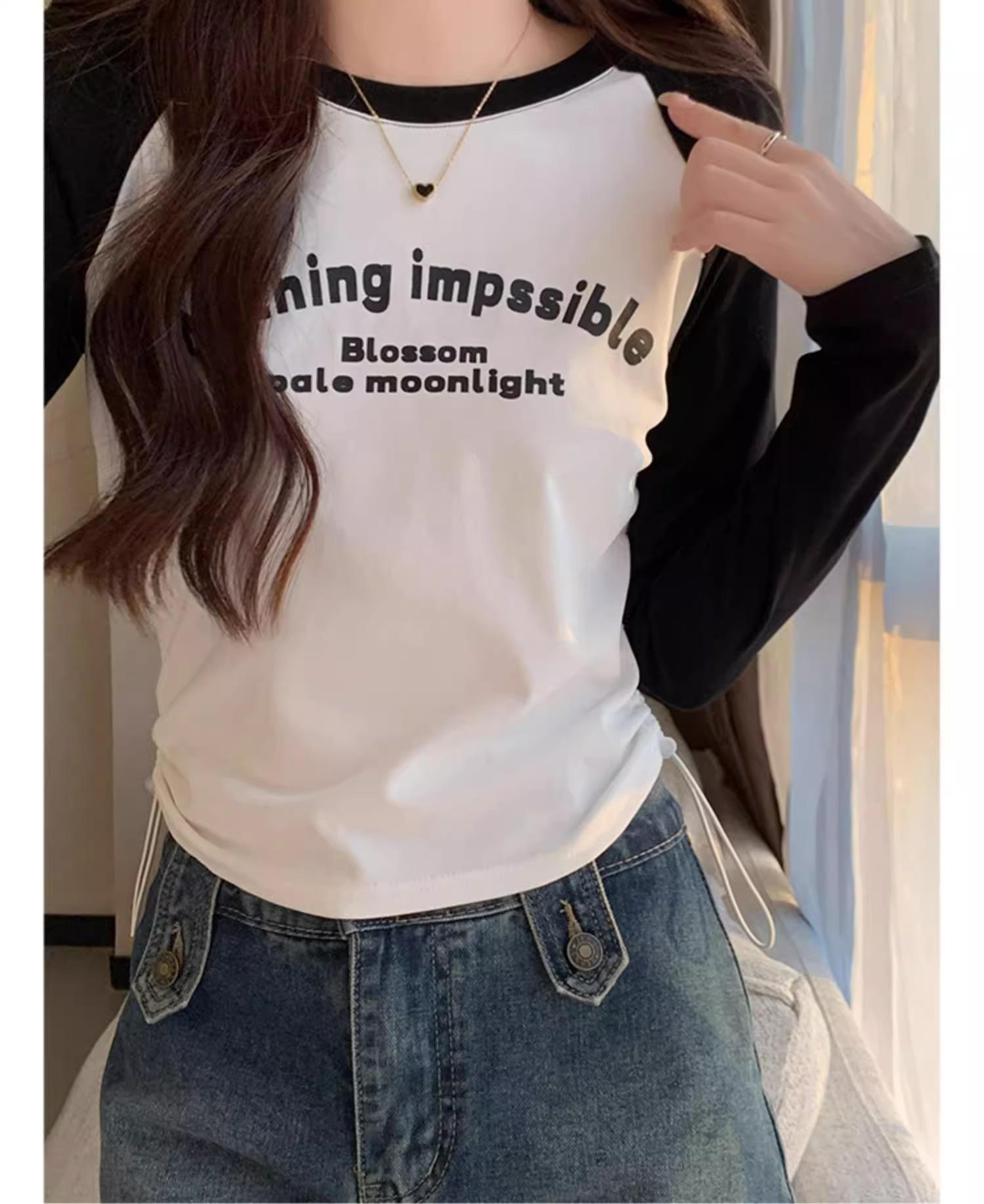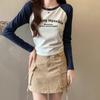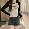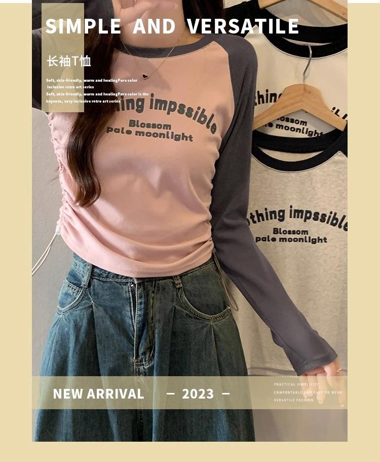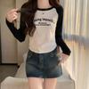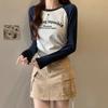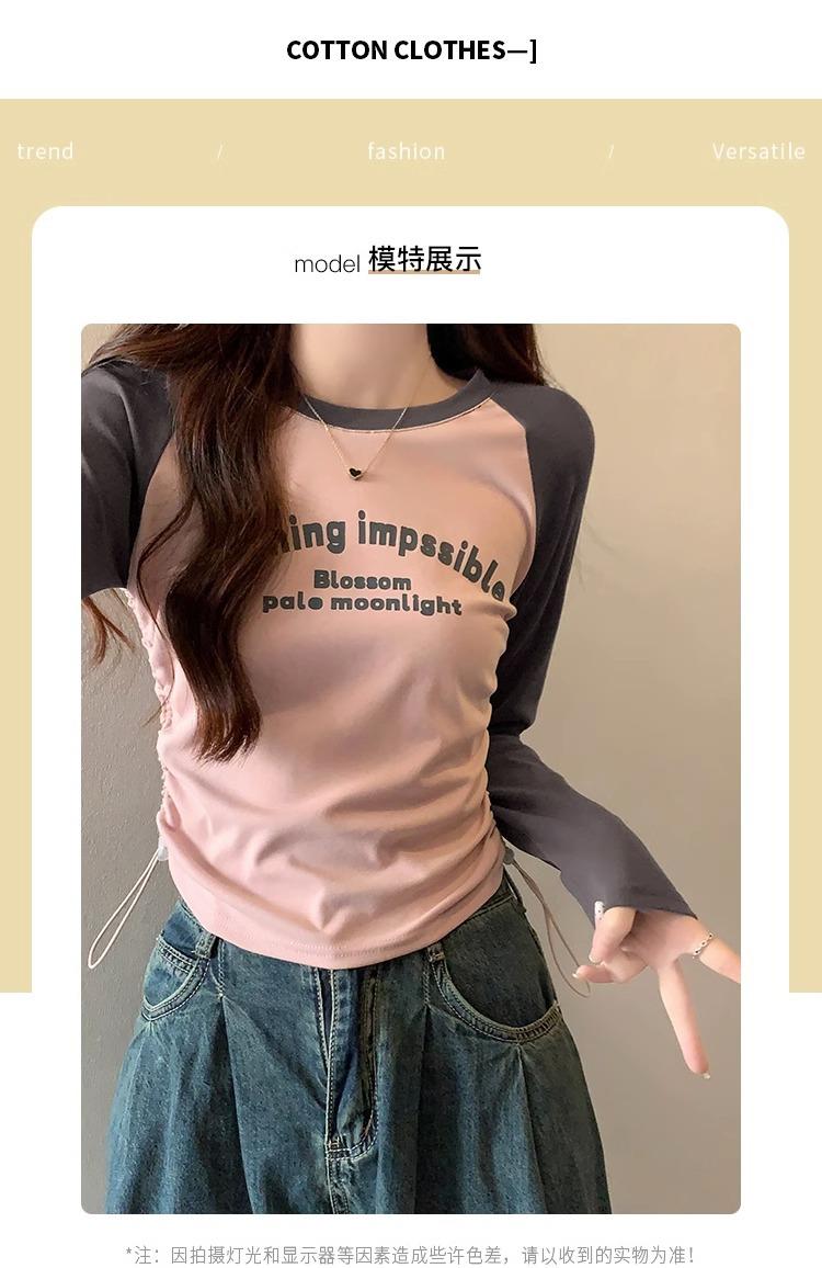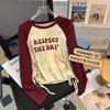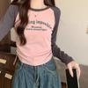 Carta de estilo americano estampada camiseta de manga comprida design feminino cor de contraste raglan manga algodão cordão cintura emagrecimento top outono