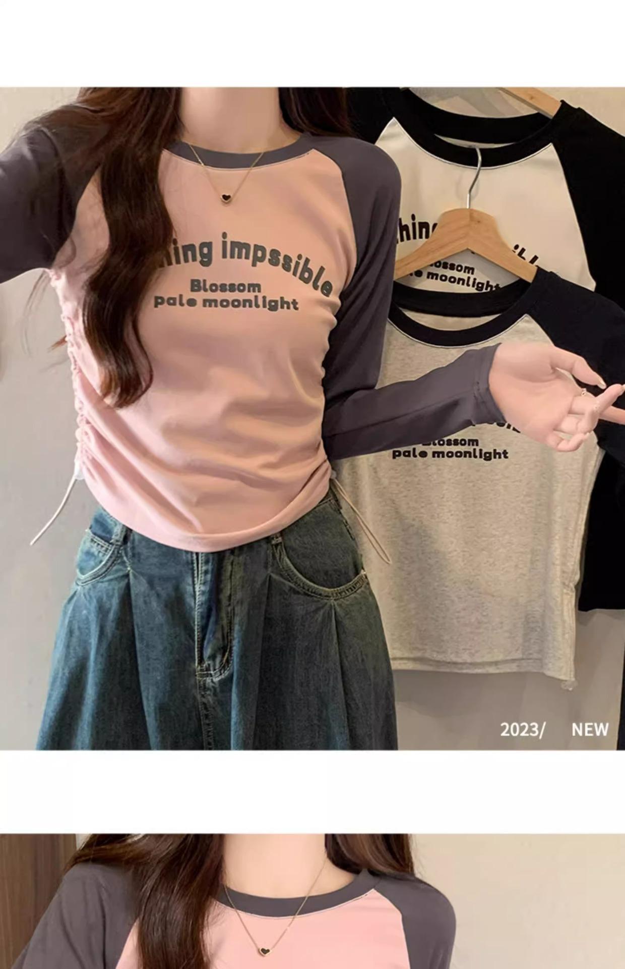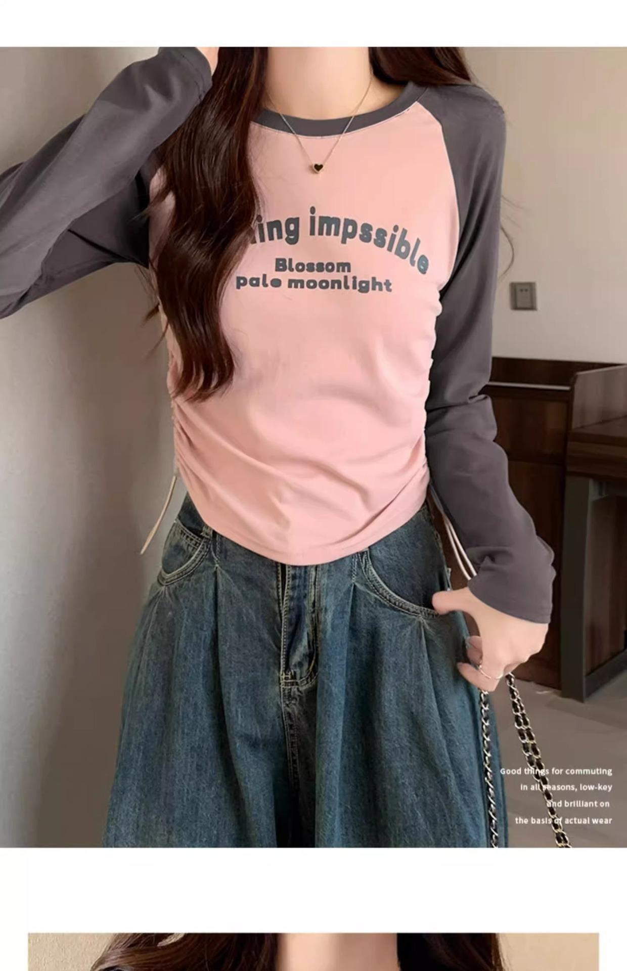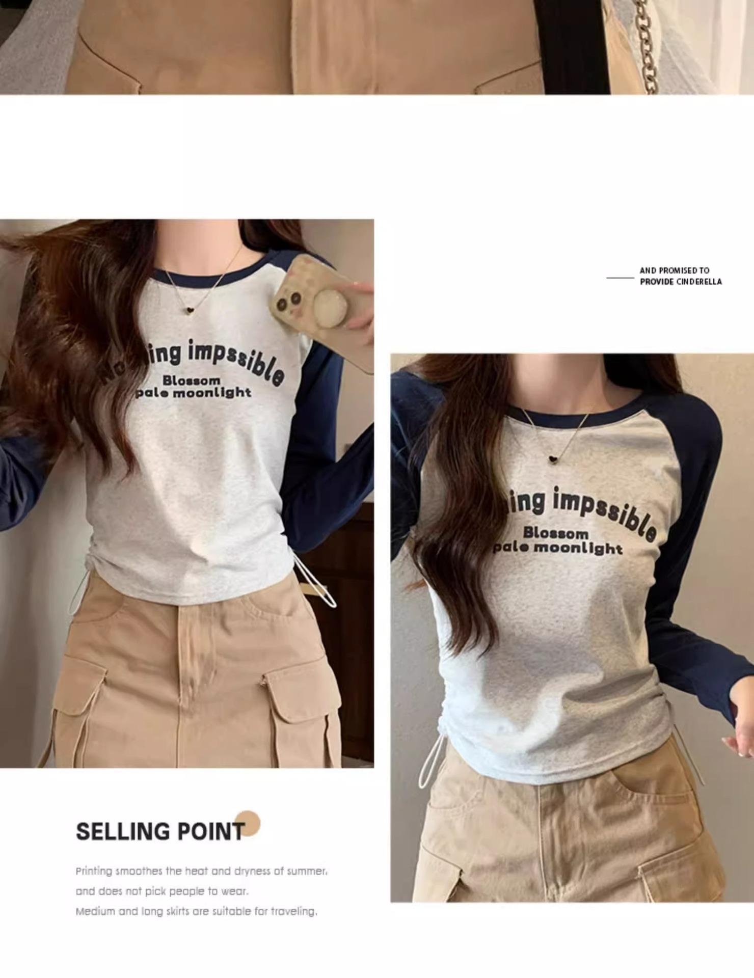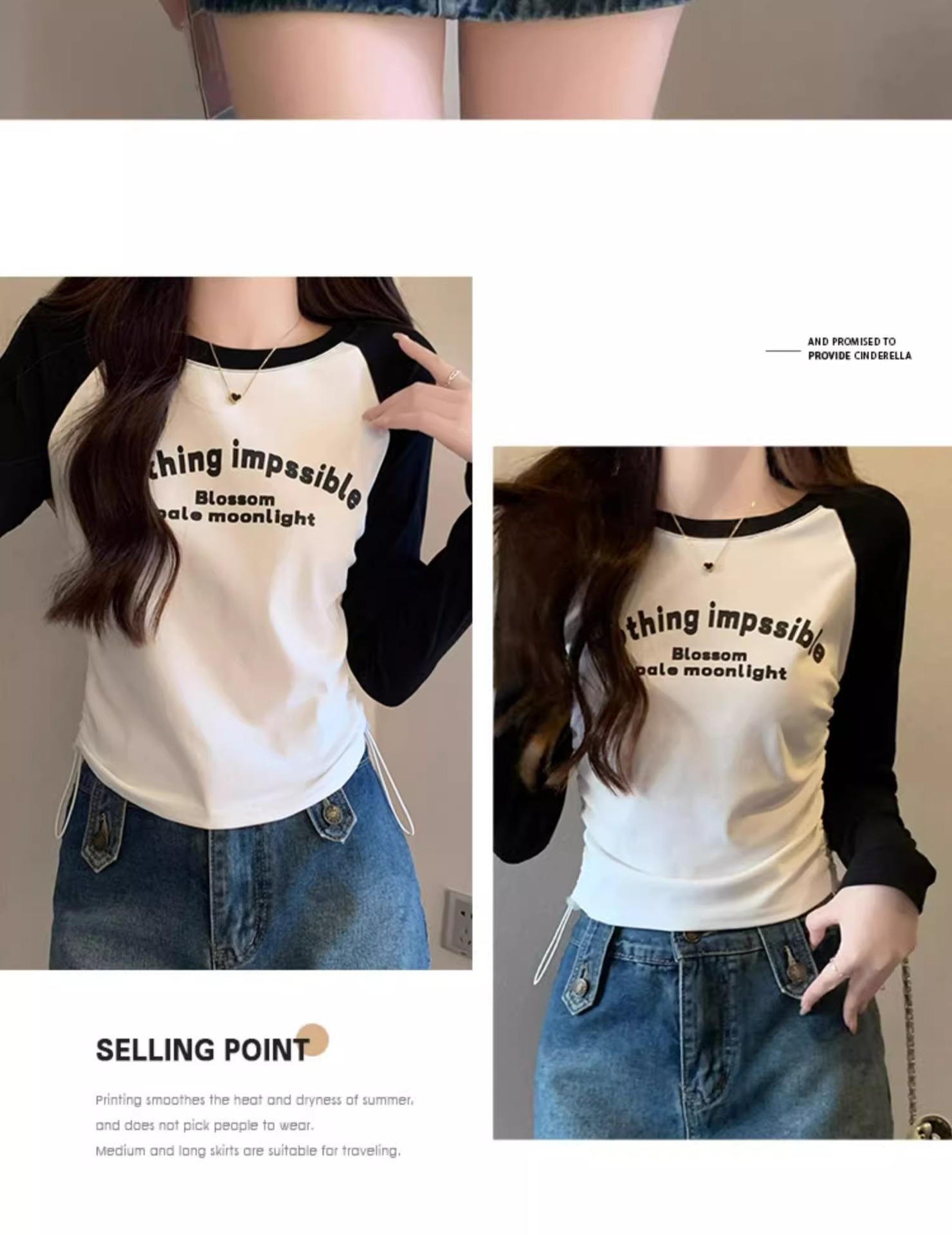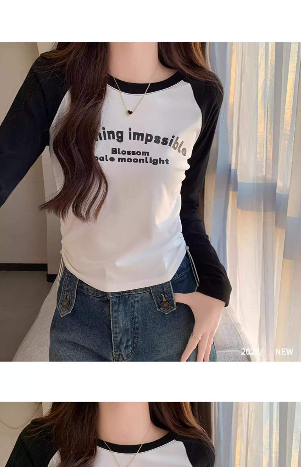 Carta de estilo americano estampada camiseta de manga comprida design feminino cor de contraste raglan manga algodão cordão cintura emagrecimento top outono