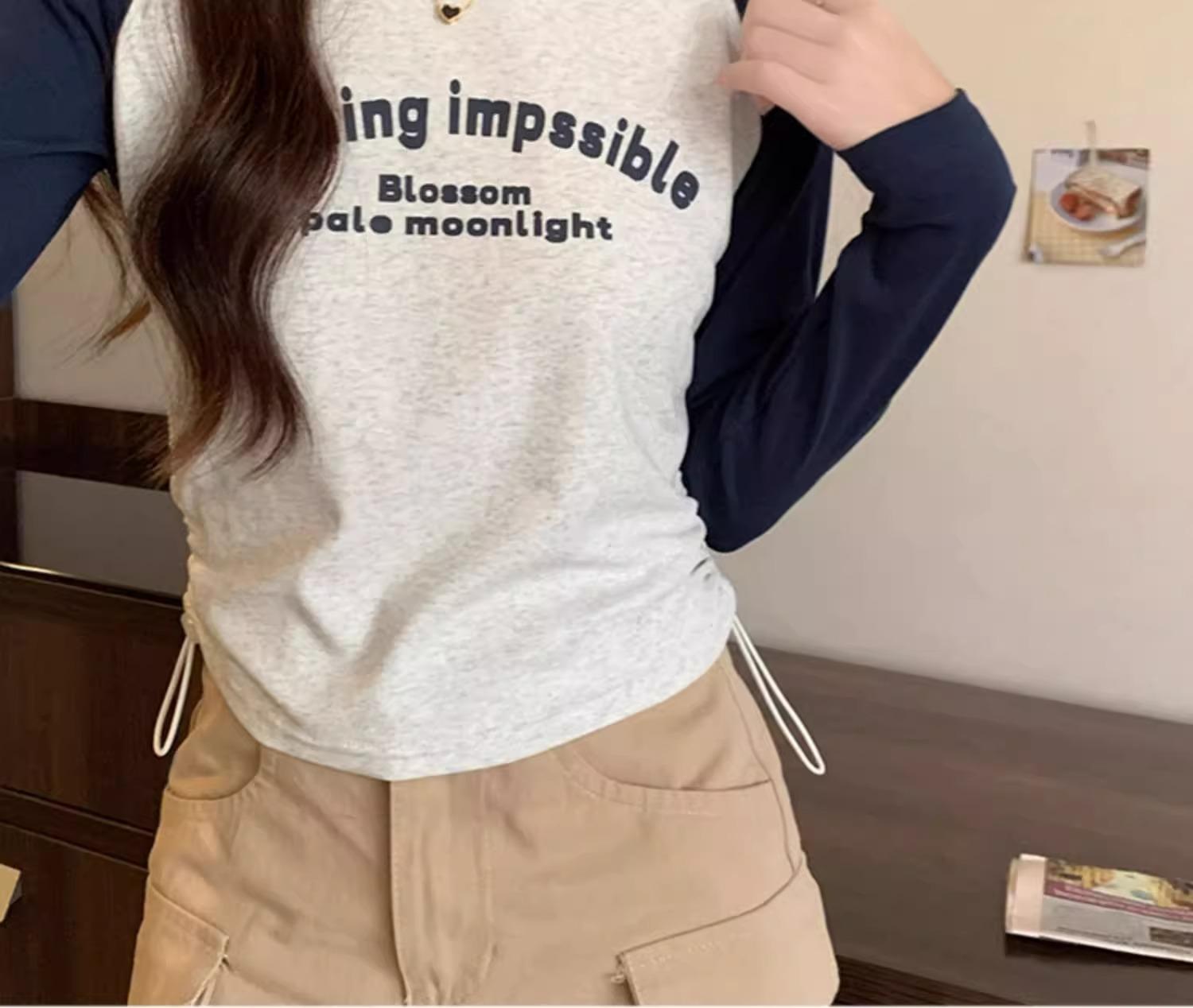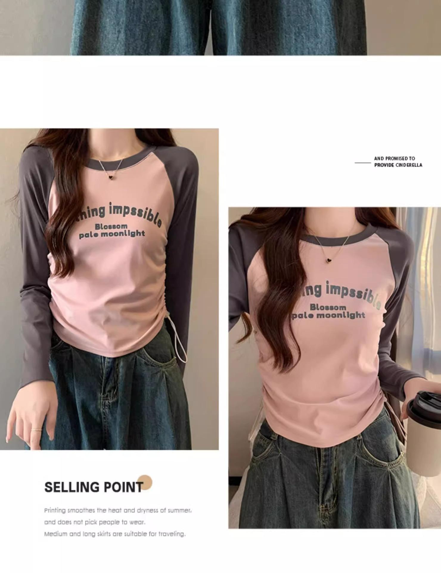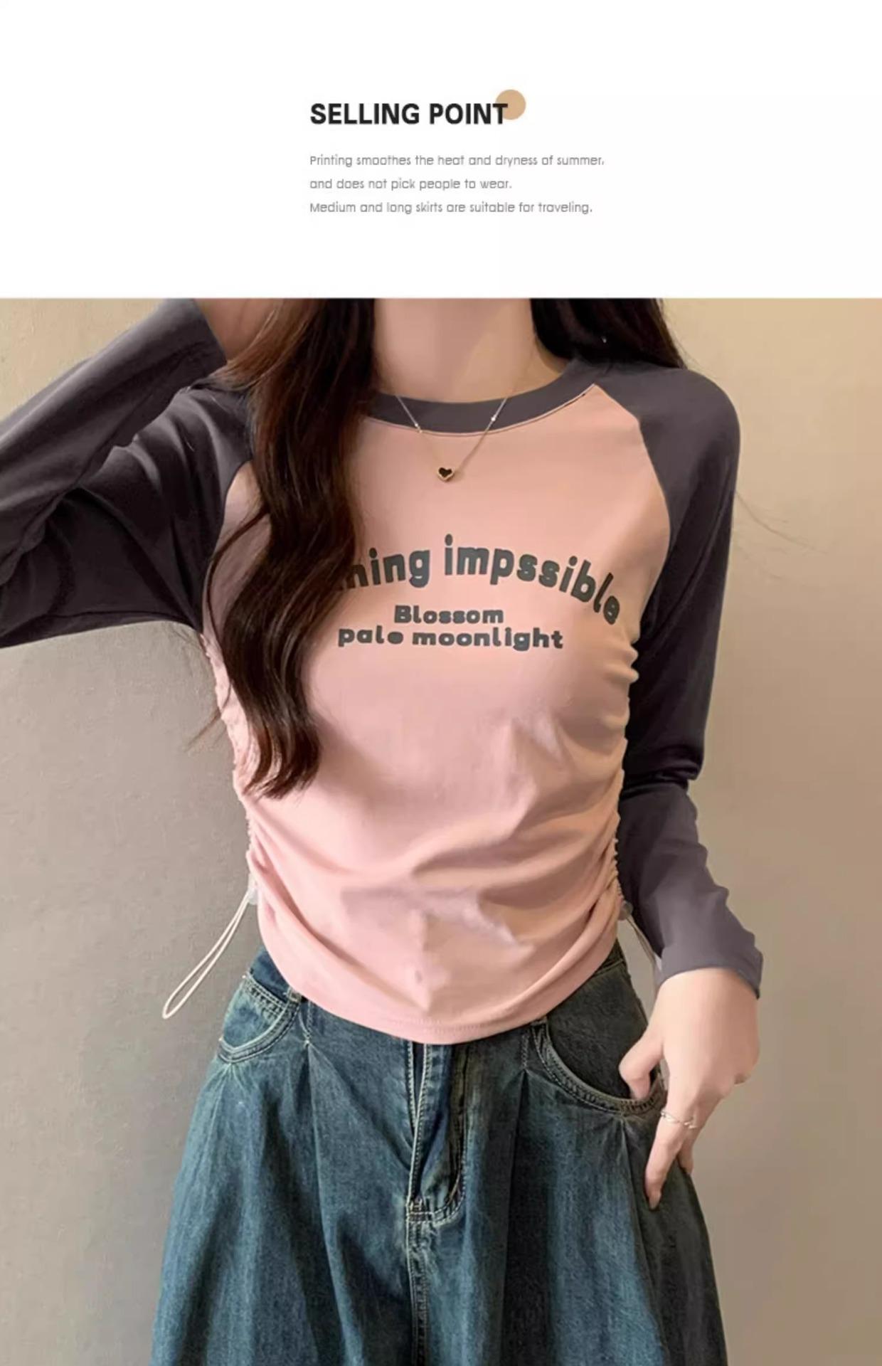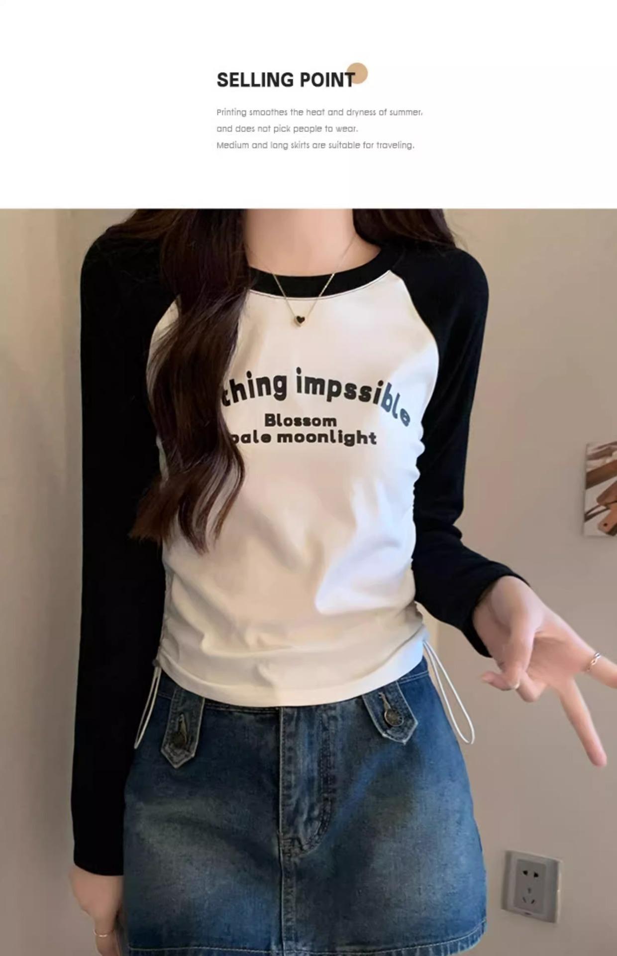 Carta de estilo americano estampada camiseta de manga comprida design feminino cor de contraste raglan manga algodão cordão cintura emagrecimento top outono