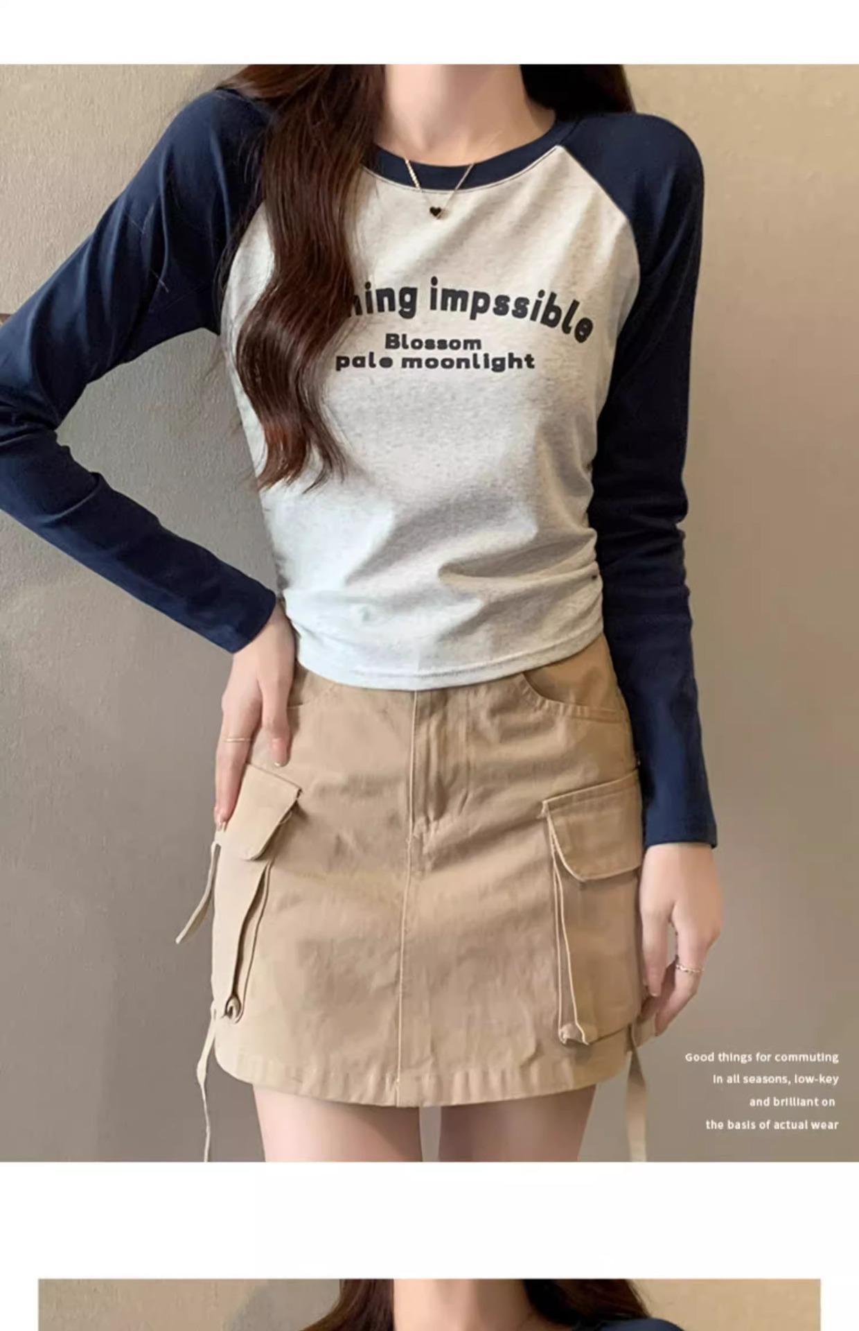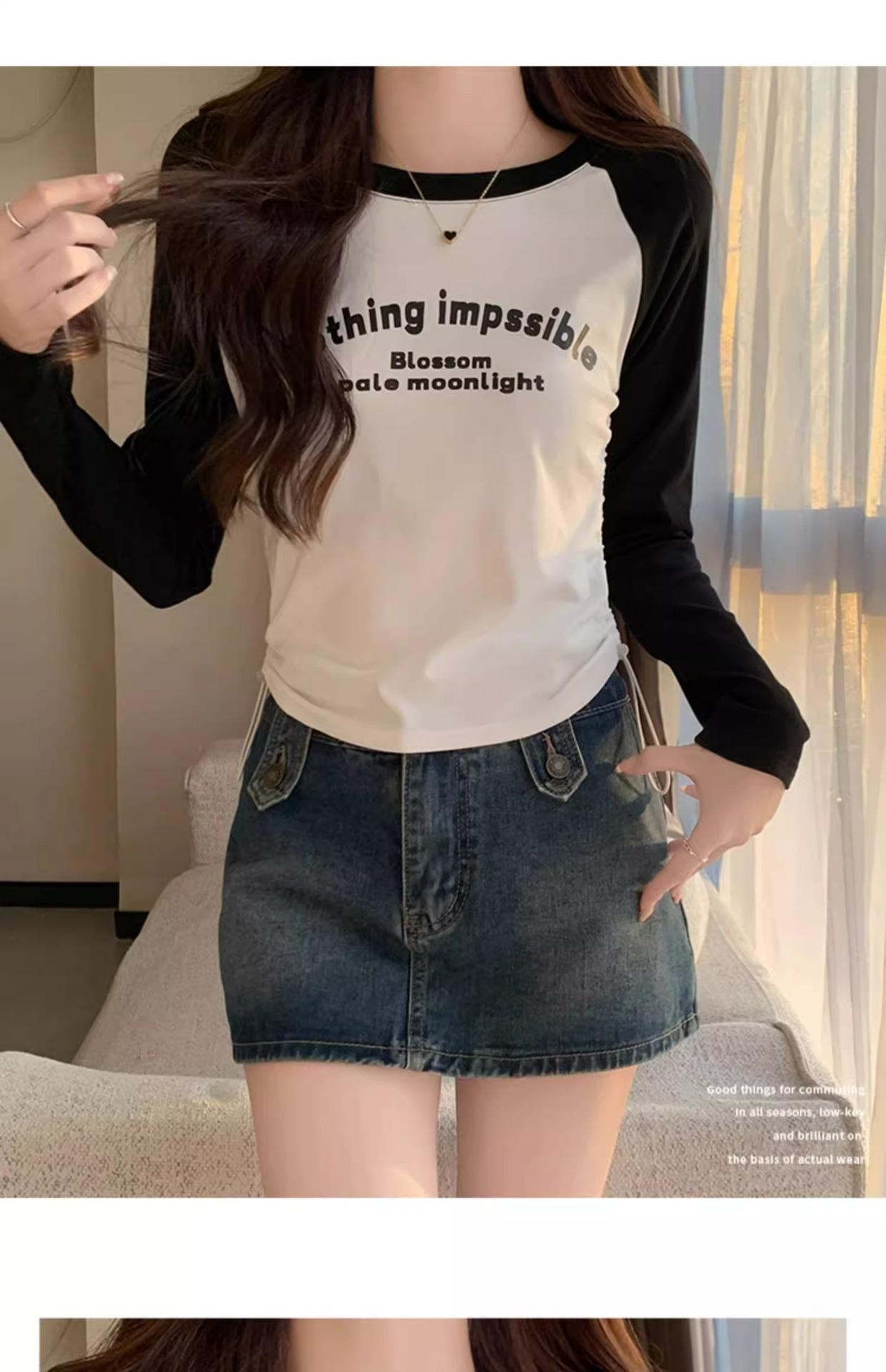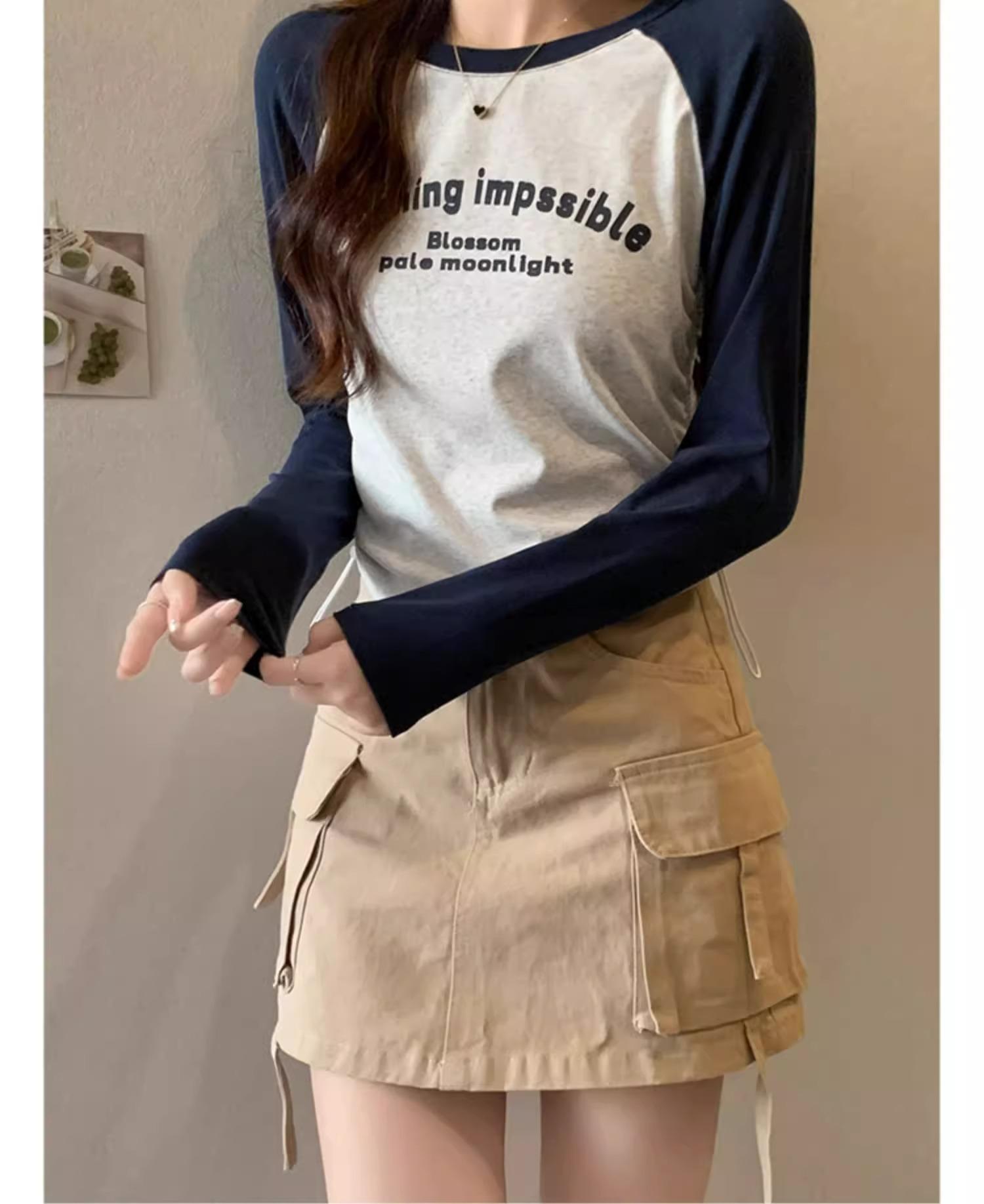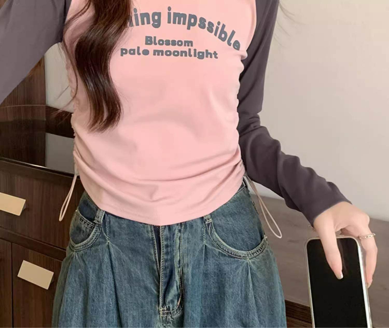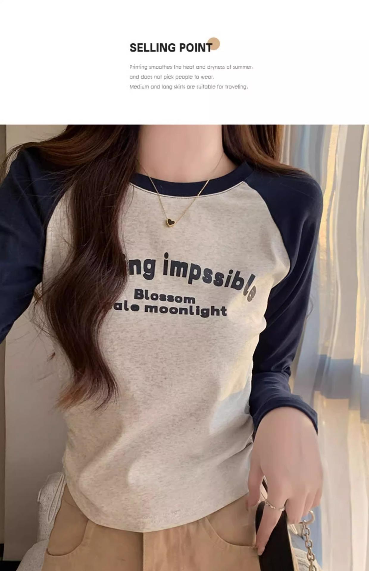 Carta de estilo americano estampada camiseta de manga comprida design feminino cor de contraste raglan manga algodão cordão cintura emagrecimento top outono