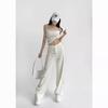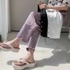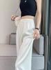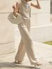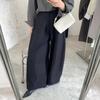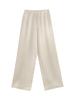 Calças largas cobrem a carne da coxa e as pernas dobradas
