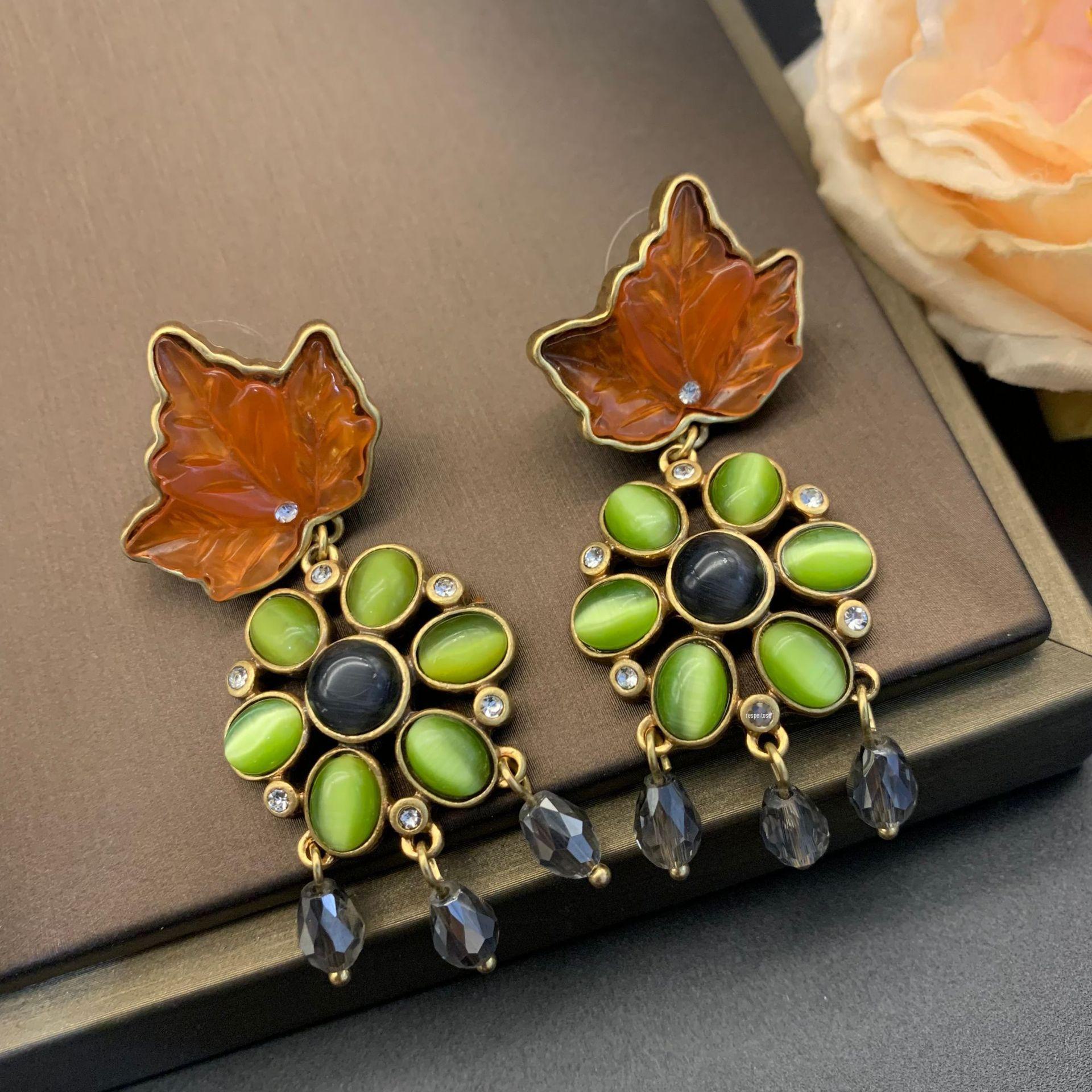 [Late Autumn Traceless] vintage Retro Long Flower Brincos Nicho Entry Luxury Middle Ancient Set Brincos de pedra de olho de gato