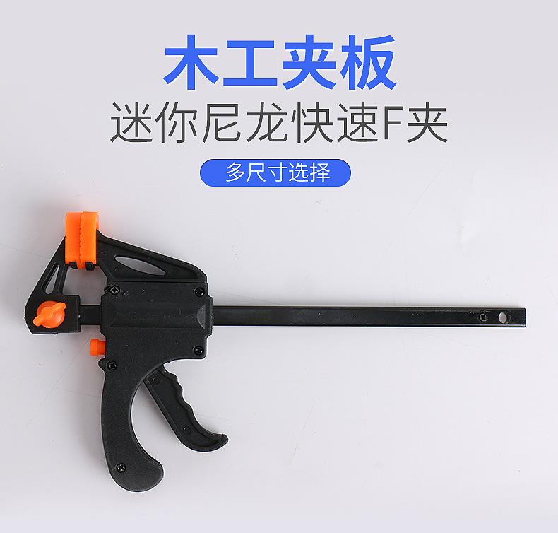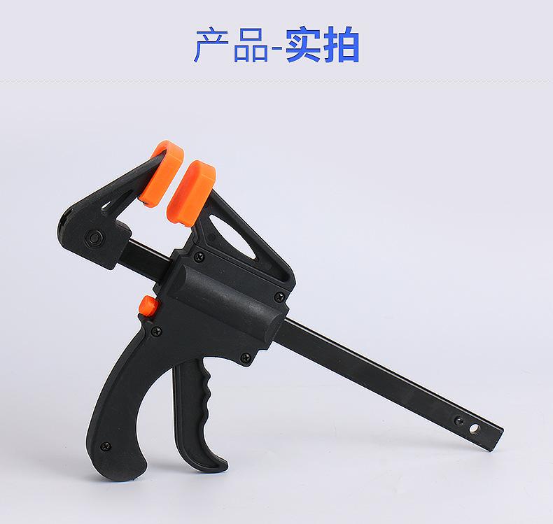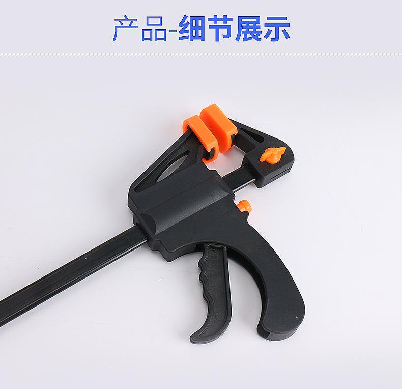 Especificações de 4 polegadas: O comprimento total da braçadeira F é de cerca de 195 mm, a profundidade da boca da braçadeira é de cerca de 32 mm, a distância máxima de abertura é de cerca de 100 mm e o peso é de cerca de 70g. Tamanho da embalagem: 200*64mm