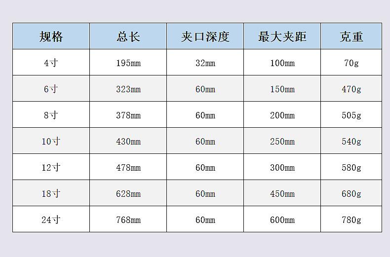 Especificações de 8 polegadas: comprimento total do clipe F de cerca de 378 mm, profundidade do clipe de 60 mm, distância máxima de abertura de cerca de 200 mm, peso de cerca de 505g. Tamanho da embalagem: 380*120mm