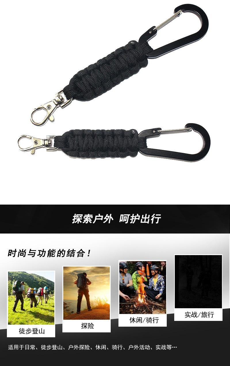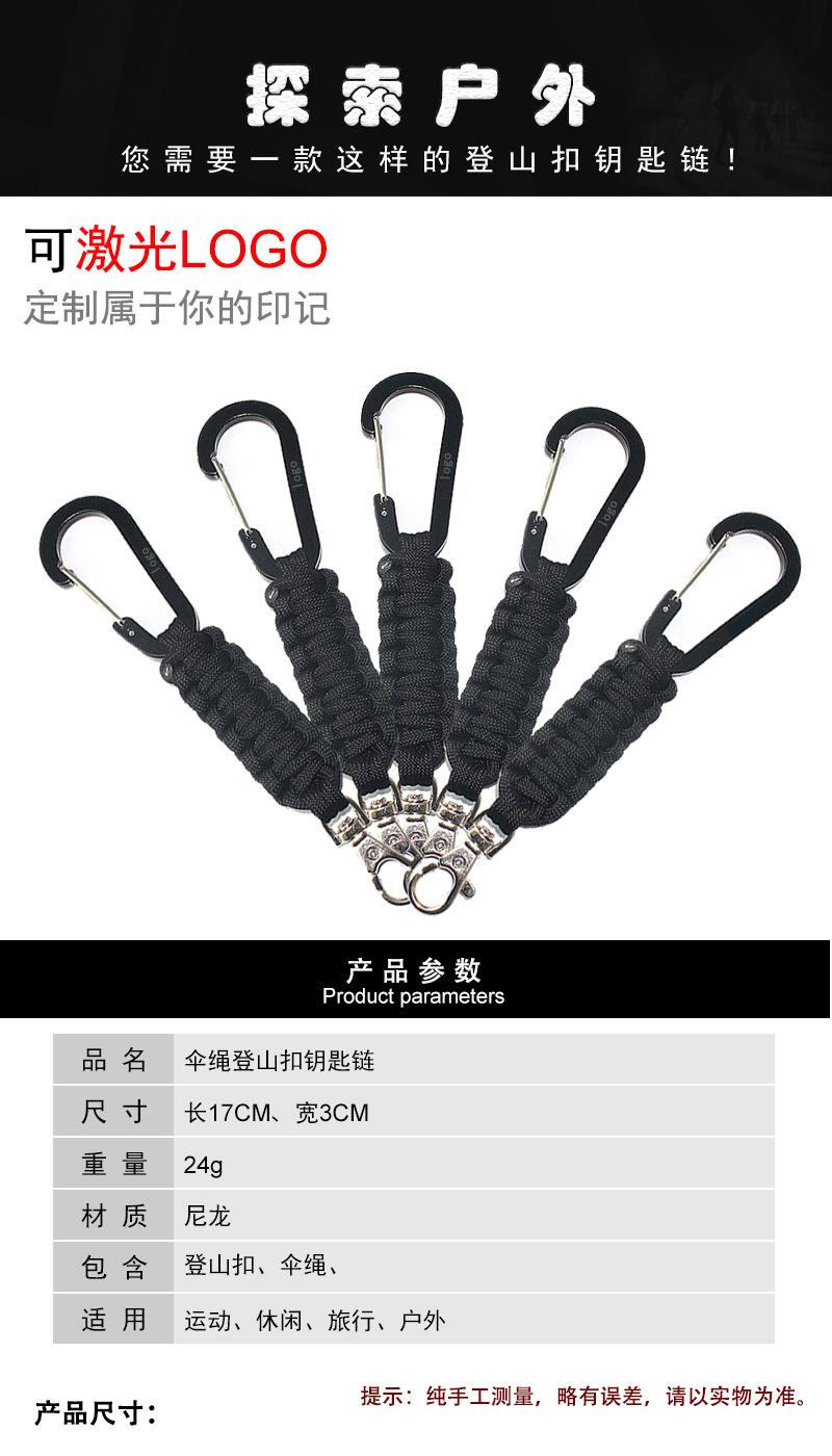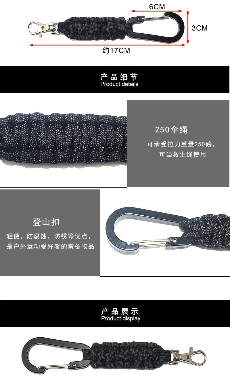 O chaveiro com fivela dupla de montanhismo de aventura e sobrevivência suporta logotipo personalizado, cor, embalagem, cartão de papel e outros serviços. O chaveiro de corda de pára-quedas é um bom ajudante para aventuras e sobrevivência ao ar livre. O chaveiro de liga de zinco permite que o chaveiro seja pendurado em uma mochila, que é leve e portátil em viagens. A corda do pára-quedas pode ser desmontada e usada separadamente e pode suportar uma tensão de cerca de 250 libras. A corda do pára-quedas contém 7 núcleos que podem ser puxados e usados separadamente. É uma boa opção para consertar barracas, fazer linhas de pesca, etc.!