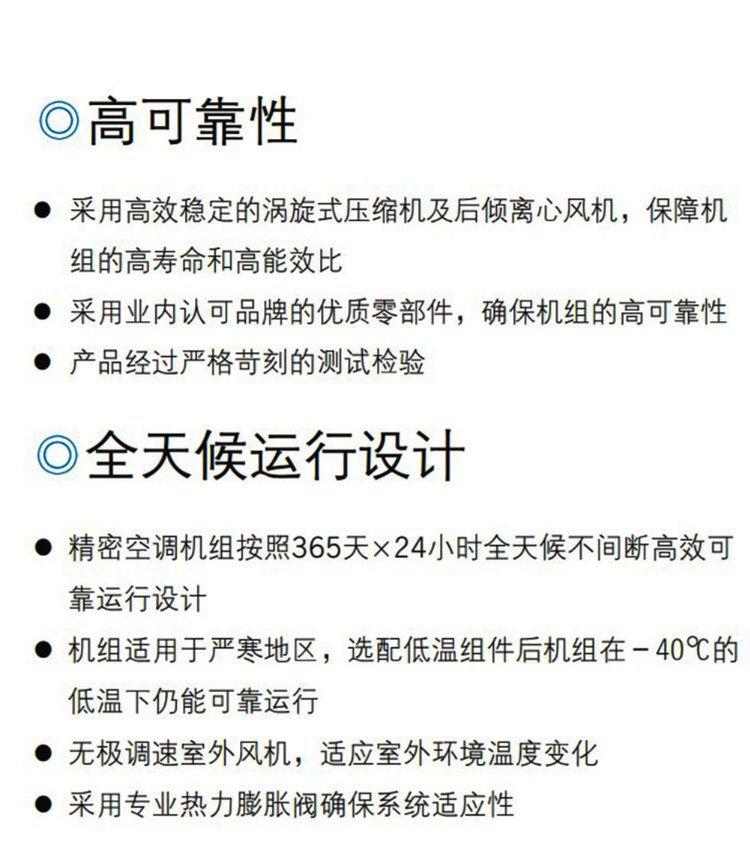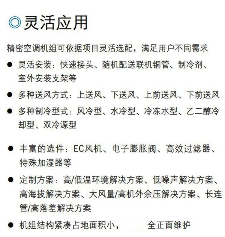 As unidades de ar condicionado da série STATIONAIR adotam um sistema de controle de microcomputador inteligente, uma tela grande em chinês e possuem proteção por senha de vários níveis e funções de diagnóstico de falhas. Equipado com função de inicialização automática ao receber chamada, proteção contra sobretensão e subtensão e outras funções, o funcionamento normal da unidade é garantido imediatamente. Pode suportar monitoramento remoto e está equipado com uma placa RS485. A unidade também pode realizar a comutação automática entre as unidades principal e de reserva. Toda a unidade possui estrutura compacta e ocupa uma pequena área, podendo ser totalmente mantida pela frente. A solução de regulação de velocidade contínua acionada por transformador resolve o problema de ruído de baixa frequência na indústria. O design do ventilador tem uma taxa de economia de energia de 30%. Ele suporta modos de afundamento e não afundamento e tem forte adaptabilidade. É equipado de série com válvula de expansão eletrônica, que possui grande adaptabilidade e pode economizar mais de 30% de energia no inverno em áreas frias.