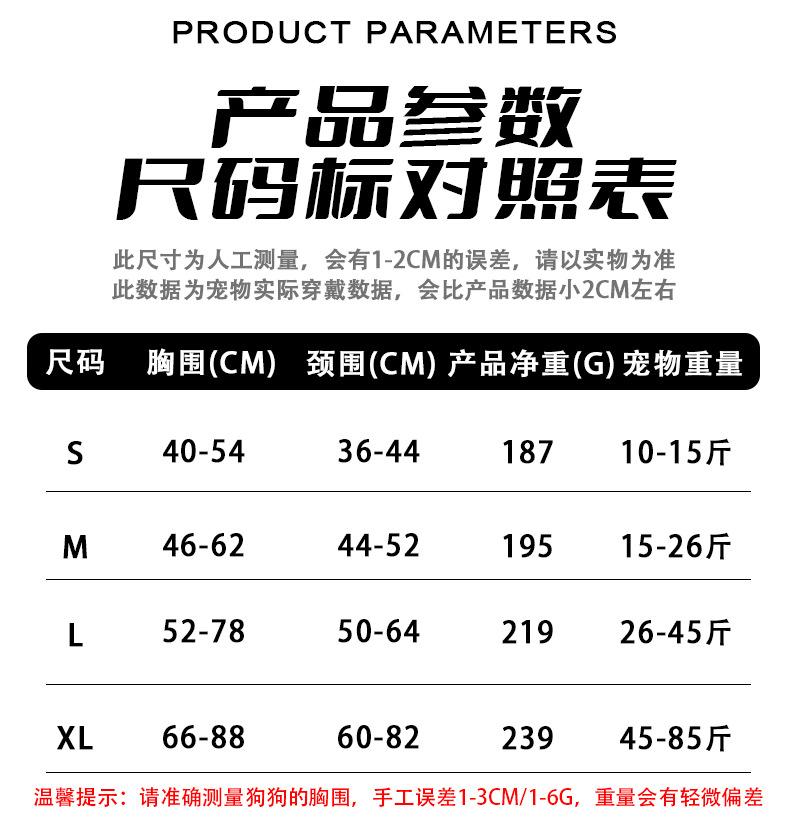 S (5.00 kg-7.50 kg, M (7.50 kg-13.00 kg, L (13.00 kg-22.50 kg, XL (22.50 kg-42.50 kg