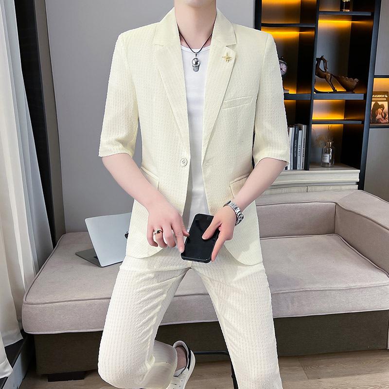 Conjunto de Terno Slim Respirável de Manga Média Estilo Coreano 2025 com Calça 9/8 Conjunto de Duas Peças para Homens Versátil Peça Única Drop Shipping