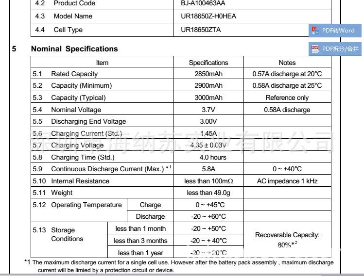 Padrão de carga e descarga: mais de 1000 vezes, tensão de corte de carga 4,35 V, tensão de corte de descarga 2,75 V