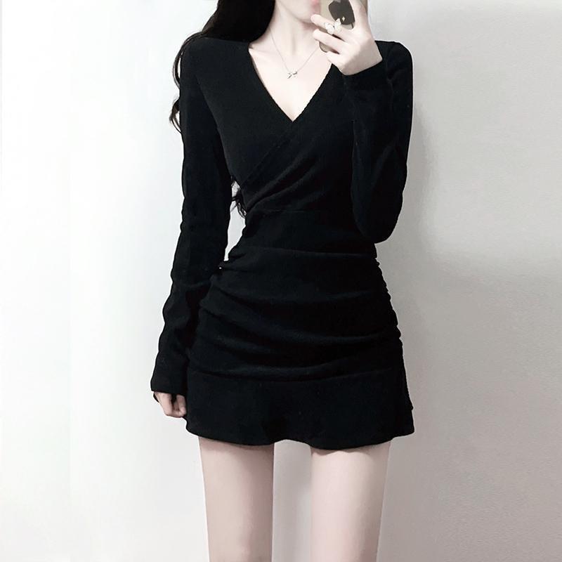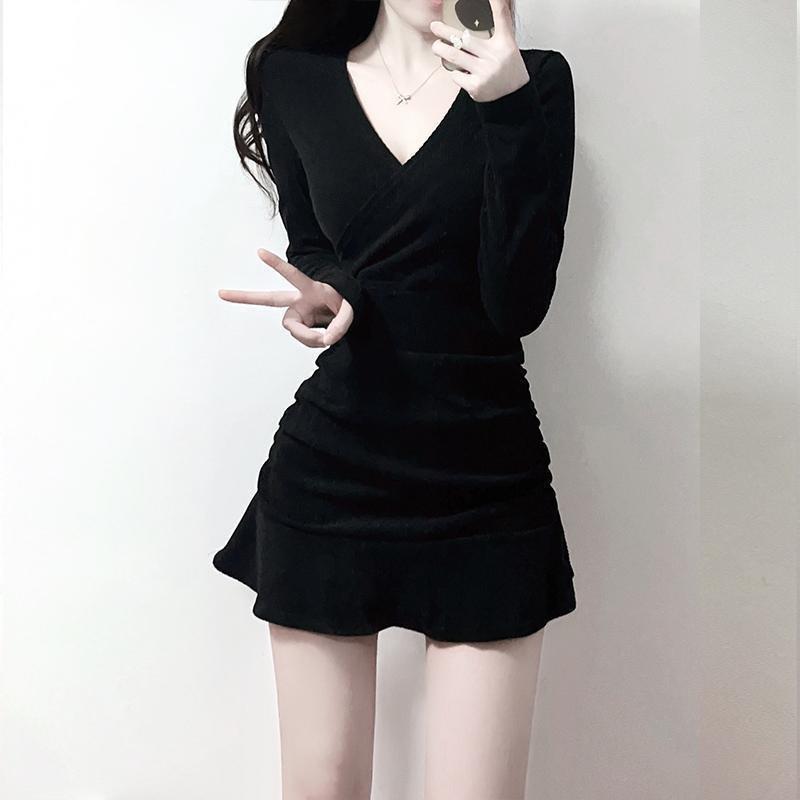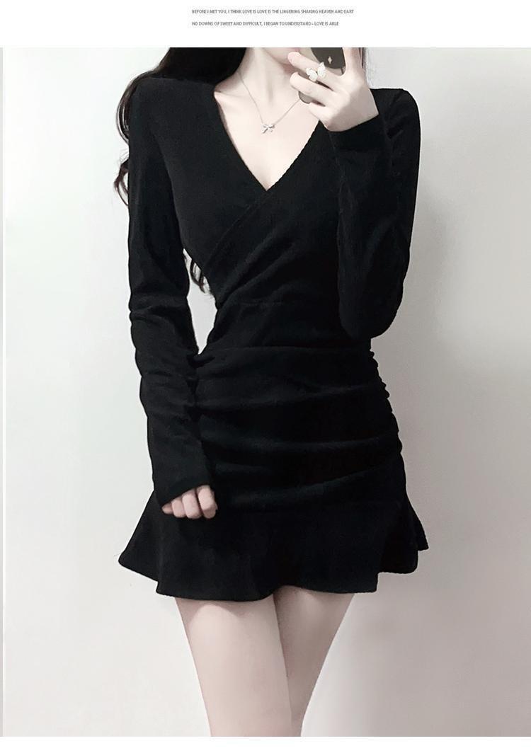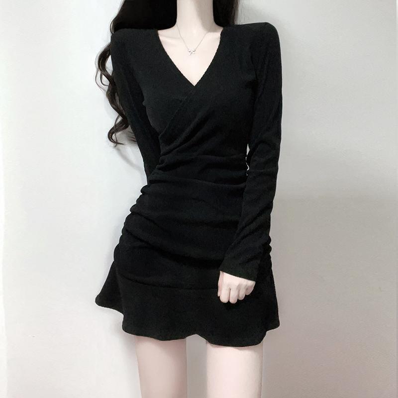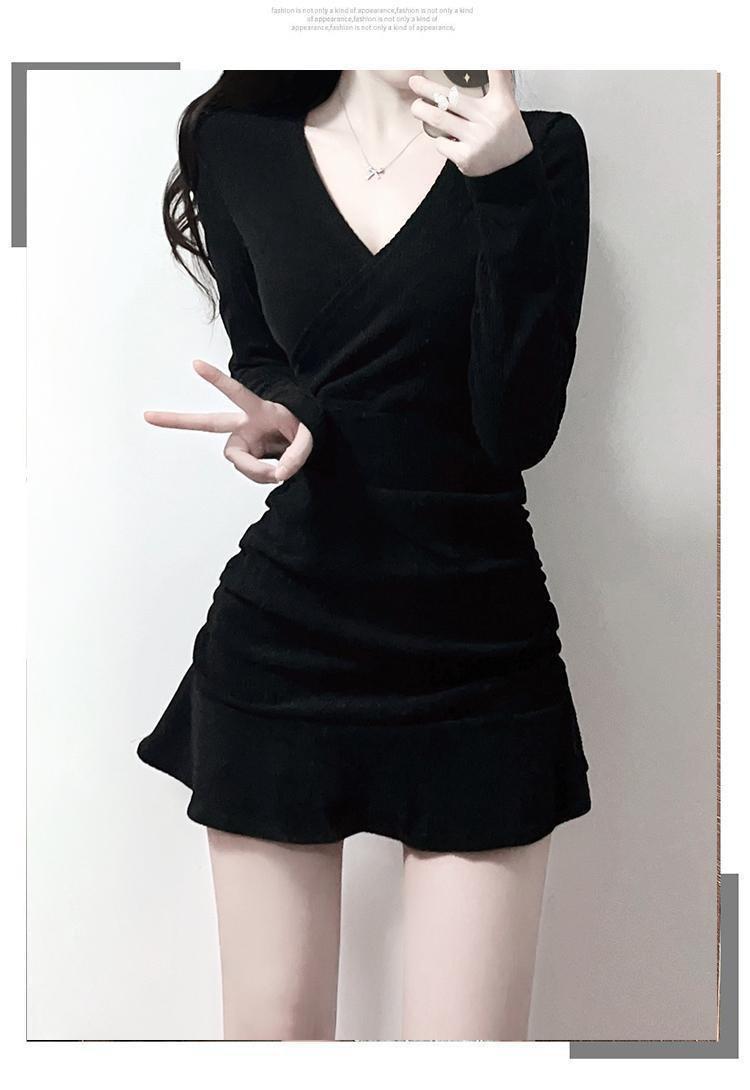 Compre 2024 outono e inverno novo puro decote em V pequeno vestido preto feminino garota gostosa cintura babados saia rabo de peixe vestido justo maré no atacado no Joom.pro