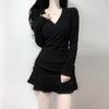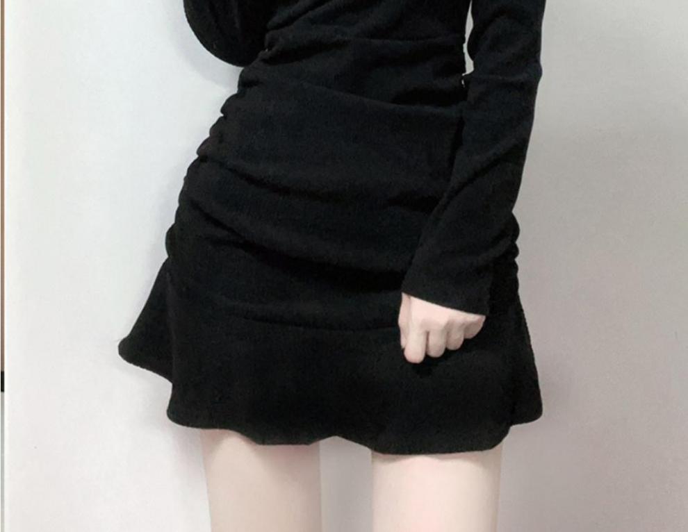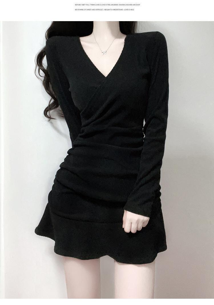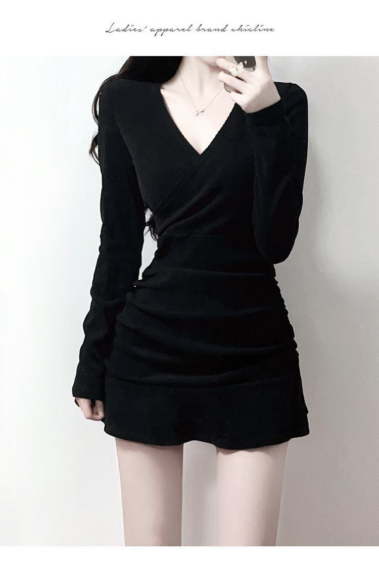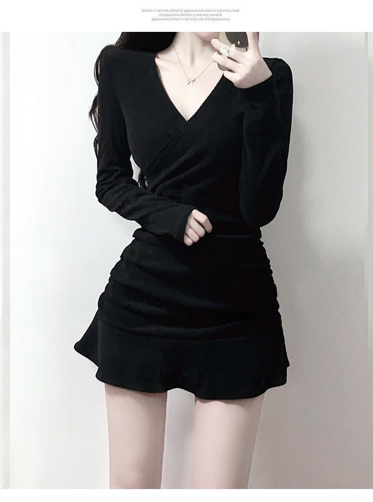 Compre 2024 outono e inverno novo puro decote em V pequeno vestido preto feminino garota gostosa cintura babados saia rabo de peixe vestido justo maré no atacado no Joom.pro