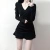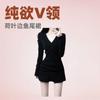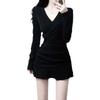 2024 outono e inverno novo puro decote em V pequeno vestido preto feminino garota gostosa cintura babados saia rabo de peixe vestido justo maré