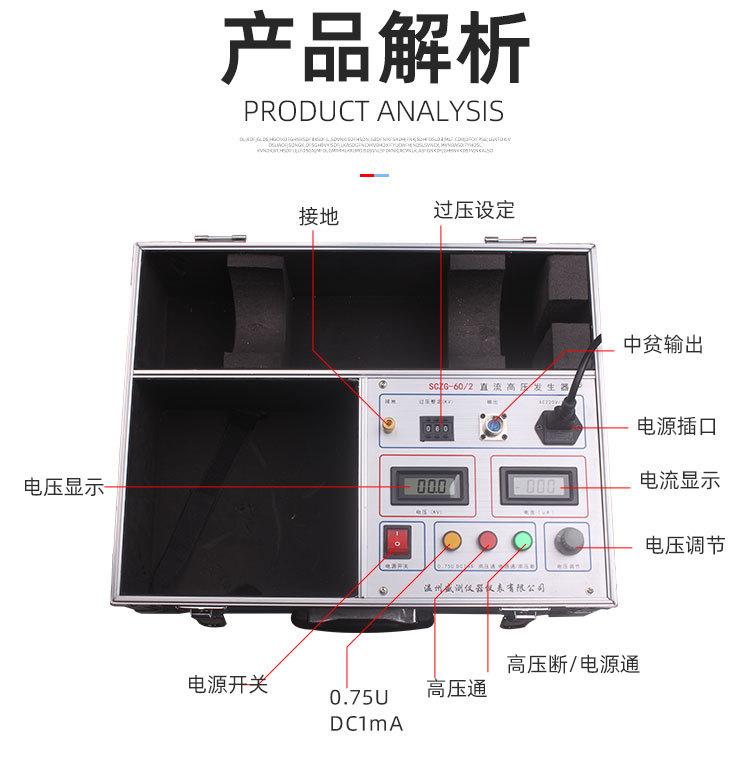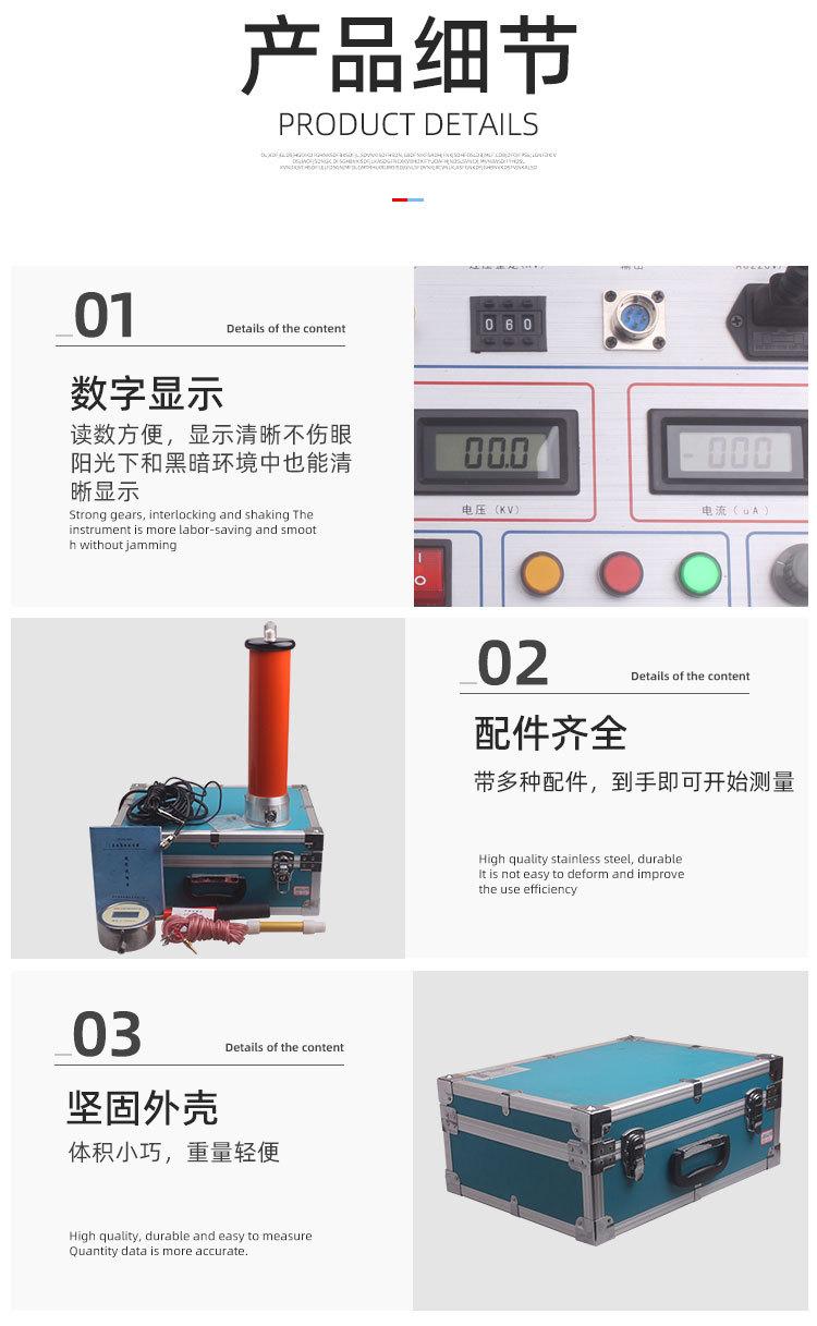 4. Alta precisão e medição precisa. Os medidores de tensão e corrente são exibidos digitalmente, com resolução de tensão de 0,1kV e resolução de corrente de 1uA. O medidor de tensão na caixa de controle exibe diretamente o valor da tensão aplicada à peça de teste de carga. Nenhum divisor de tensão externo é necessário durante o uso e a fiação é simples. O instrumento possui extremidades de alta e baixa tensão para medir a corrente de fuga. A extremidade de alta tensão usa um display de medidor digital circular blindado, não tem medo de choque de descarga, tem bom desempenho anti-interferência e é adequada para uso no local.