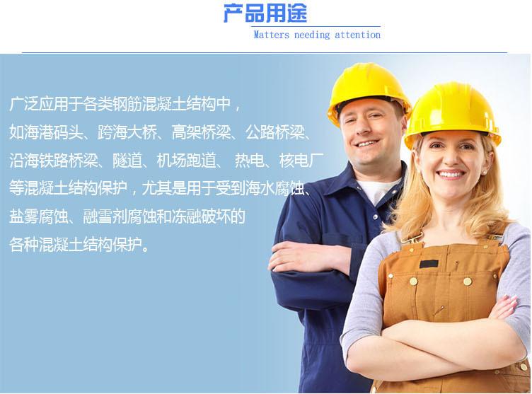 O agente protetor atua como uma camada protetora para concreto, protegendo as barras de aço internas da corrosão. Ele tem boa resistência a ácidos e álcalis e resistência à corrosão. Ele pode resistir ao impacto de mudanças de temperatura no concreto. Após a construção, sua vida útil é basicamente a mesma da estrutura de concreto.
